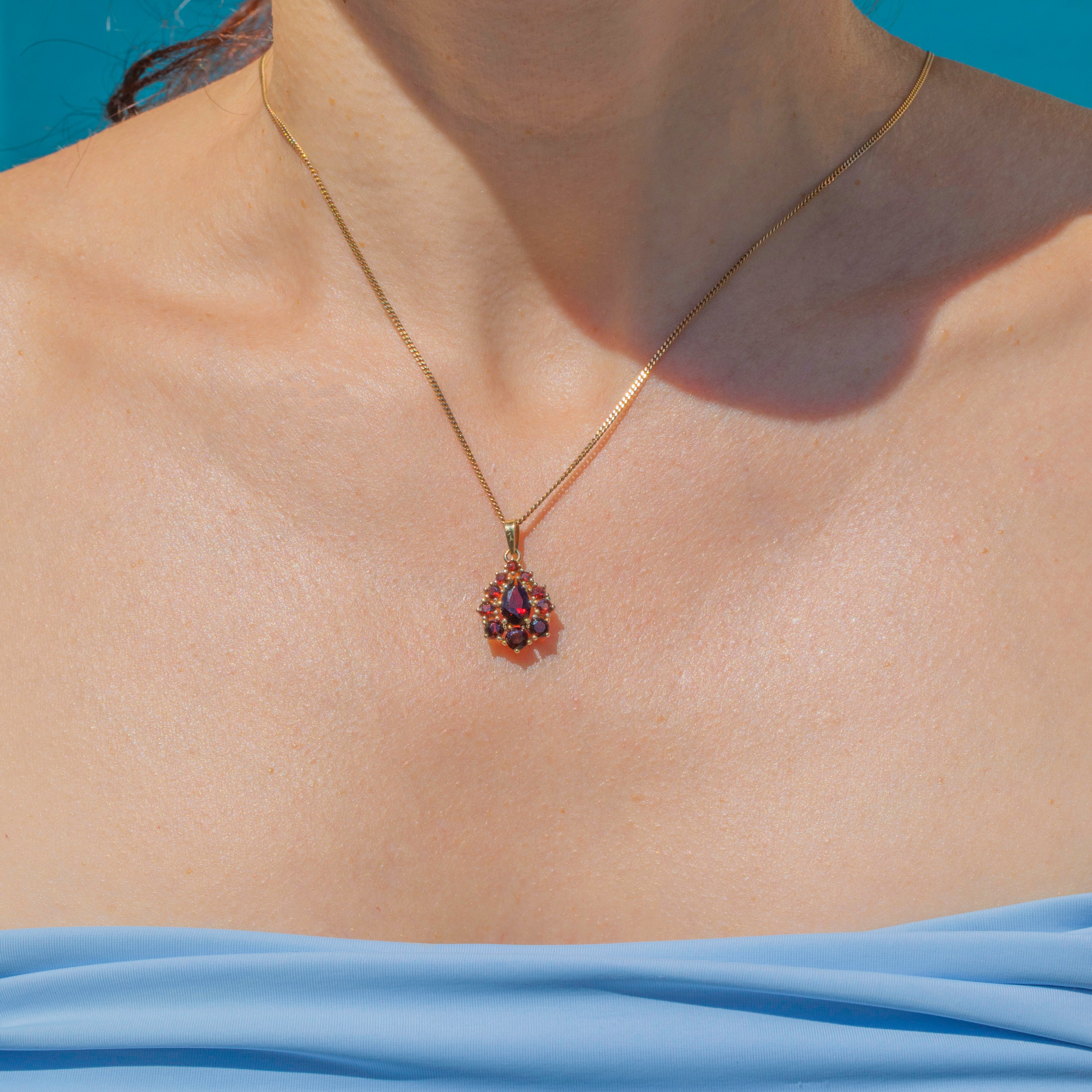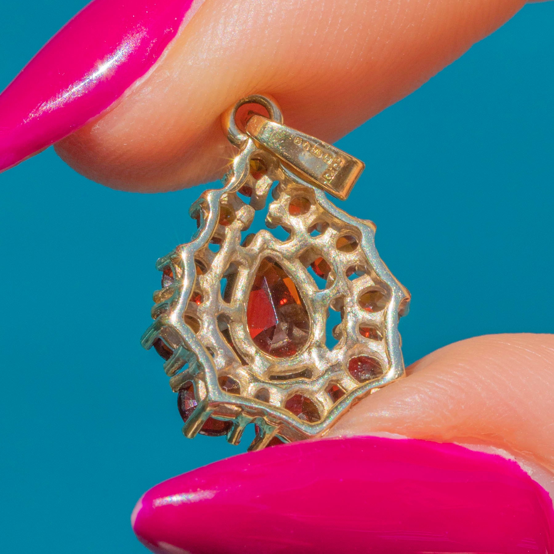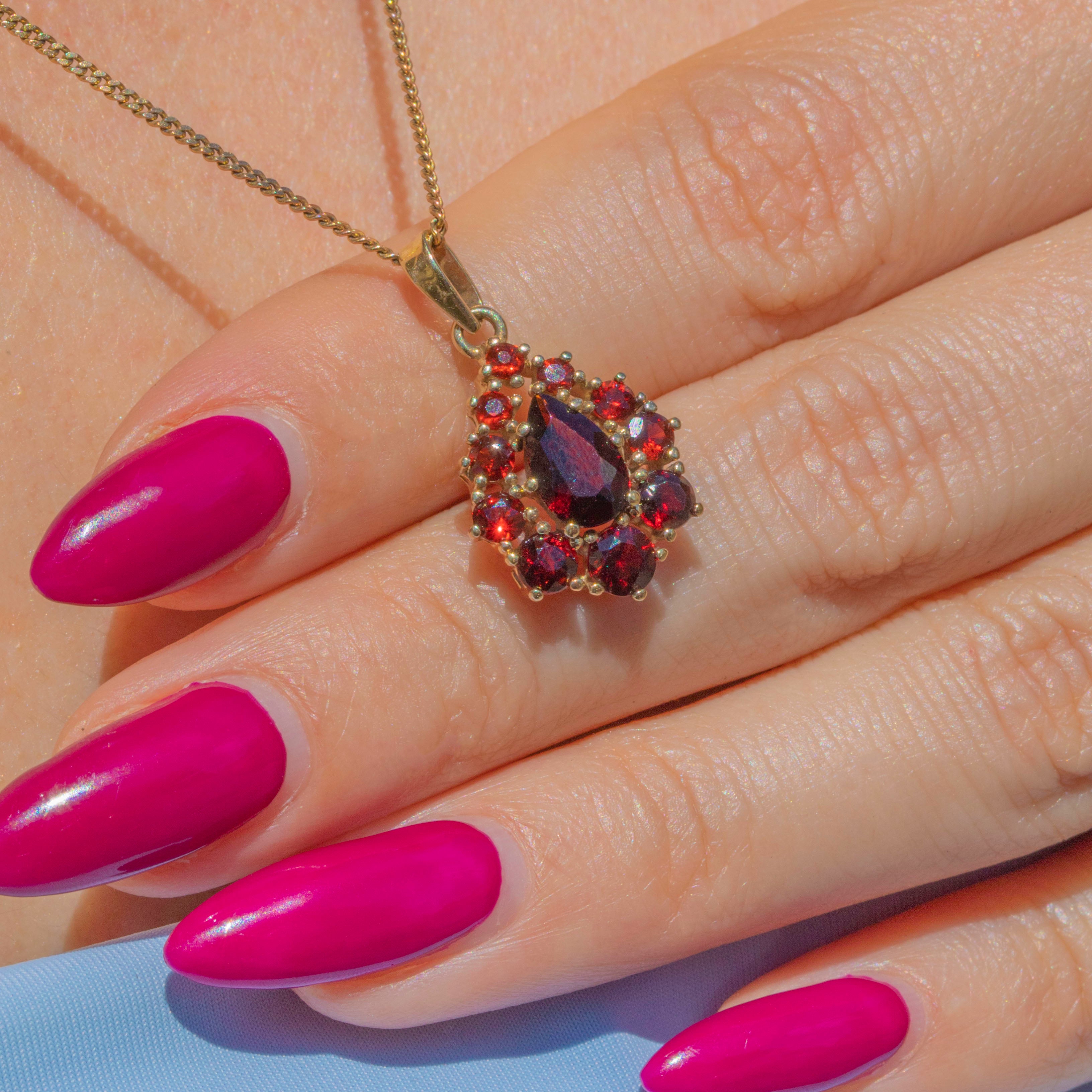 Displaying dazzling Garnets, weighing 2.25ct combined, each arranged into a pear-shaped cluster motif, this vintage charm is vibrant and elegant.