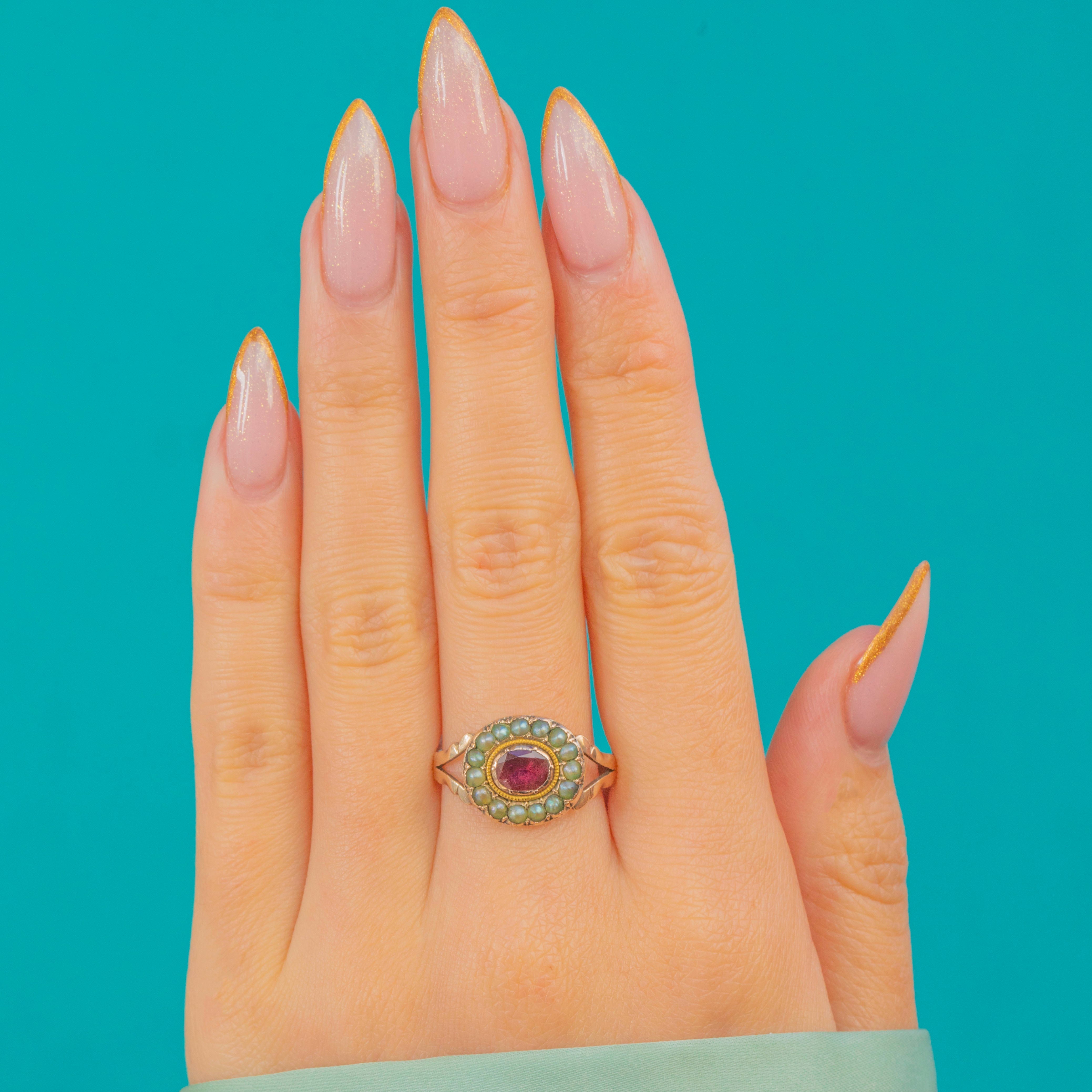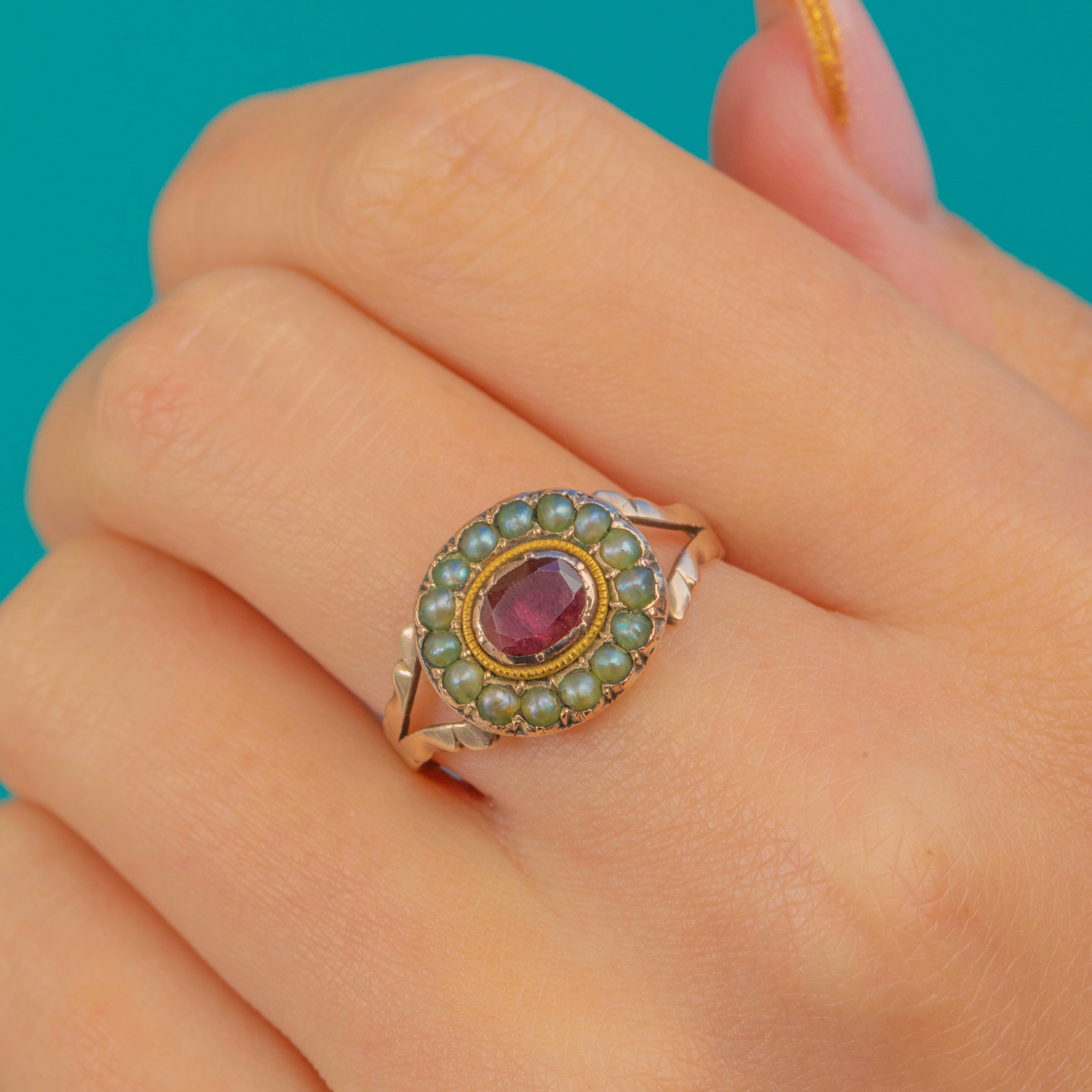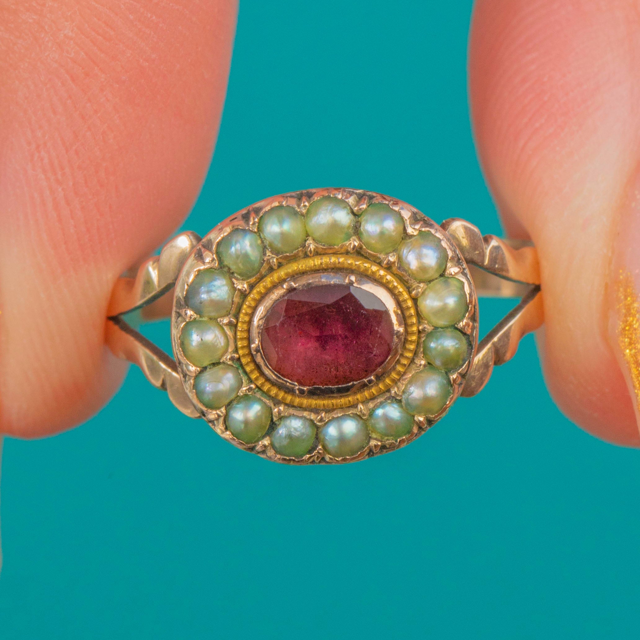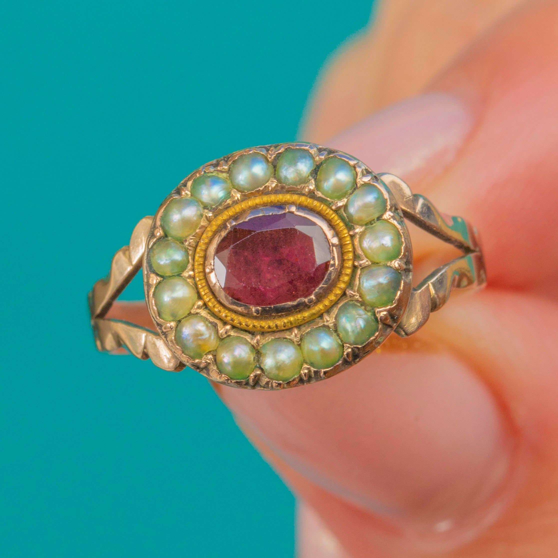 This charming Georgian flat-cut Garnet and Pearl cluster ring dates to circa 1820 and has all the romance of the Regency era. A rich, deep red flat-cut Garnet sits at the centre, surrounded by a delicate halo of Pearls for a pretty, almost floral effect on the finger. The Garnet is estimated at approximately 0.35ct, giving the ring a lovely glowing focal point.
