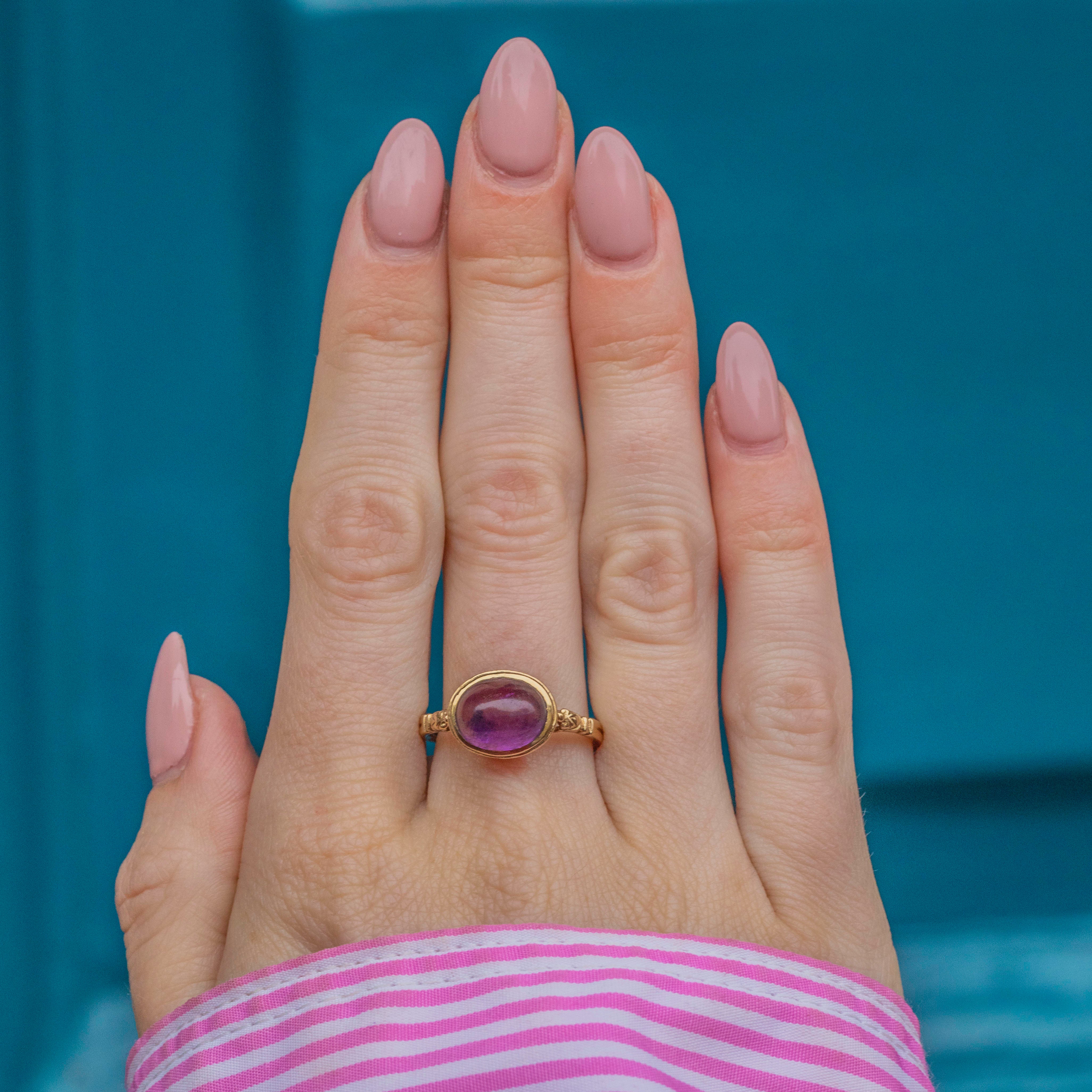 This 9ct Gold Georgian style Amethyst cabochon ring takes heavy inspiration from the 18th century. Flaunting a smoothly cut foiled 2.55ct Amethyst cabochon, this vintage Amethyst ring emits a violet glow with flashes of lilac.