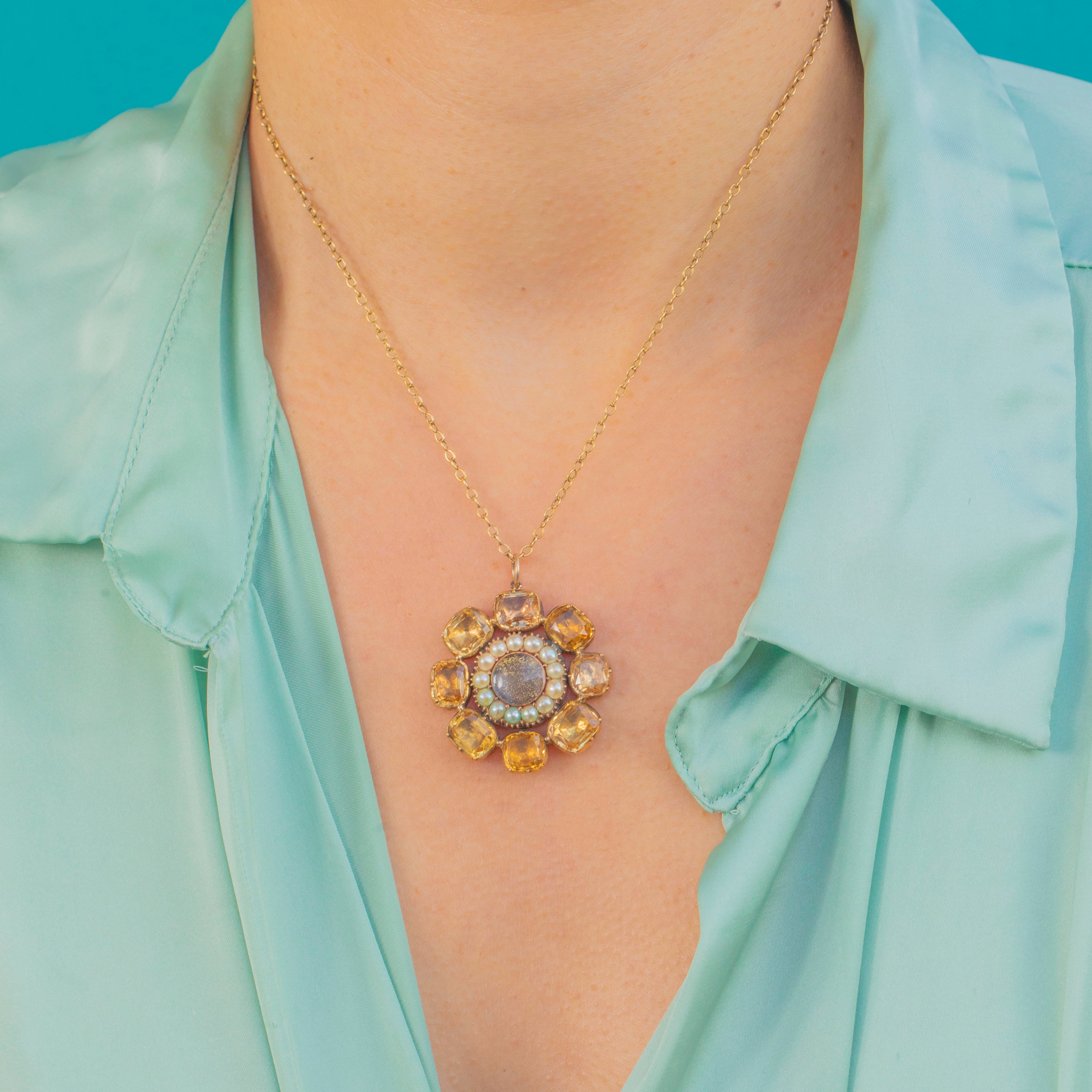 A magnificent late Georgian cluster pendant set with richly coloured foiled Imperial Topaz and luminous Natural Pearls. The honeyed glow of the foiled Topaz paired with the soft lustre of the Pearls creates that quintessential early 19th-century romance, opulent, feminine, and utterly breathtaking on the neckline.