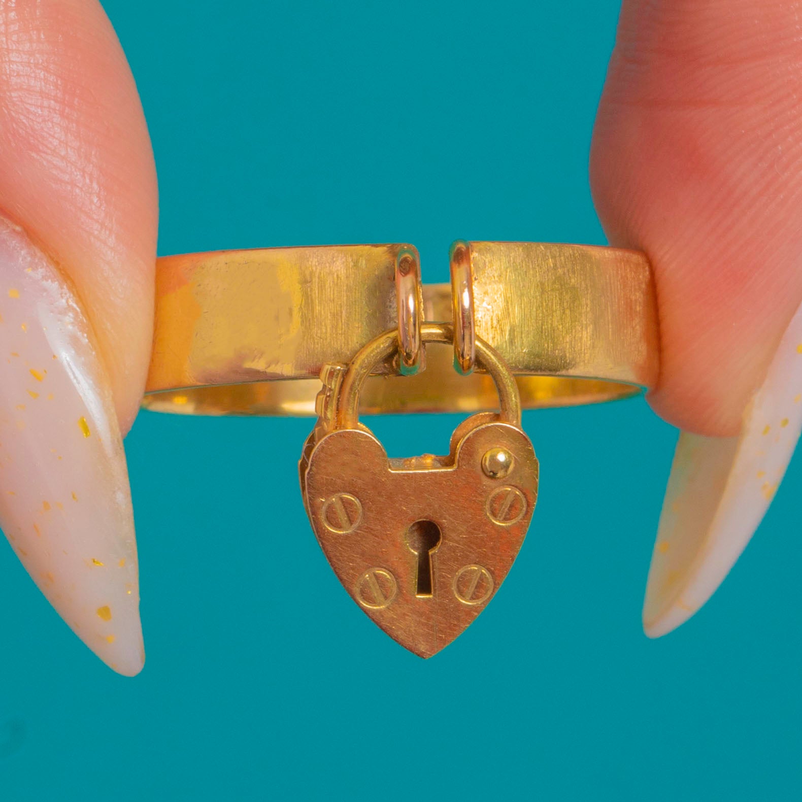 Sweet, symbolic and wonderfully wearable, this 9ct Gold heart padlock ring captures the language of love in a sleek, everyday silhouette. The polished flat band is adorned with a dainty articulated heart, detailed with a tiny keyhole and neat rivet motifs for that authentic love‑token charm.