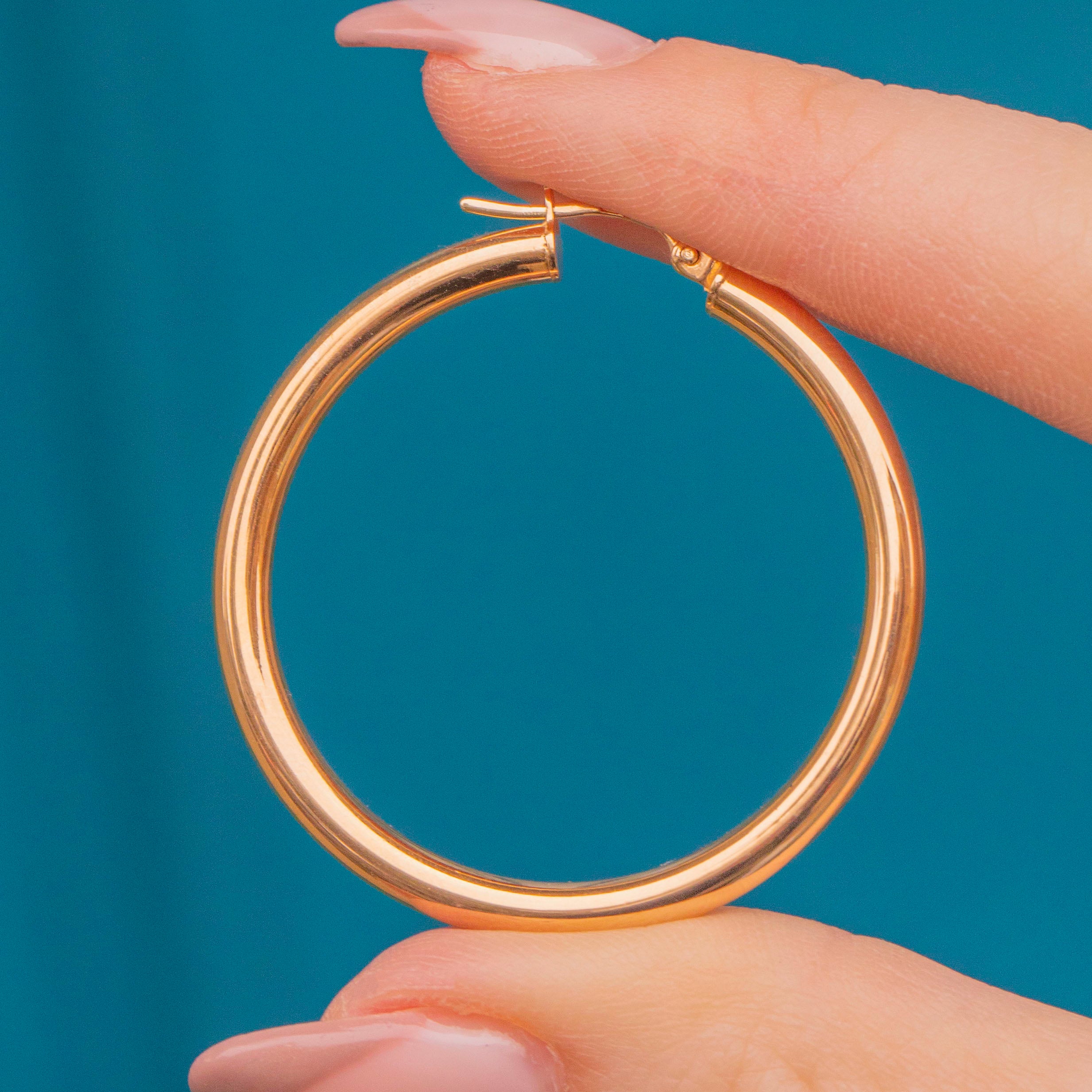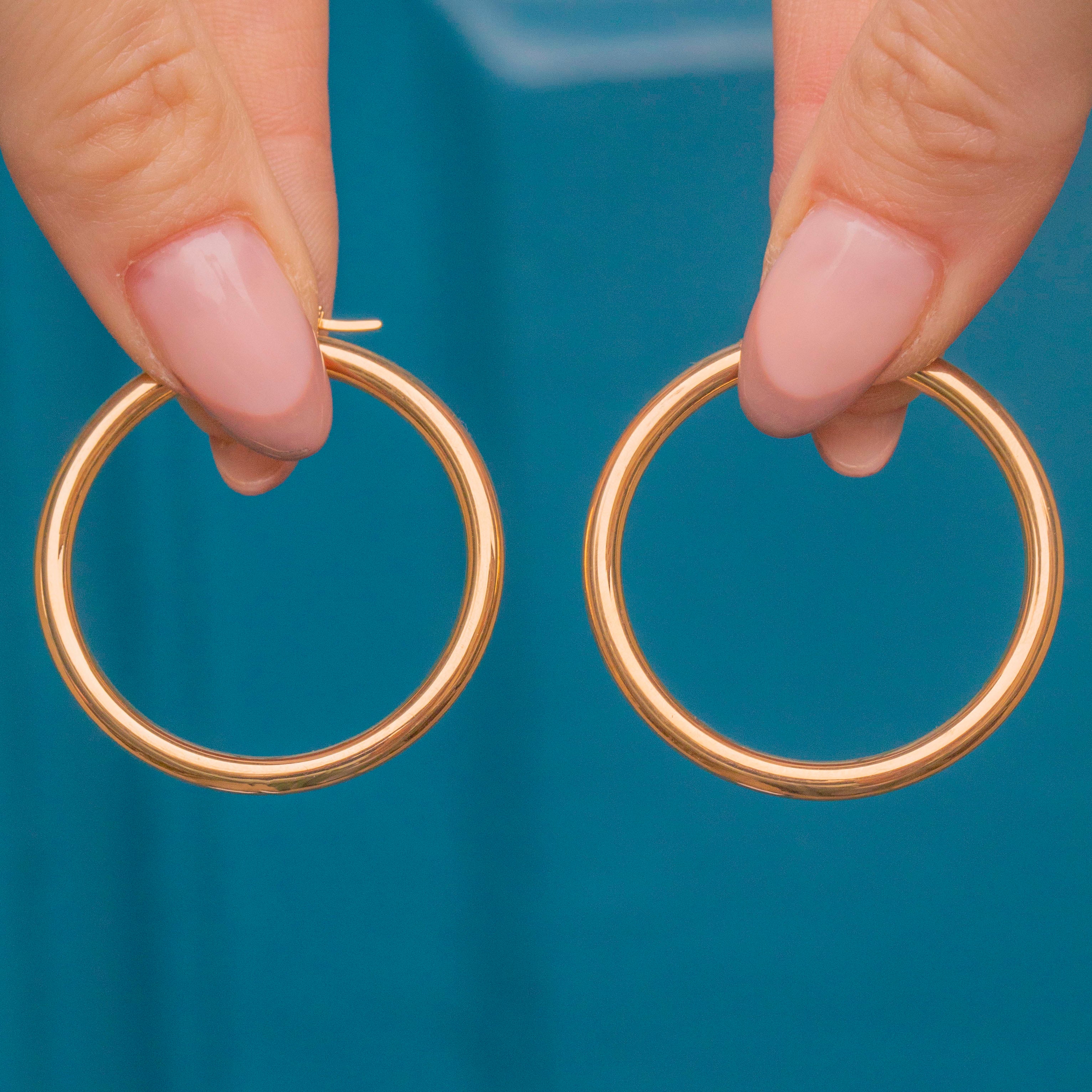 EXCELLENT. These 9ct Gold hoop earrings are in excellent condition. The Gold is glossy and the hoop forms are perfectly preserved, free from dings or scuffs. With the hinged snap-backs providing comfortable and secure wear, you can enjoy these vintage Gold hoops confidently!