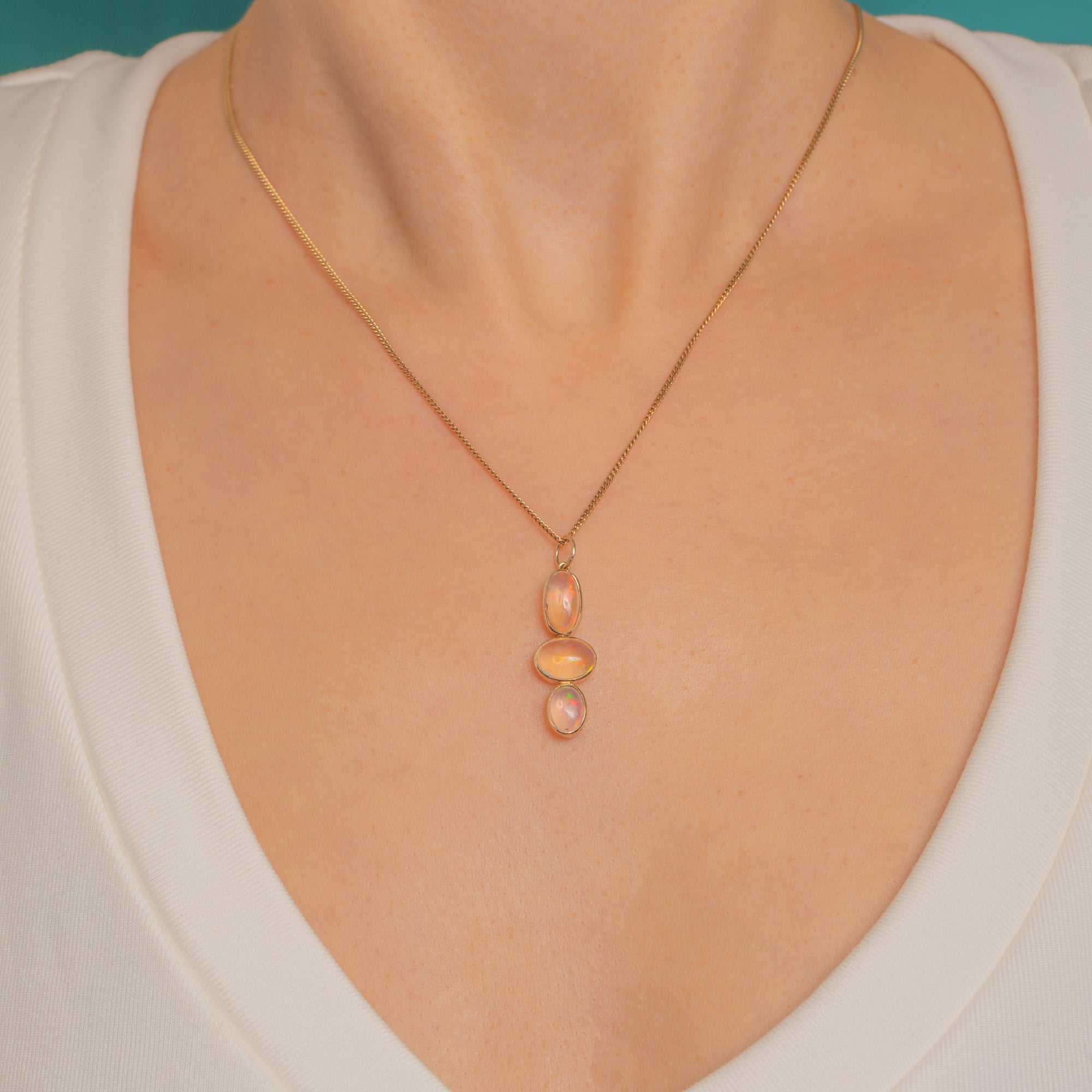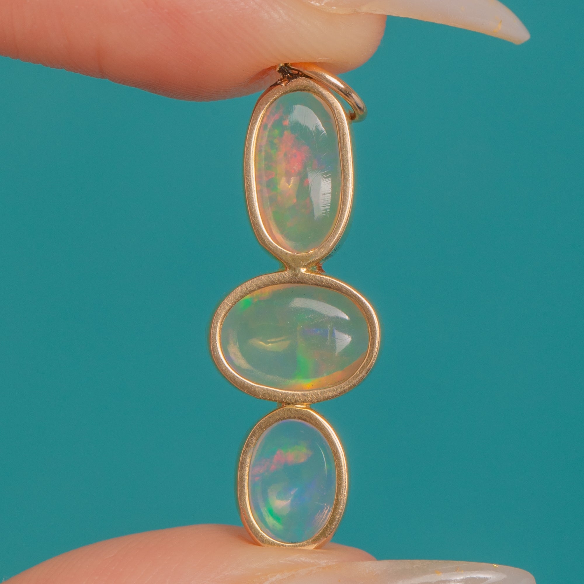 A luminous trio of Jelly Opals cascades in a refined vertical drop, each cabochon alive with vibrant play-of-colour—flashes of green, orange, red, yellow and blue shimmering across their milky translucence. Sleek rub-over bezels in warm 9ct Gold frame the stones, creating a graceful silhoutte.