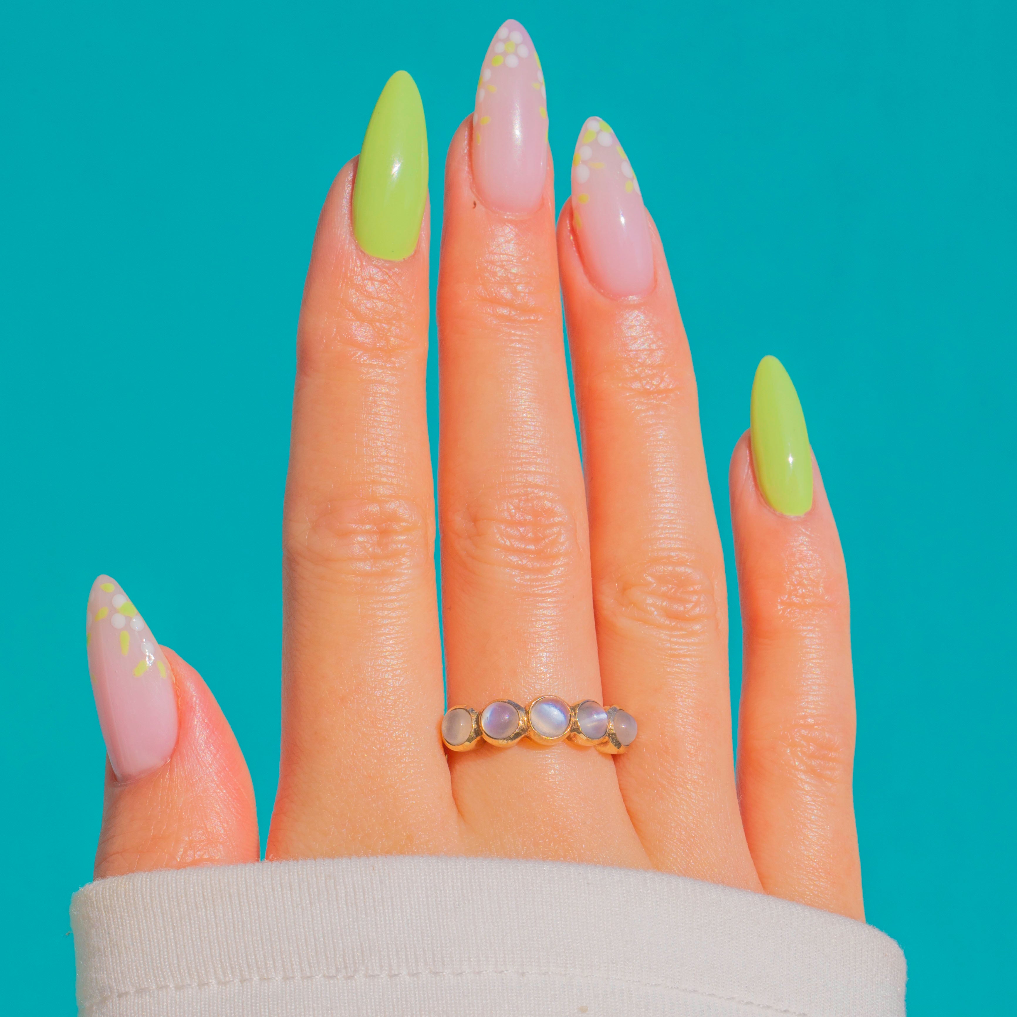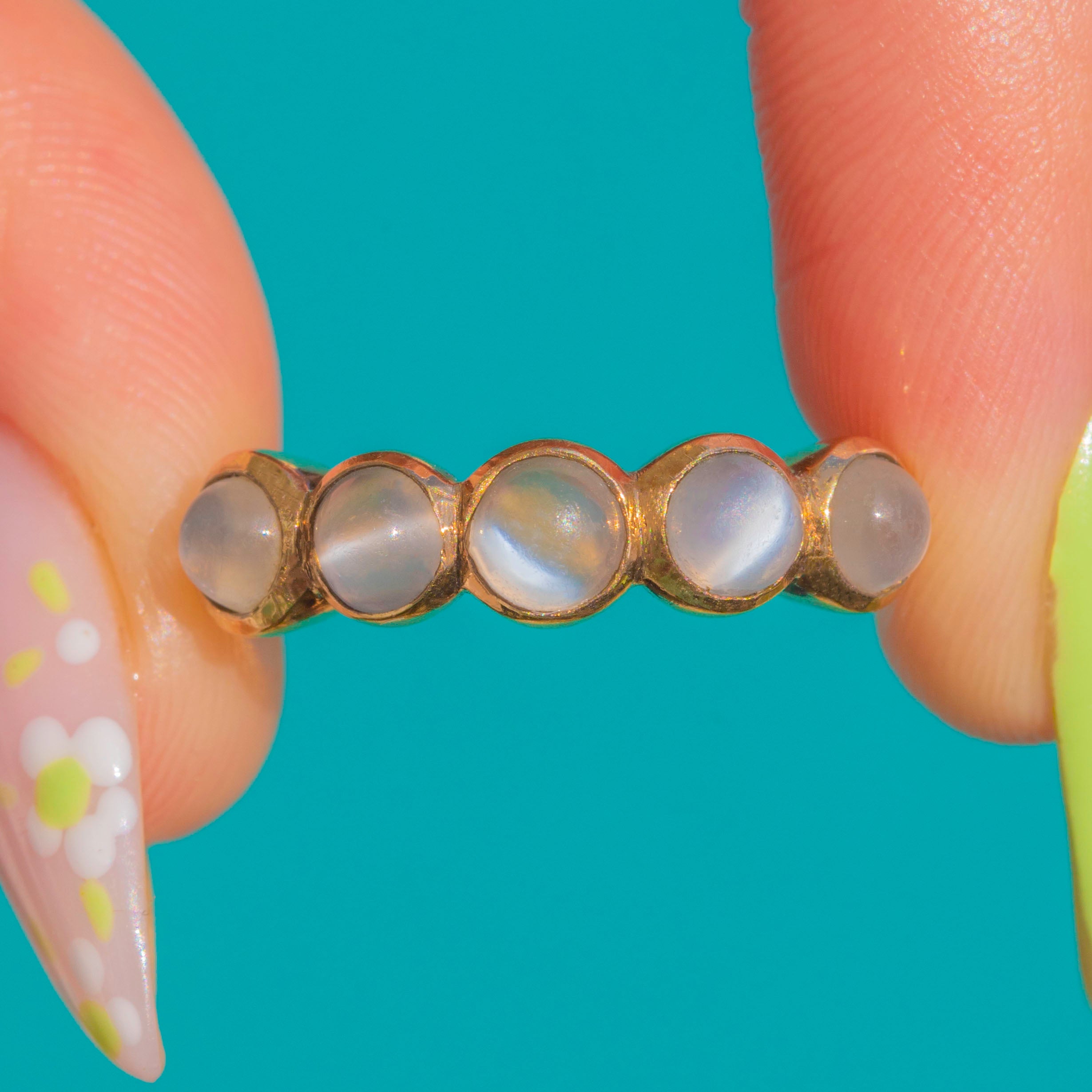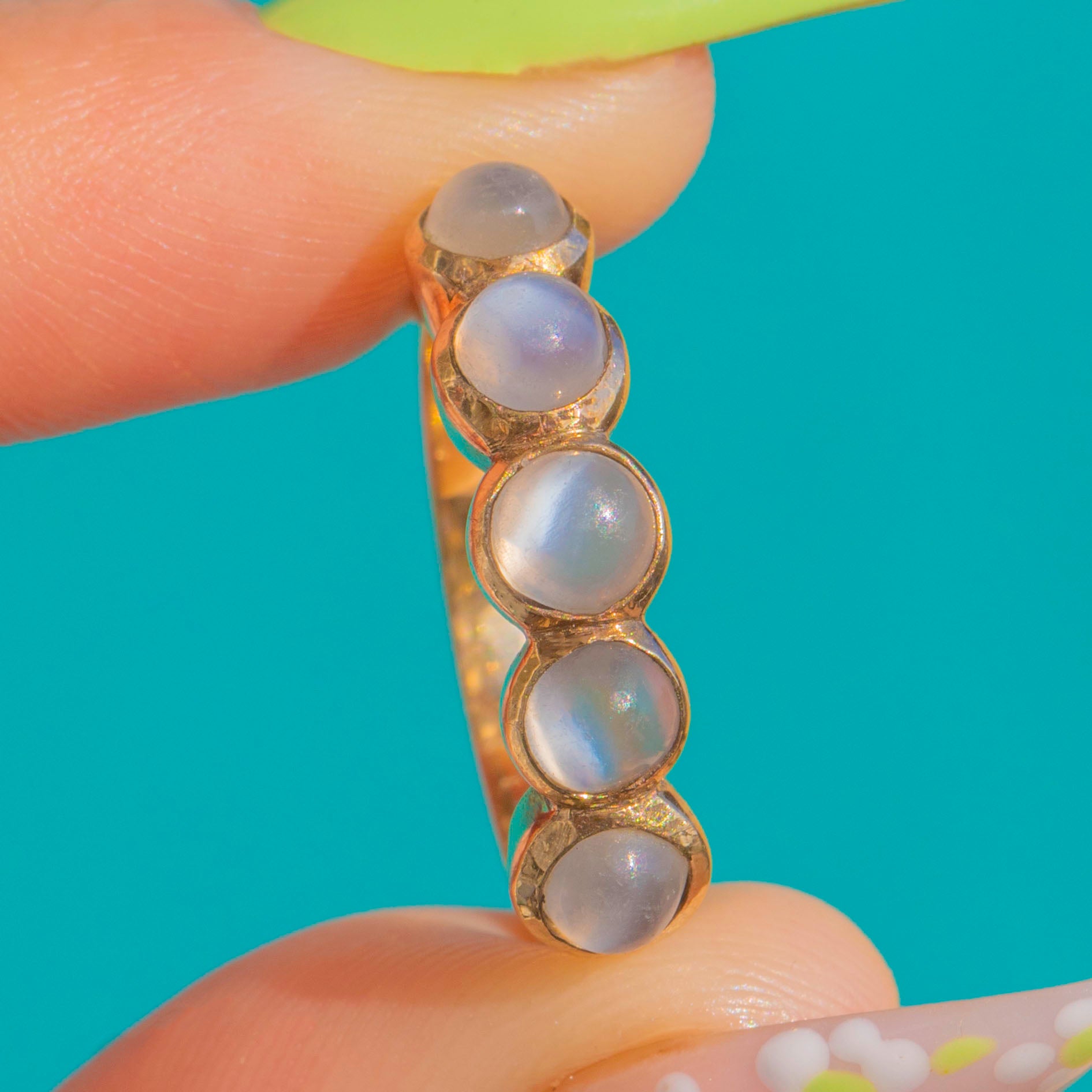 Hallmarked in Birmingham in 1984, this five-stone beauty offers 1.00ct of luminous Moonstone that dances with light. Elegant alone and equally lovely in a stack, it brings a whisper of celestial shimmer to every day.