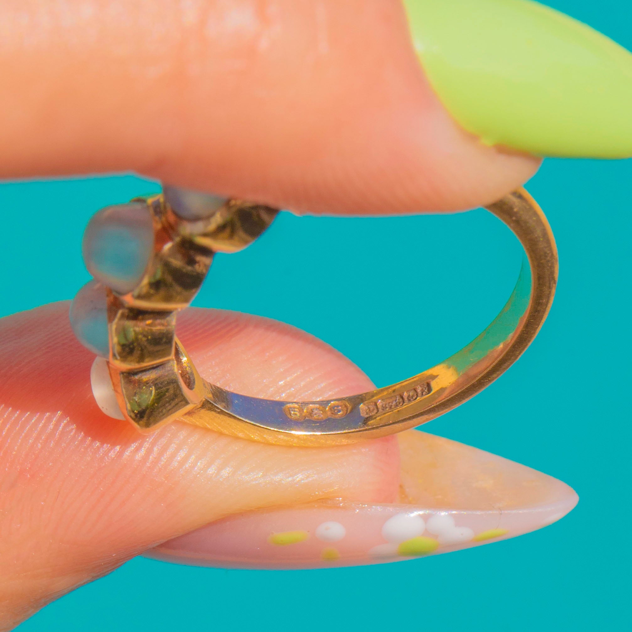 Glimmering with that signature billowing blue glow, this Vintage 9ct Gold ring showcases a graceful row of five Moonstone cabochons in classic raised bezel settings. The slim, polished band and softly domed stones create a sleek, linear silhouette with timeless allure.