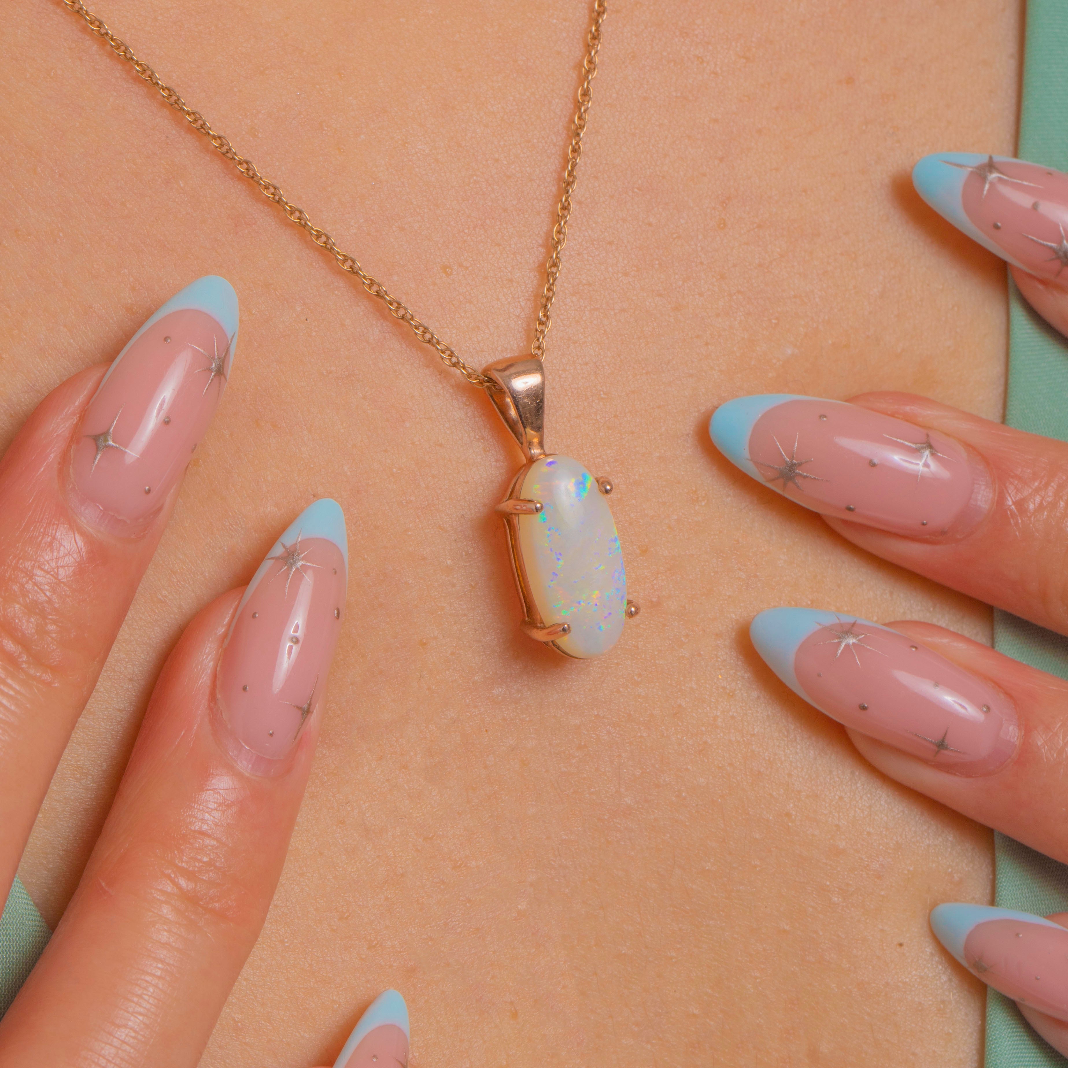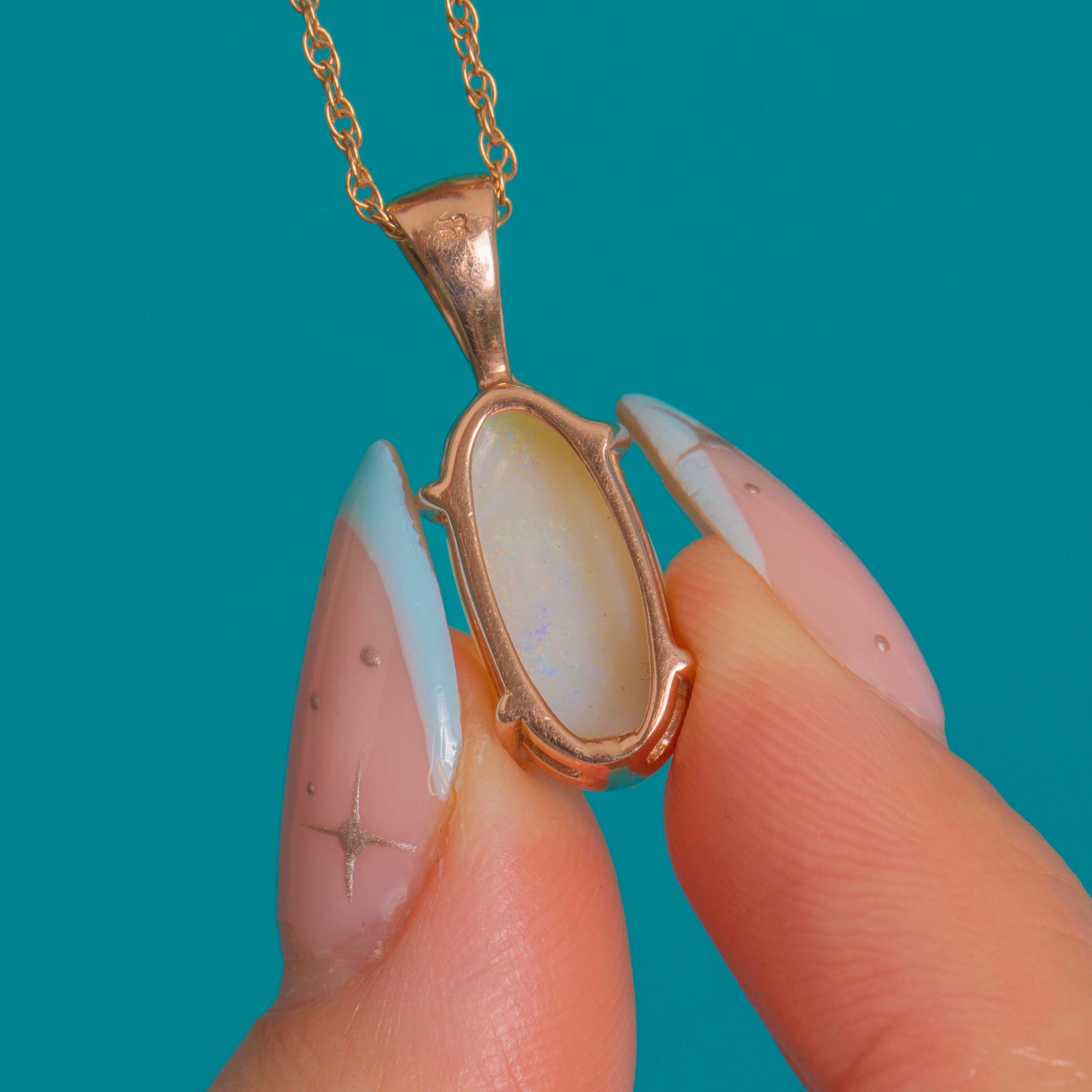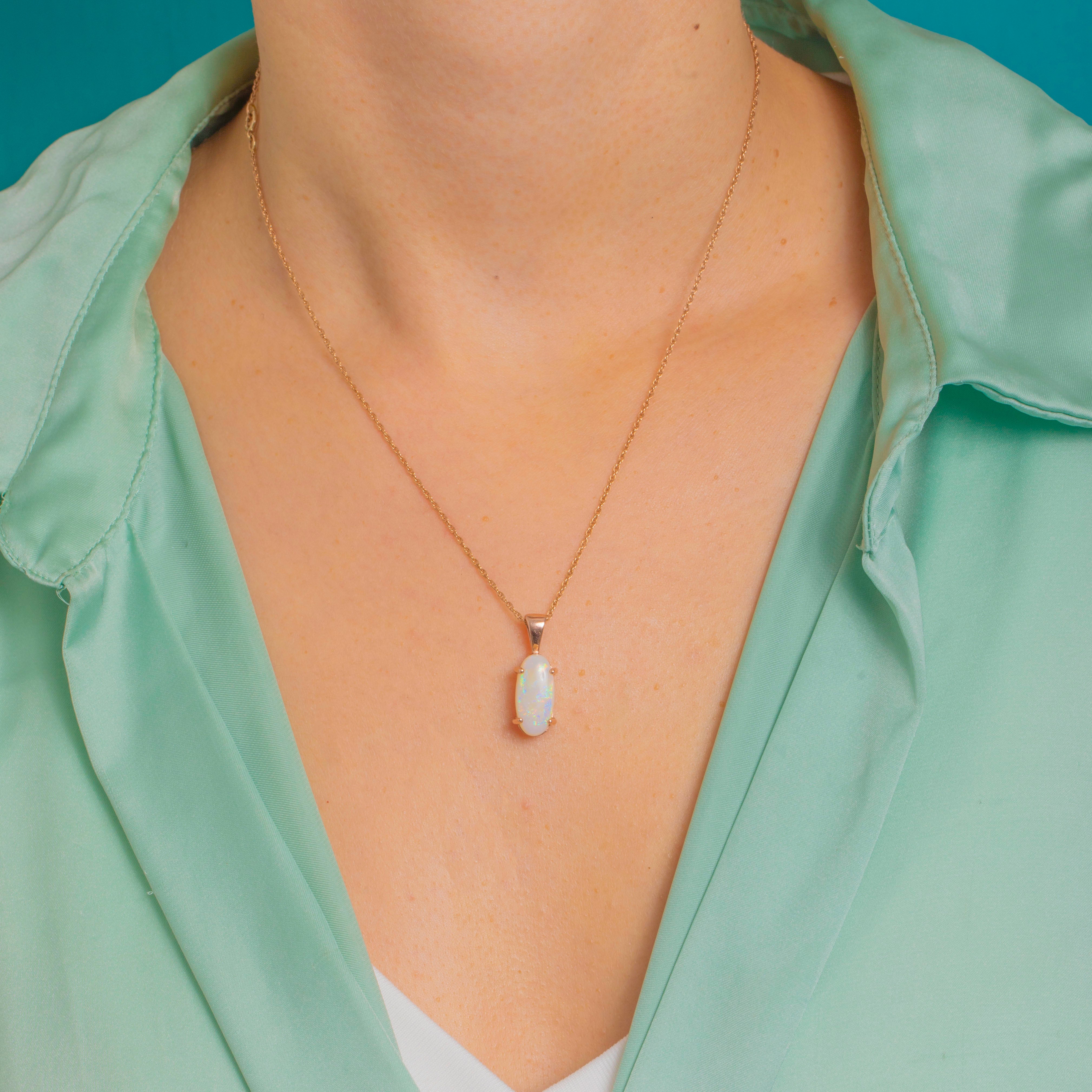 A luminous Opal cabochon shimmers with blue‑green play‑of‑colour and flashes of yellow, orange and pink in this elegant 9ct Gold pendant. The elongated oval stone is cradled in a refined four‑claw setting with open sides and a smooth tapered bail, creating a clean silhouette that lets the Opal take centre stage.