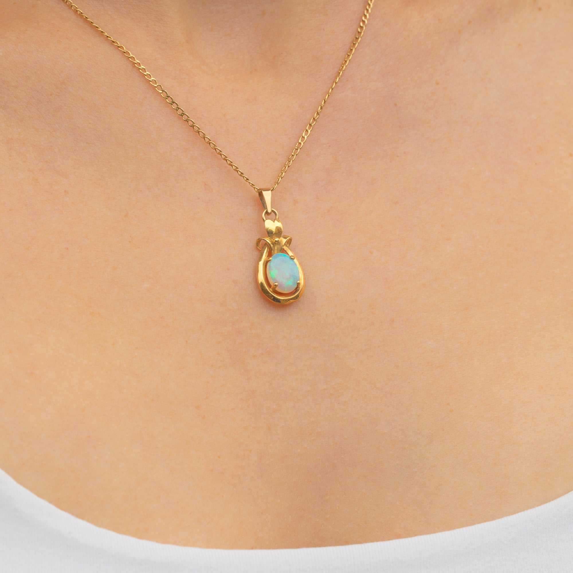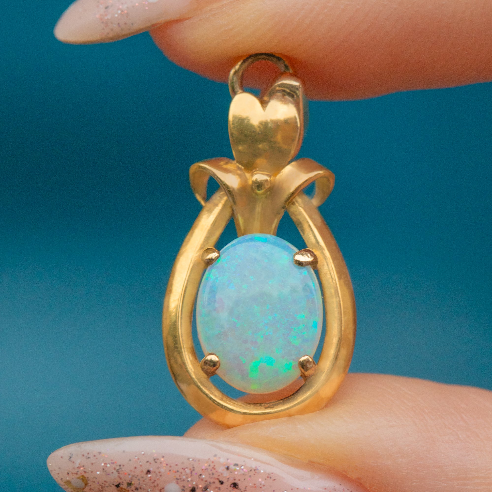 This 9ct Gold natural solid Opal pendant is the magical piece your jewellery collection has been missing! An ethereal milky 0.70ct natural Opal is snug within her buttery 9ct Gold setting, exhibiting electric shimmers in the light.