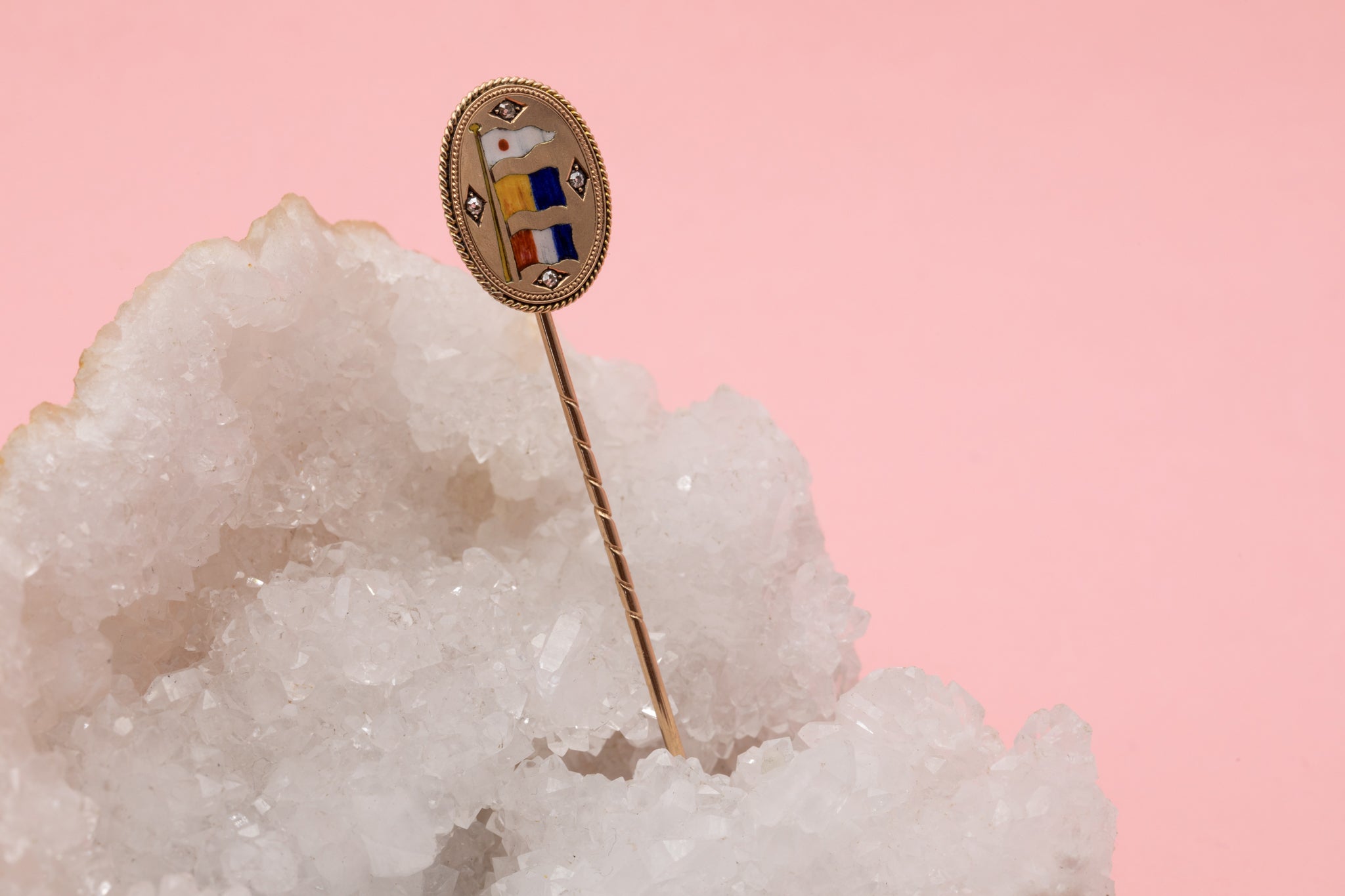This is a charming 9ct Gold nautical flag stick pin! This piece is highly collectible, paying homage to maritime history in a fashionable way.