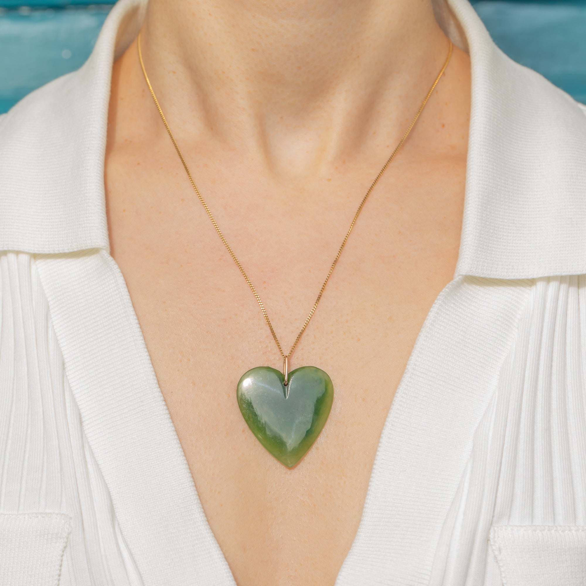 This sweet 9ct Gold Nephrite Jade heart pendant will make a fabulous addition to your jewellery collection! This mid-century delight displays a Nephrite Jade carved into a gorgeously smooth, heart shape and is suspended from a bright 9ct Gold bale.