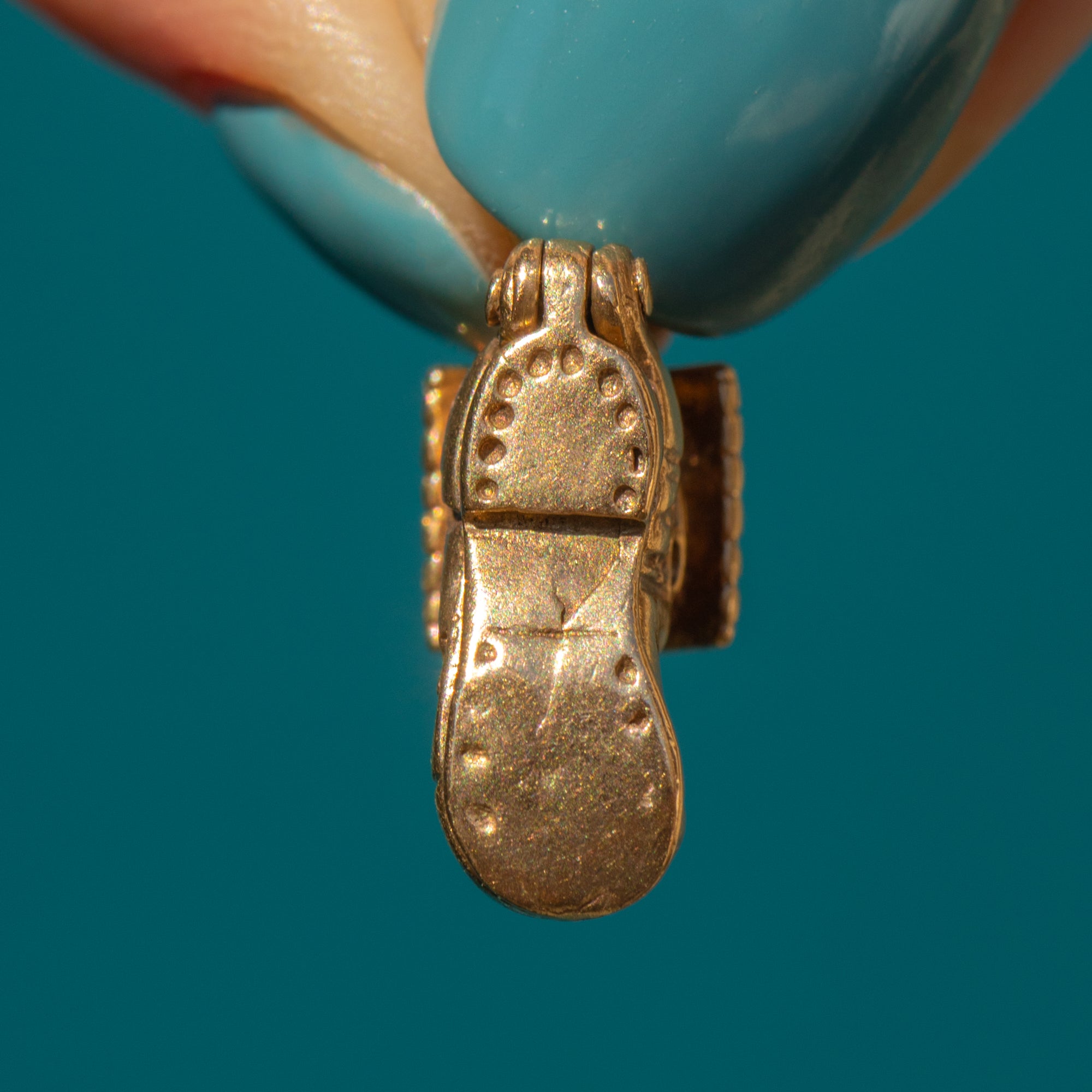 EXCELLENT. This 9ct Gold Old Woman Who Lived in a Shoe charm is in fabulous condition. The 9ct Gold is rich and buttery throughout, and we adore the intricate detailing down to the little golden figures on the inside of the shoe. Every collection deserves a vintage novelty pendant!