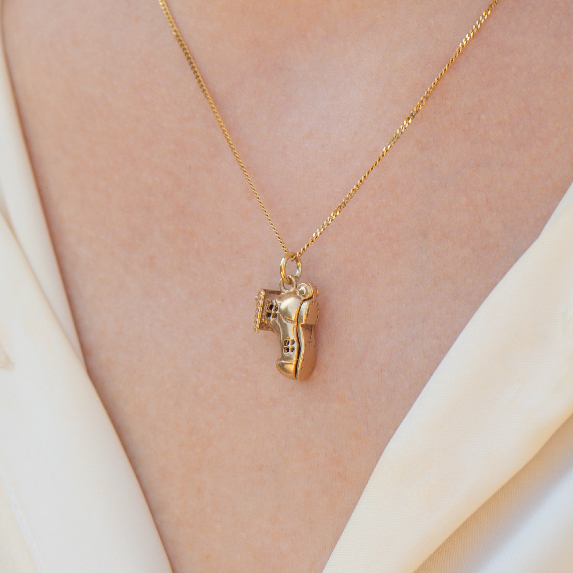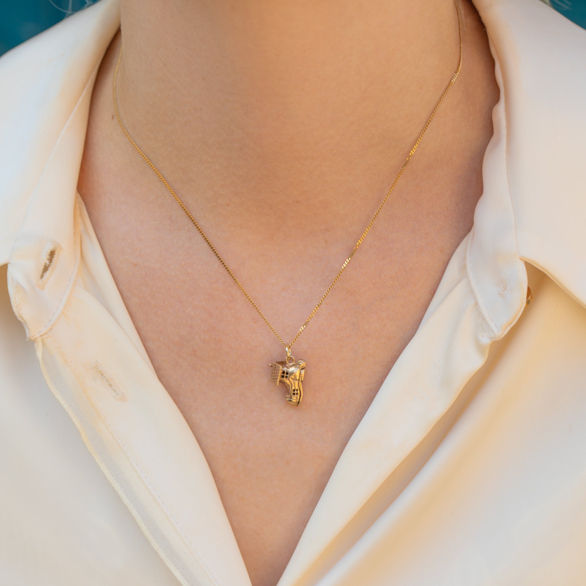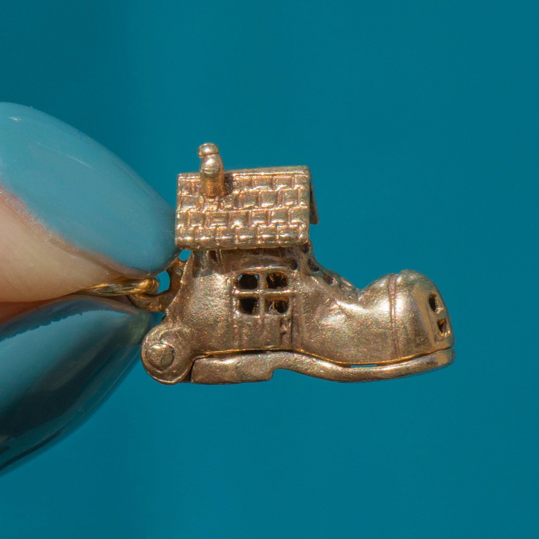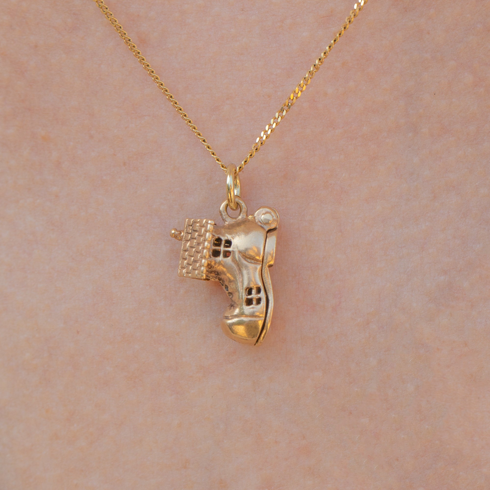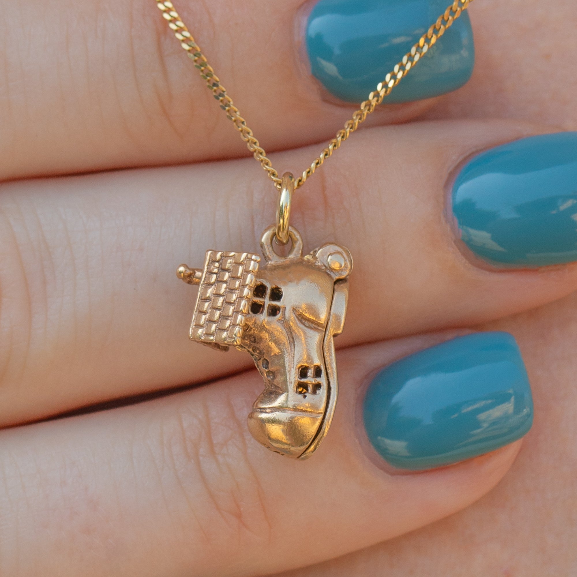 This 9ct Gold Old Woman Who Lived in a Shoe charm will transport you straight back to your childhood days! This dainty vintage pendant is based on the nostalgic nursery rhyme "The Old Woman Who Lived in a Shoe"! The shoe is crafted from 9ct Gold and boasts many sweet features, from the engravings on the roof and sole to the intricate cut-out windows.