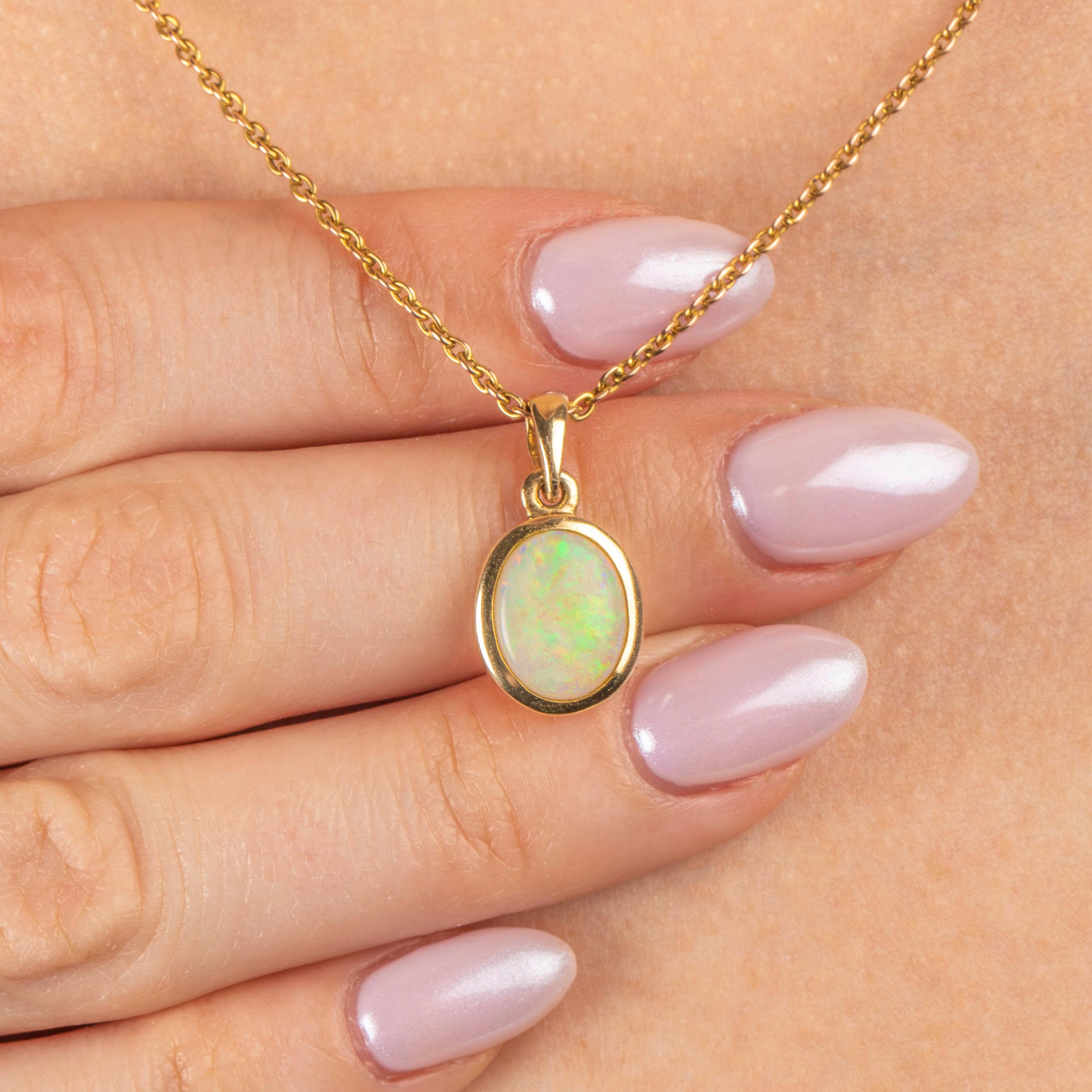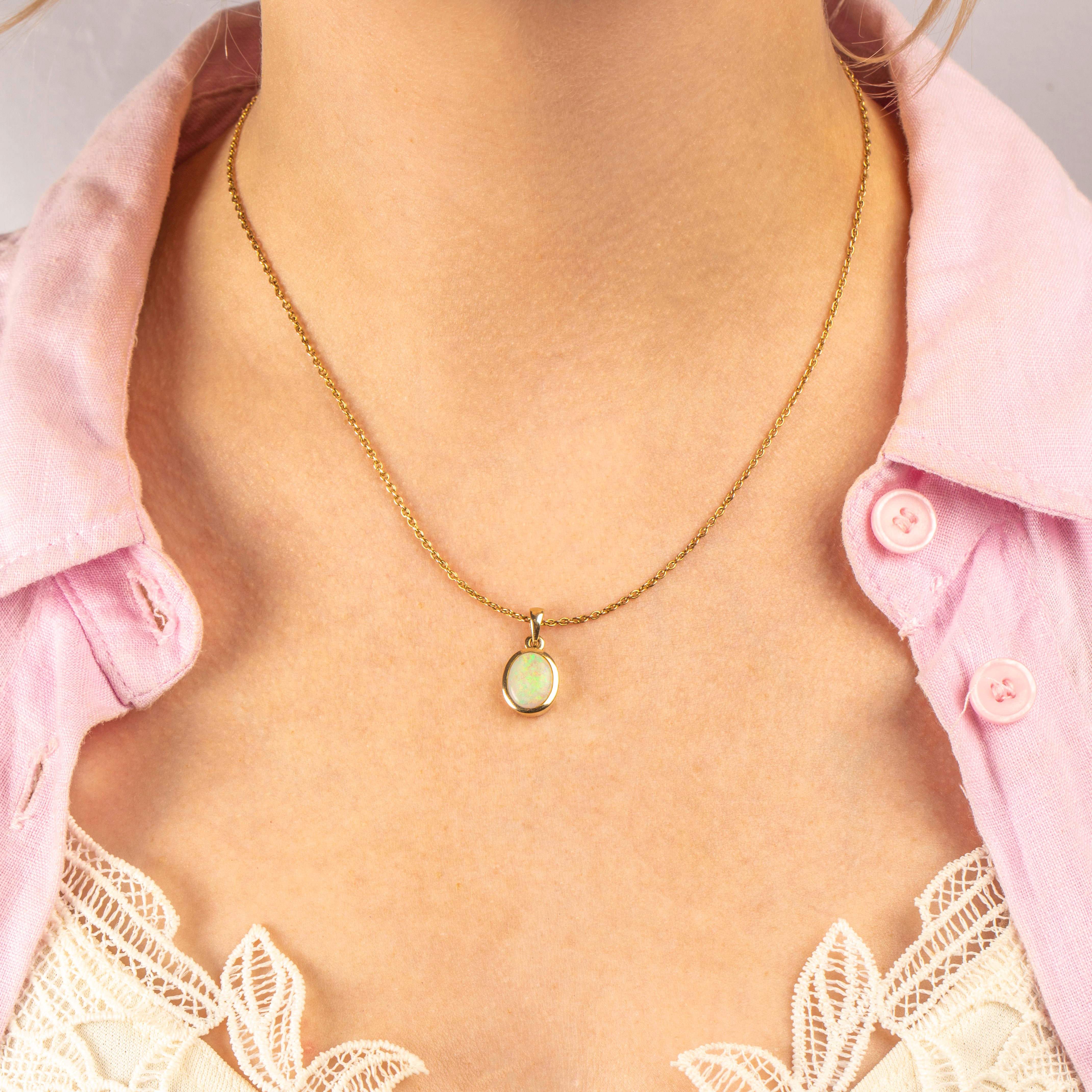 This Vintage Opal's stunning hues marry perfectly with the warm tones of her 9ct Gold bezel and will look gorgeous suspended from a dainty chain. This vintage Opal pendant is ideal for everyday wear, bringing sophistication to any outfit!