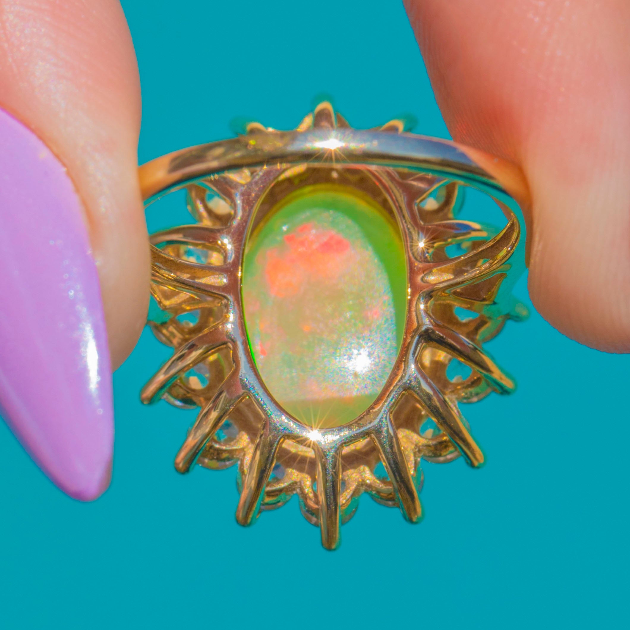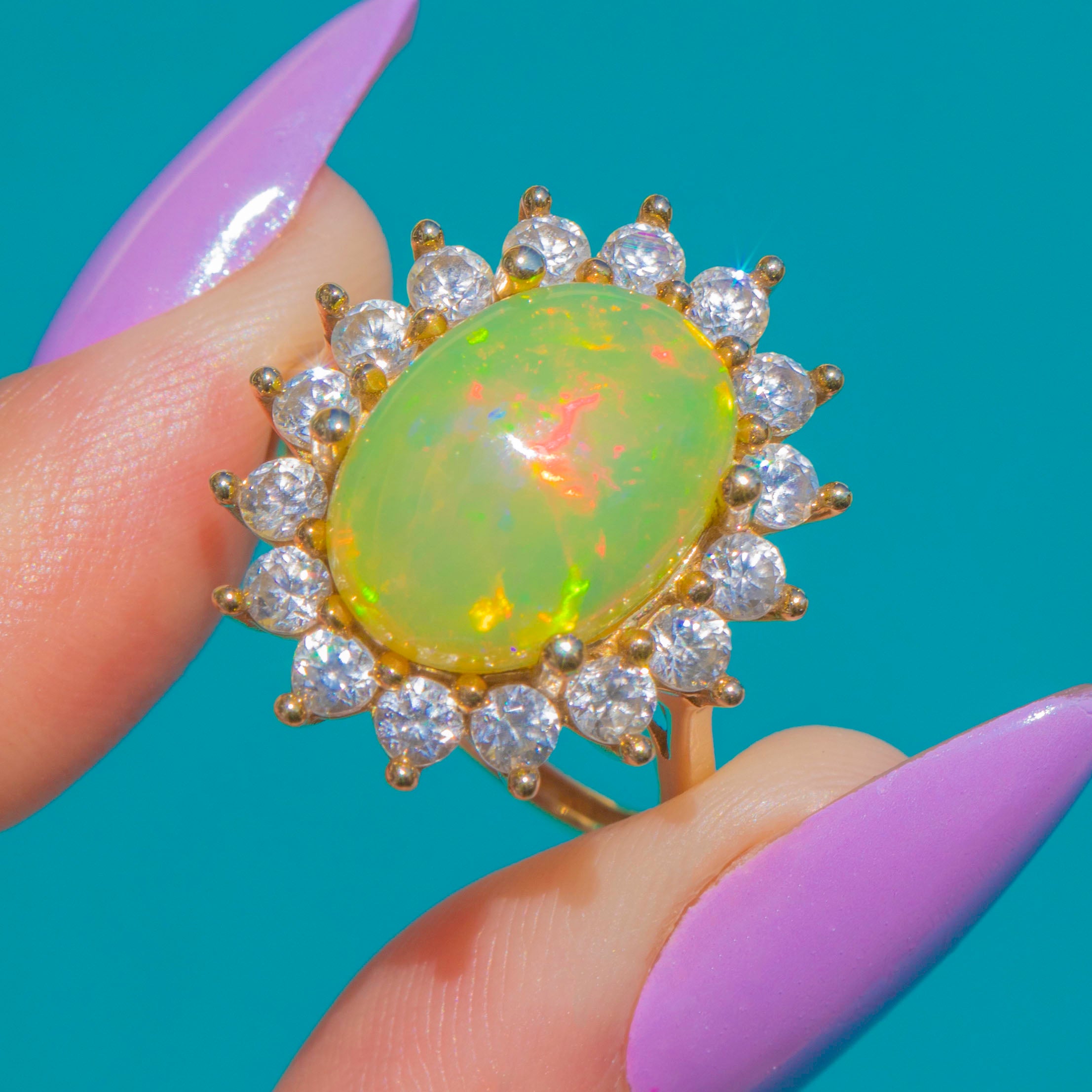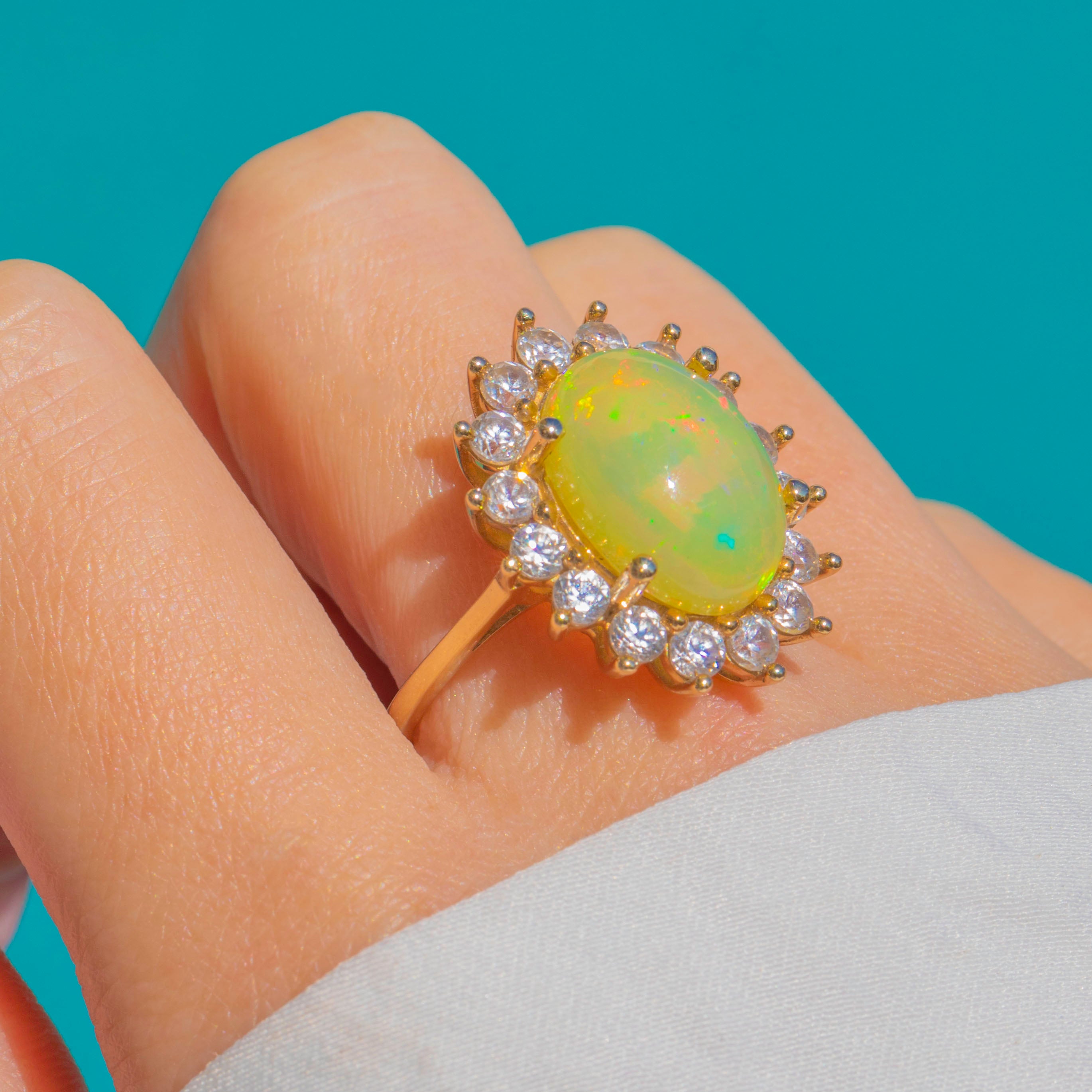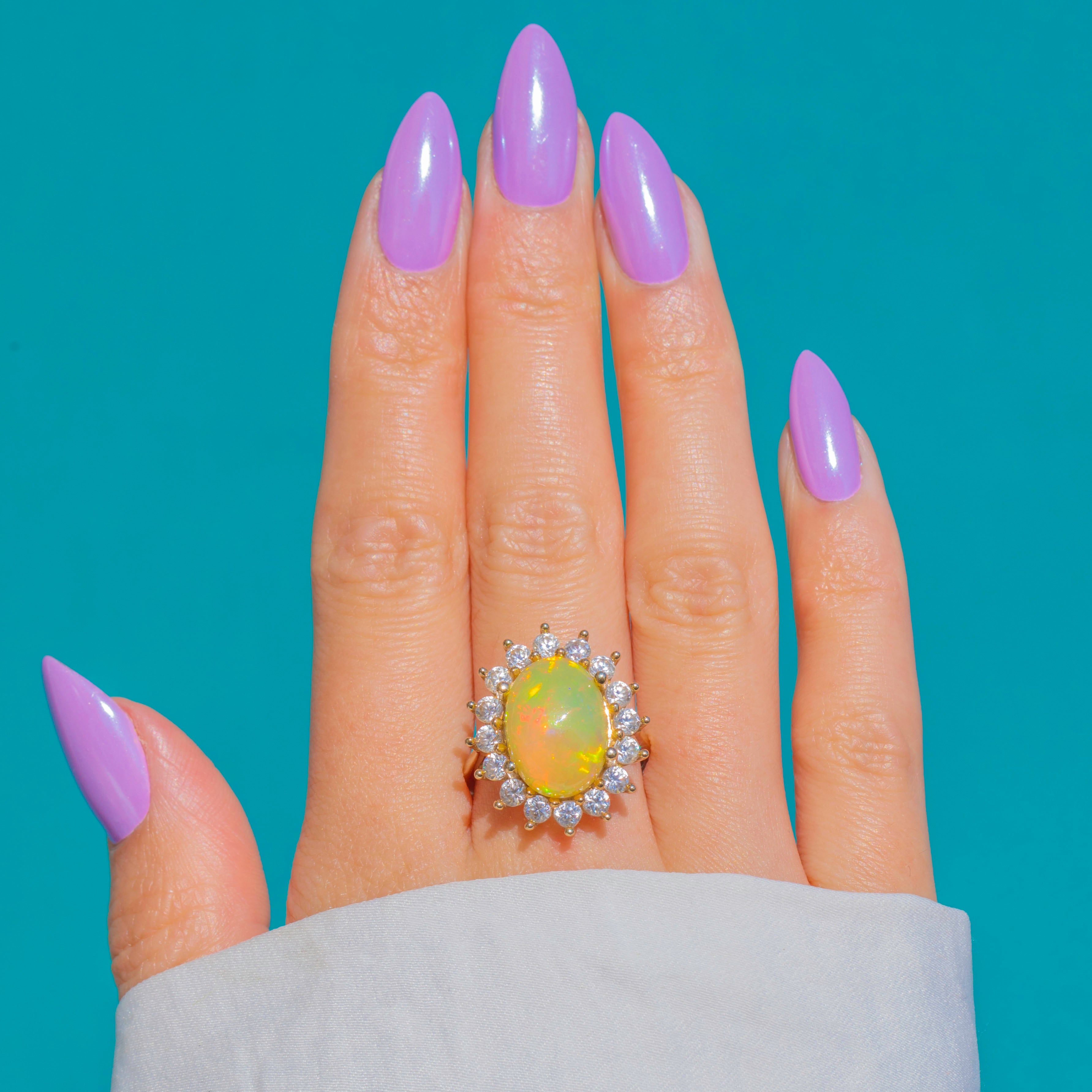 A glorious 4.30ct Opal takes centre stage in this Vintage 9ct Gold cocktail ring, its silky cabochon alive with vivid flashes of green, orange, red and blue. Framed by a bright halo of White Spinel, the effect is a radiant sunburst that shimmers with every movement.
