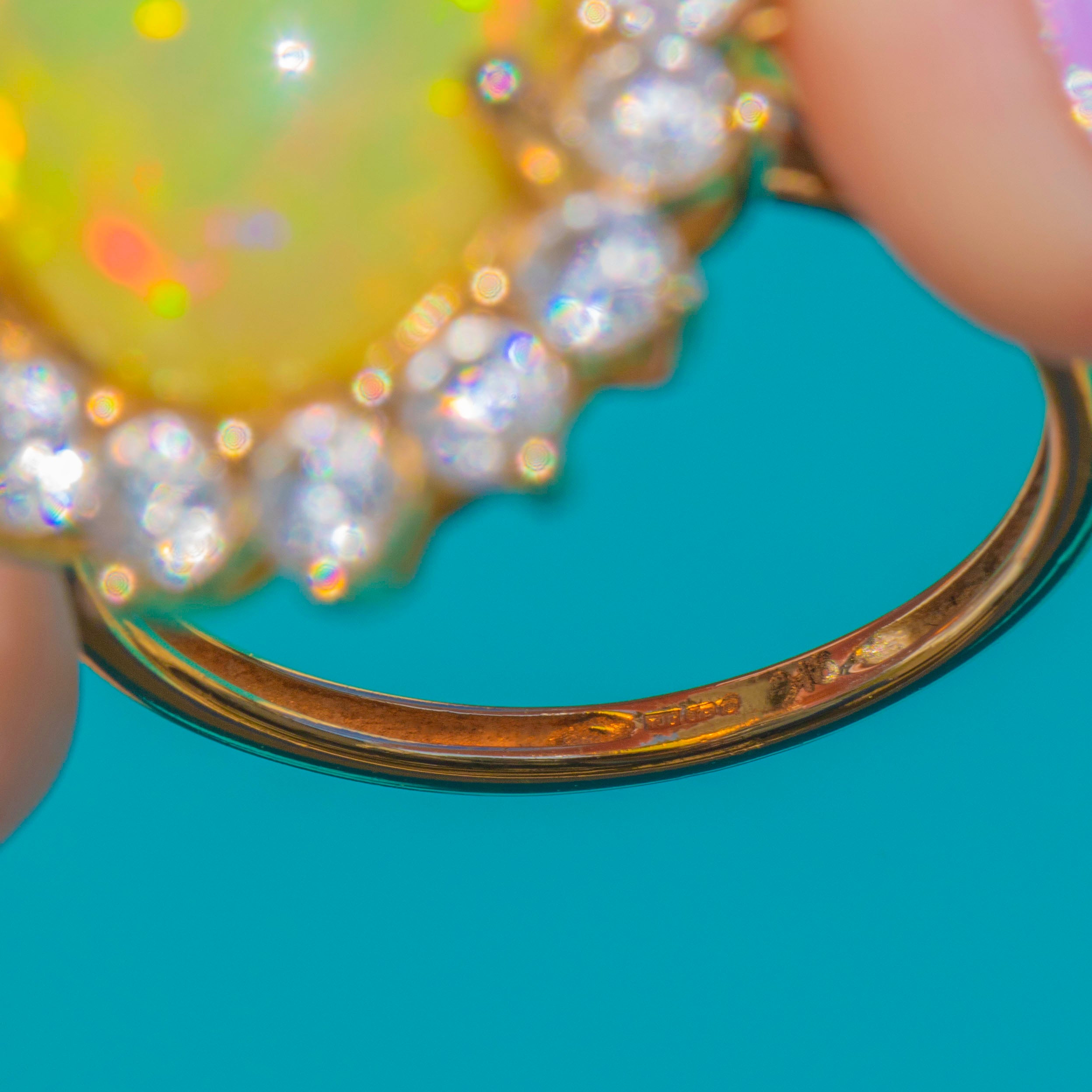 EXCELLENT: The Opal is secure with a glossy smooth dome and vibrant play-of-colour. The White Spinel gemstones are bright and well-set, all present and secure. The 9ct Gold setting and shank retain a high polish with only light surface wear, with no signs of damage or repair.
