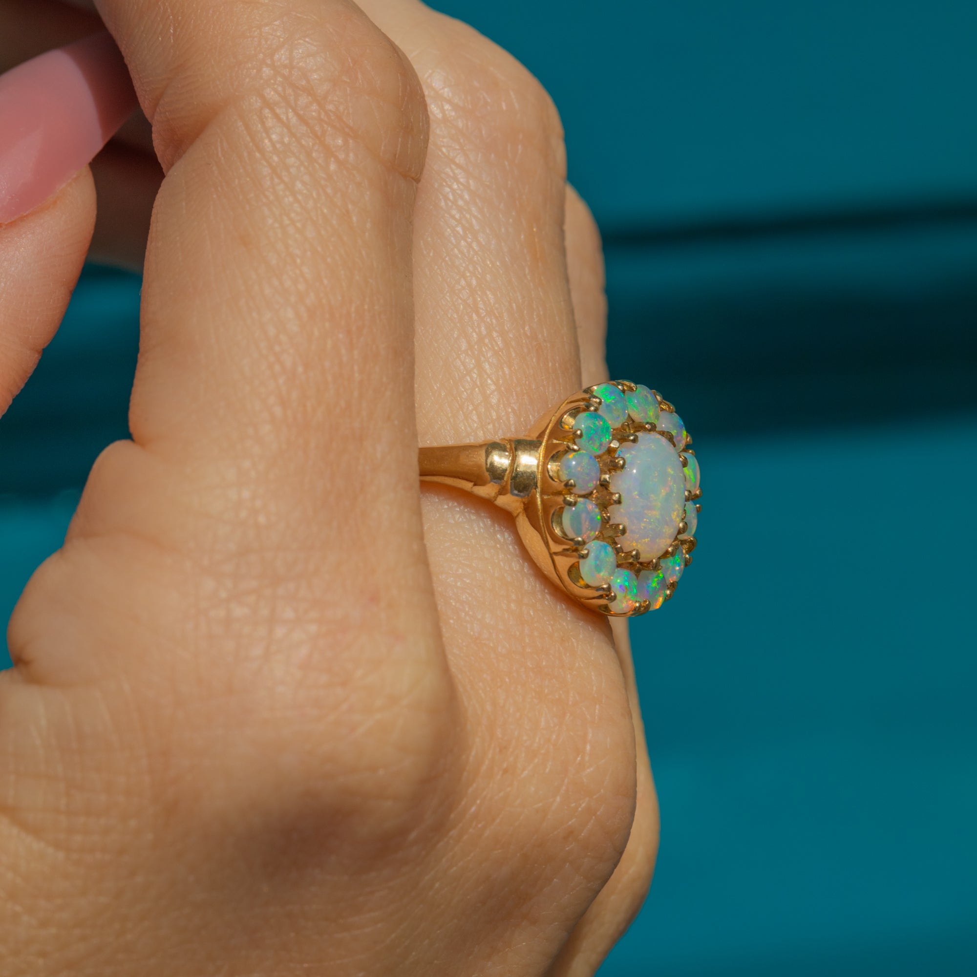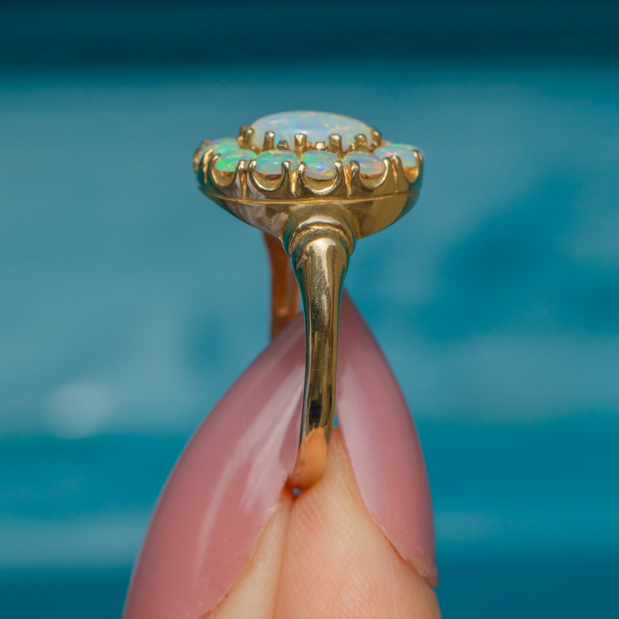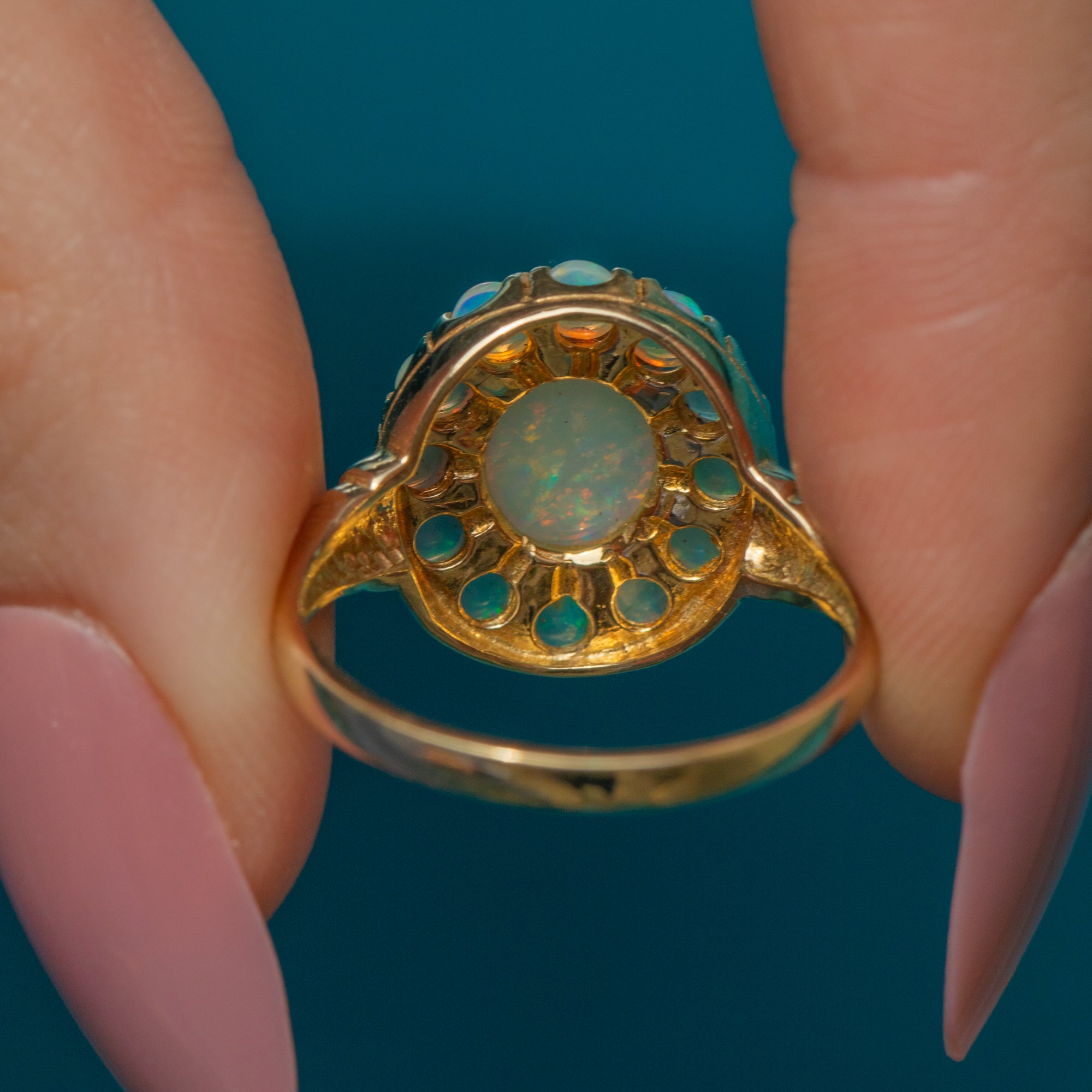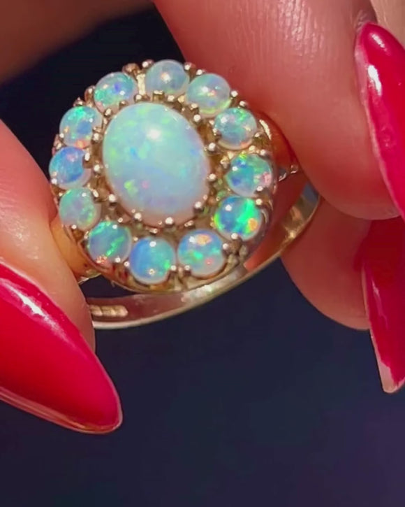 This exquisite 9ct Gold Opal cluster ring epitomises elegance and charm. Her 1.55ct Opal spread exhibits a captivating play of colours, ranging from ethereal blues to luminous green, speckled with neon orange and reds, providing ample finger coverage.