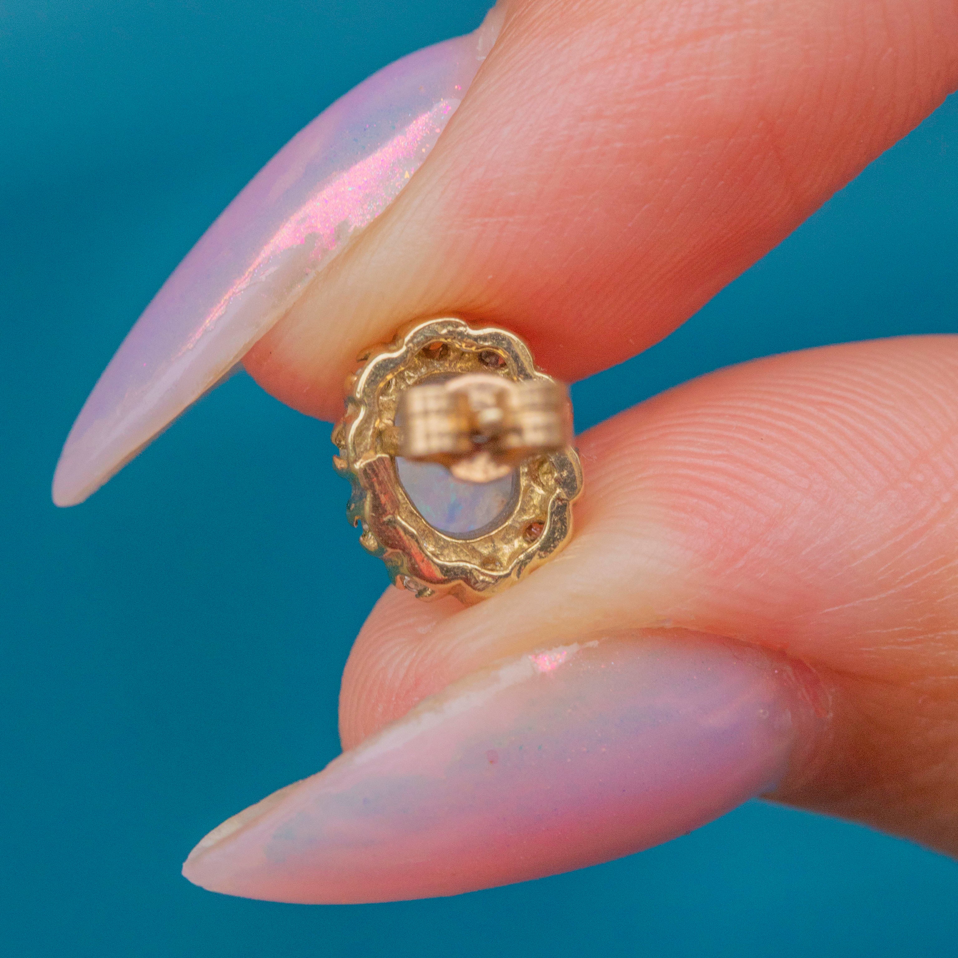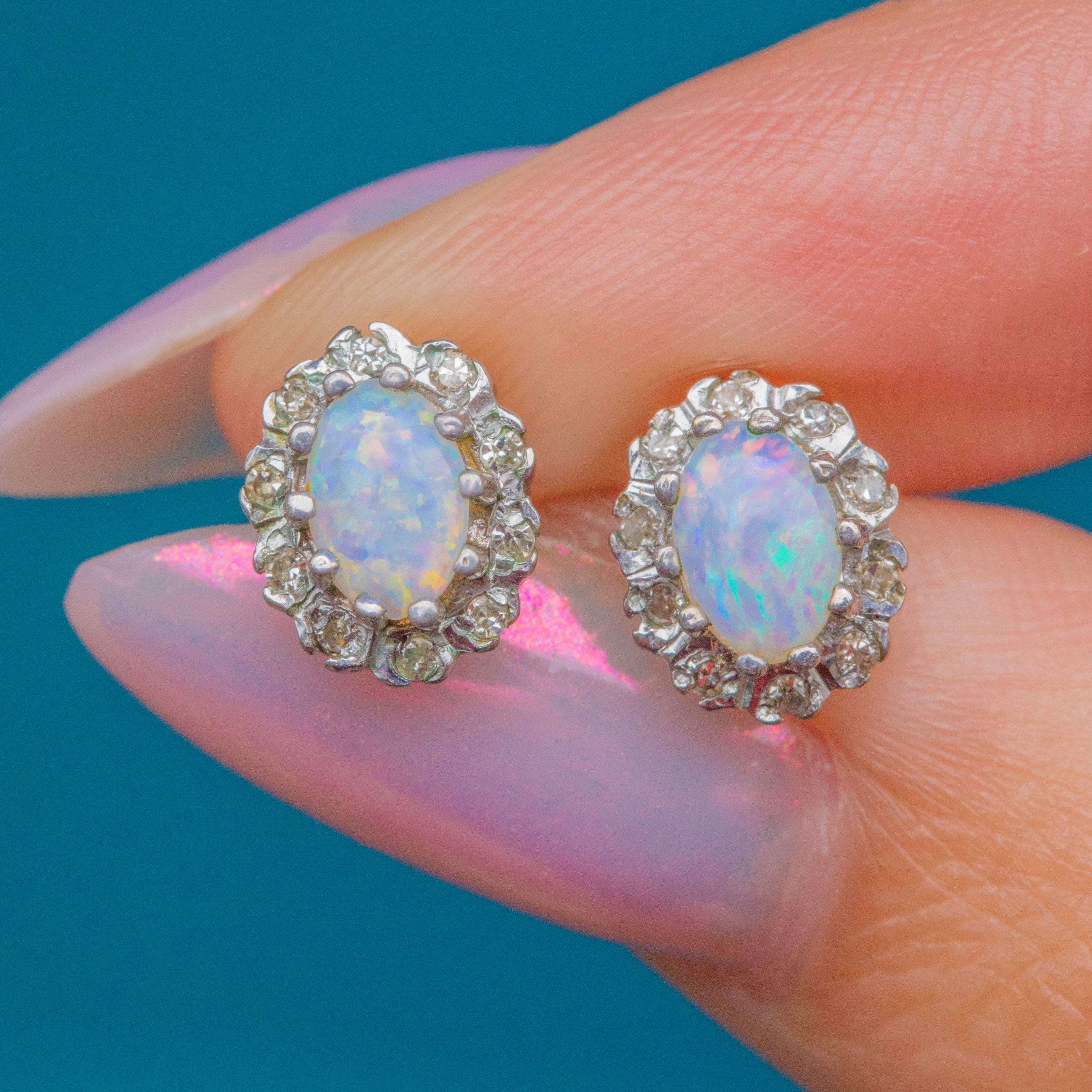 EXCELLENT: These enchanting Opal and Diamond cluster earrings are in overall excellent vintage condition. The Opals remain vibrant and free from chips or cracks, and the Diamonds are well-matched, secure in their settings, and retain a lively sparkle.