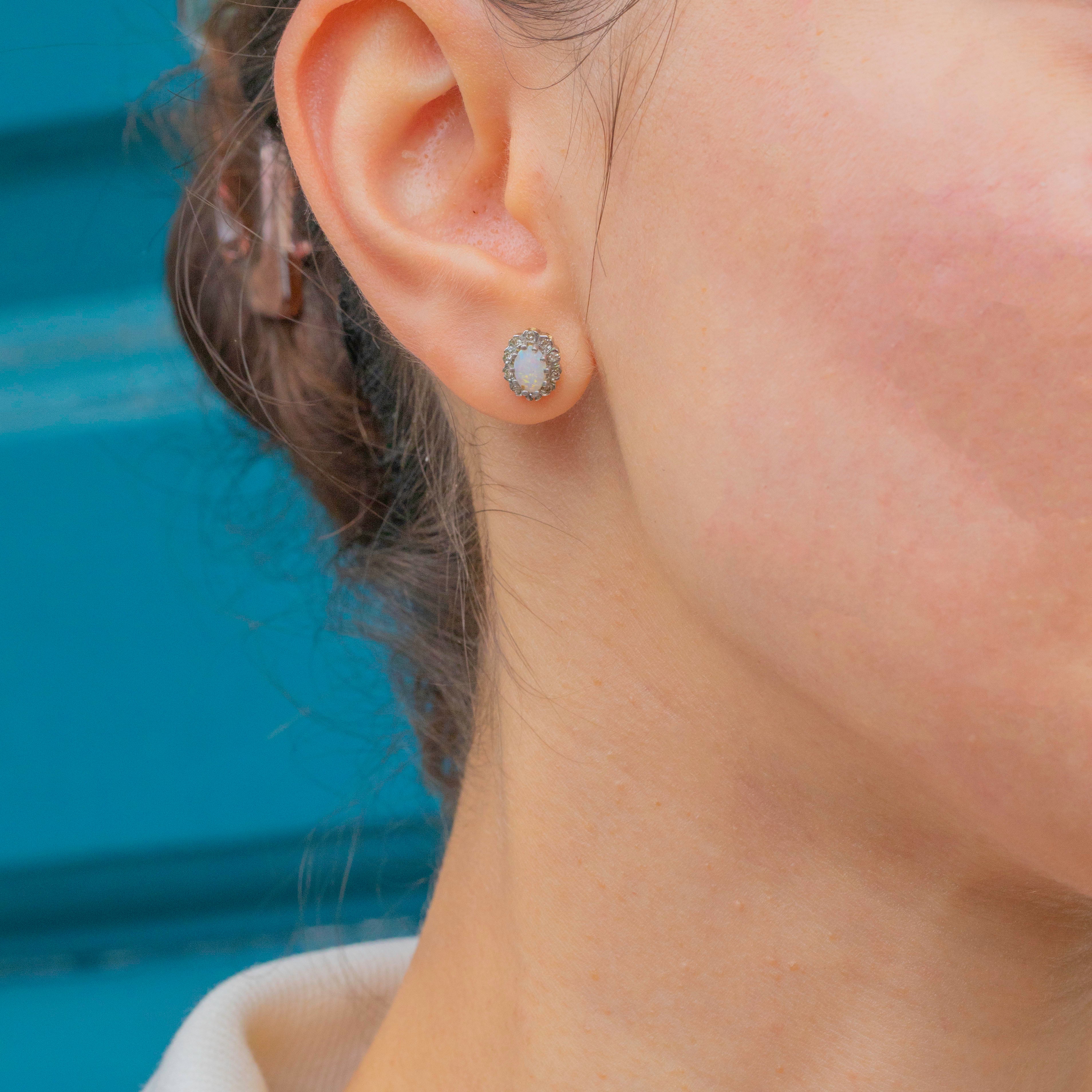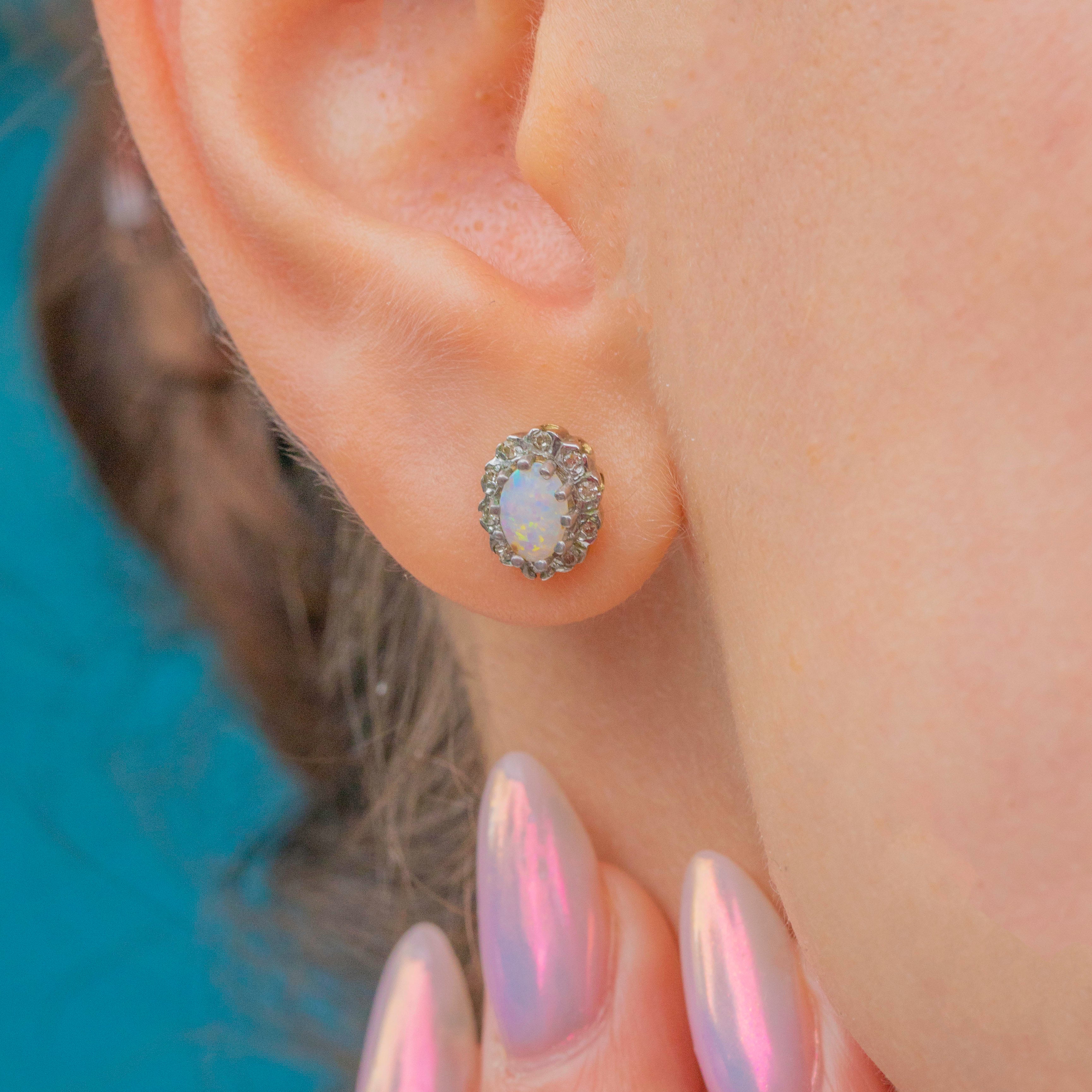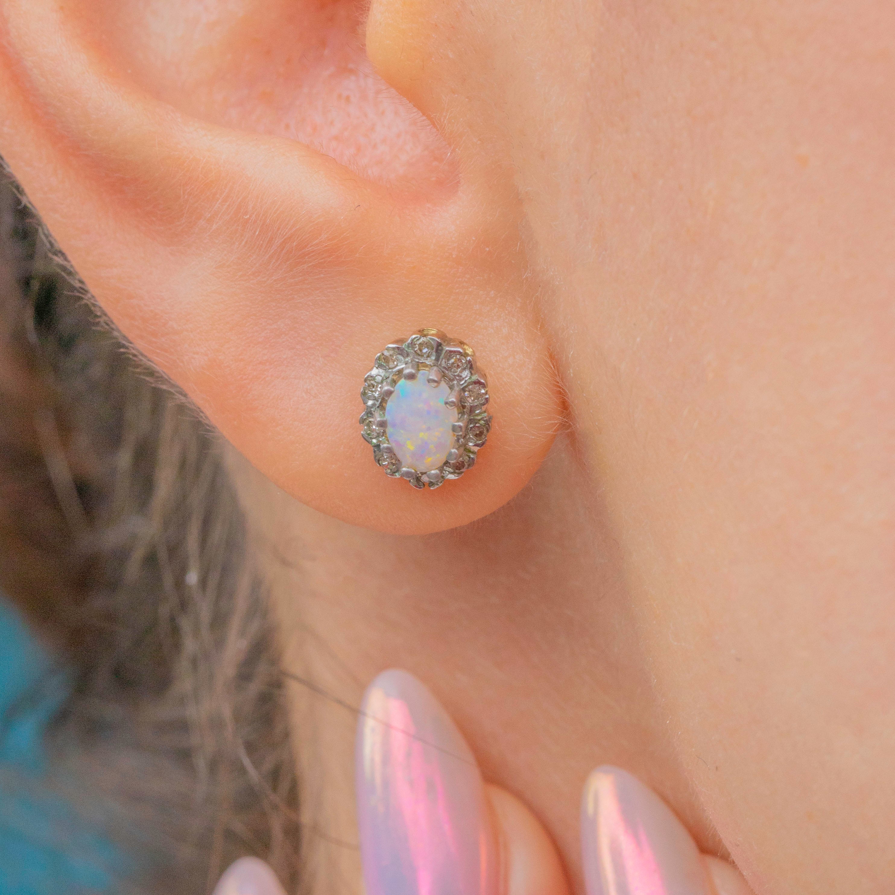 These Opal Diamond cluster earrings are an enchanting pair! Each stud displays a 0.40ct Opal, shimmering with gorgeous pastel hues, haloed by a cluster of glistening rose-cut Diamonds, adding a mesmerising sparkle.