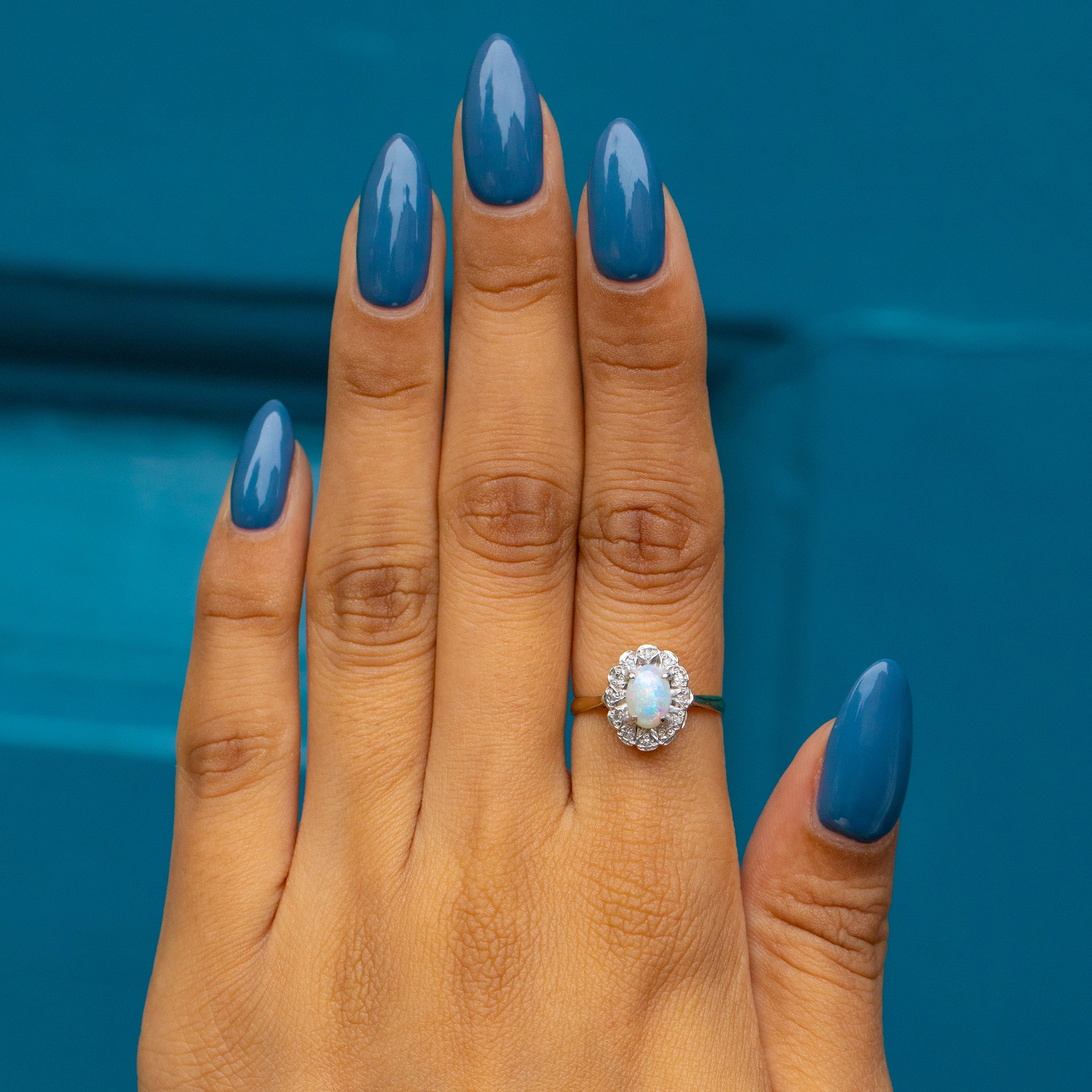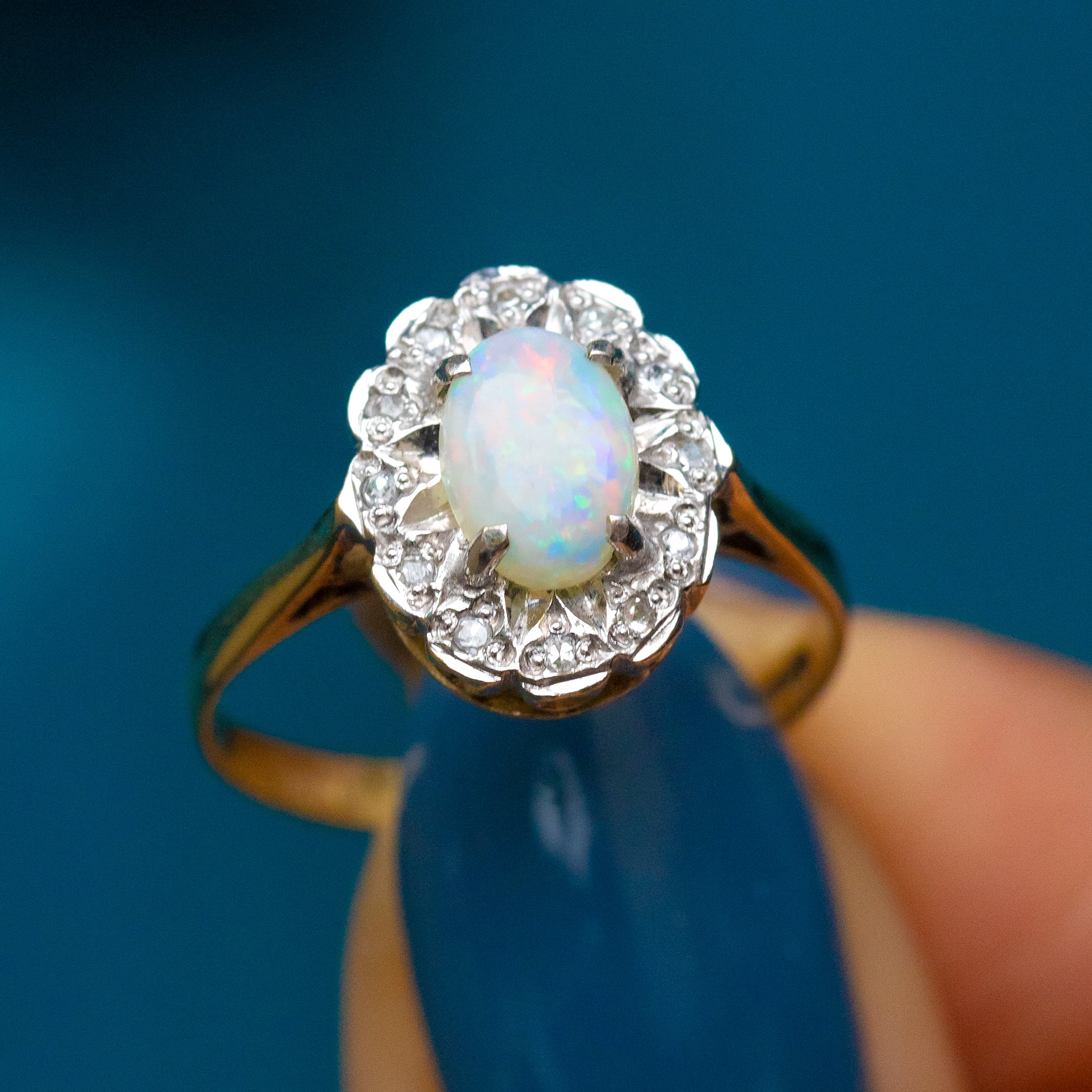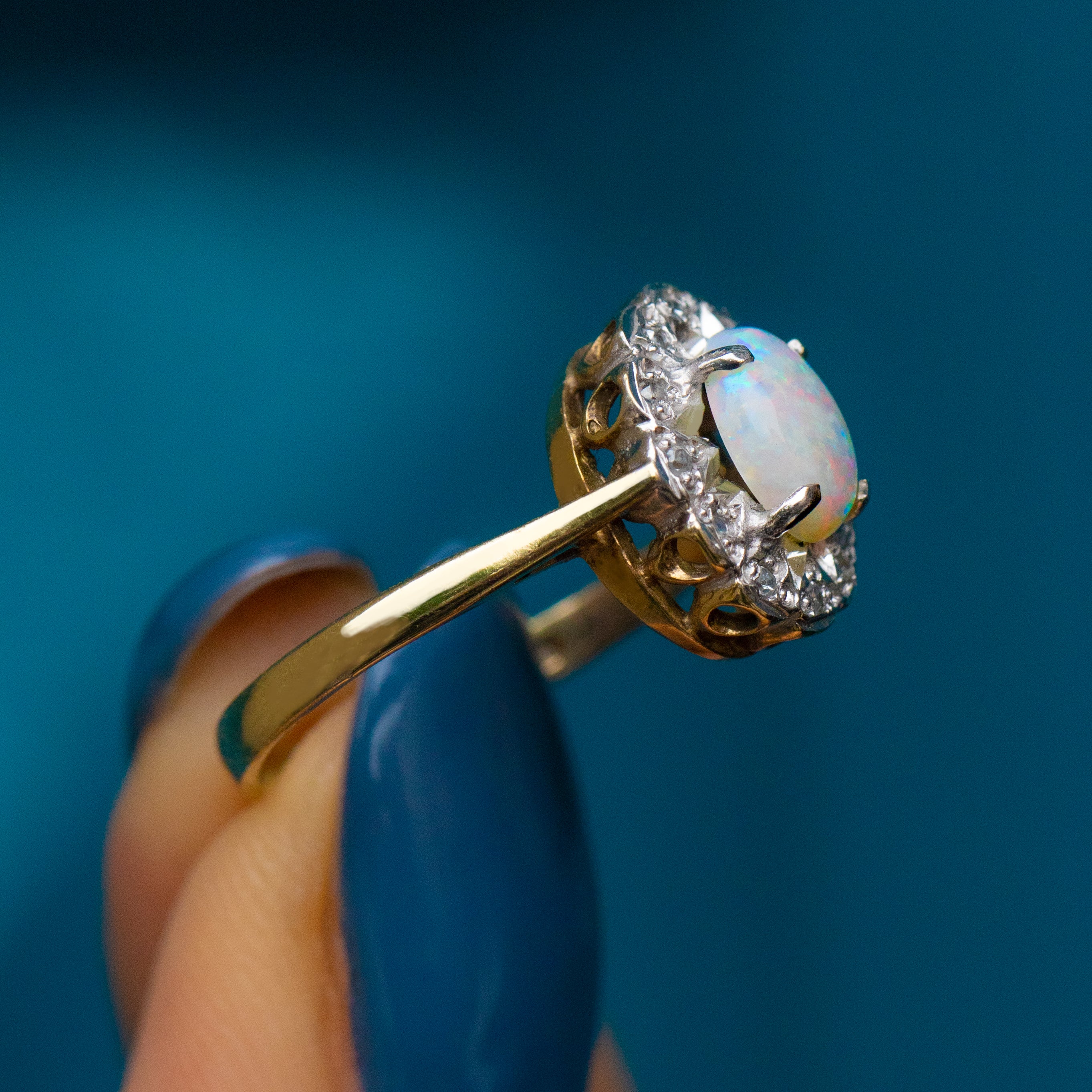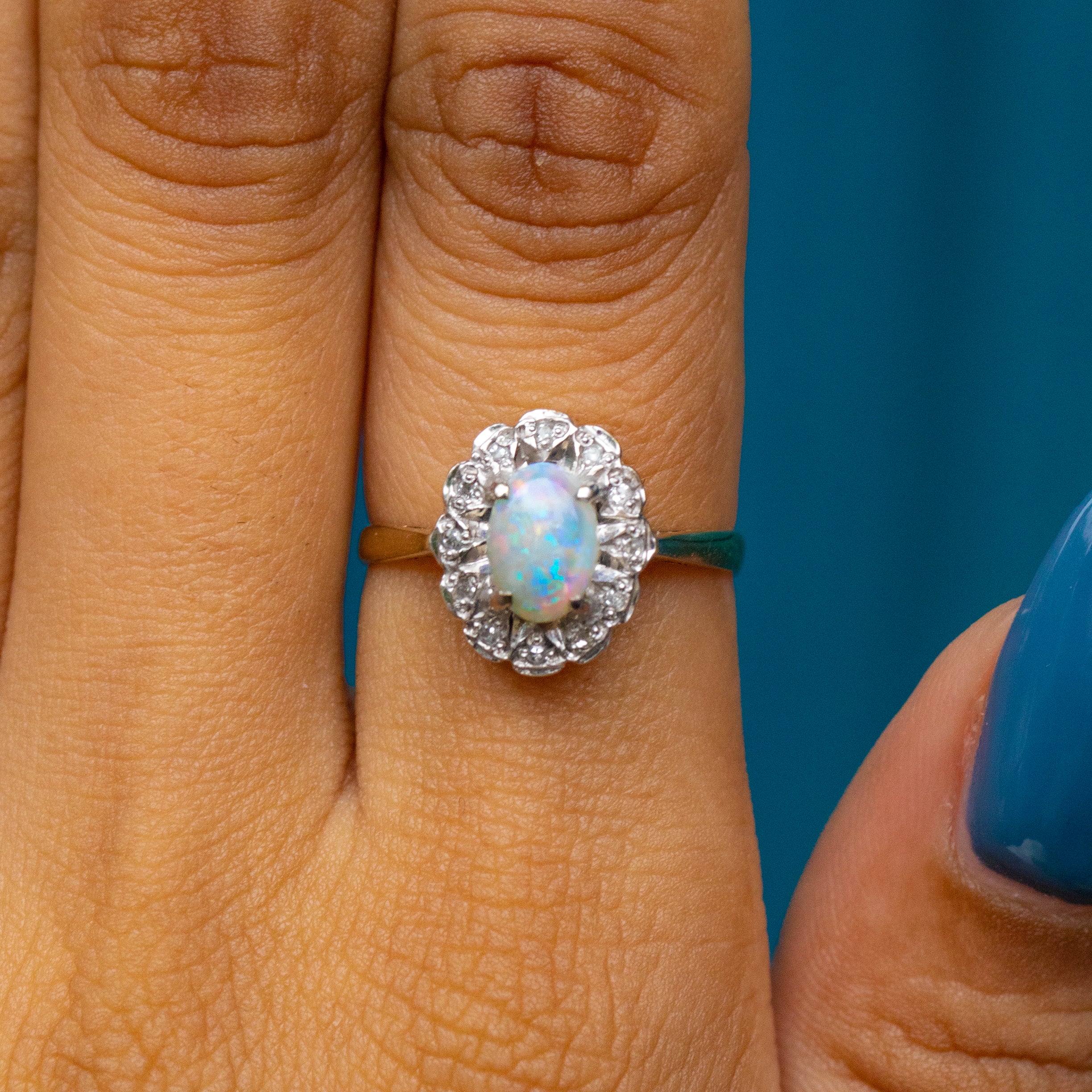 Haloed by a sea of scintillating Diamonds, the combination of Gemstones makes for a decadent duo. Secured upon your hand by a buttery 9ct Gold band, the moment you lock eyes with this Vintage Opal ring you will never want to take her off!