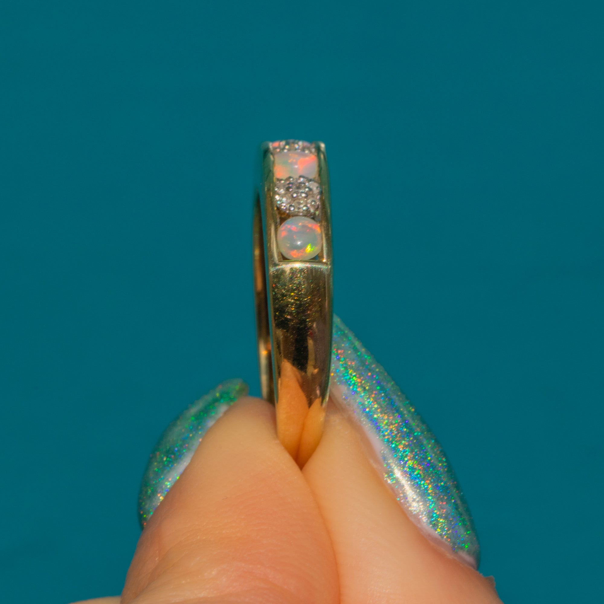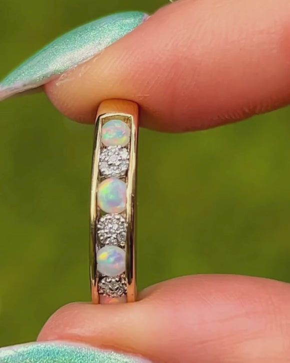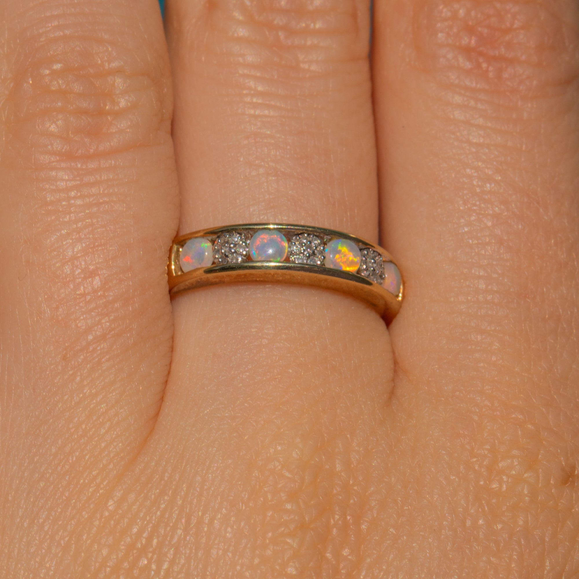 EXCELLENT. This 9ct Gold Opal Diamond half eternity ring is in excellent condition. Both the Opals and Diamonds are secure within their settings and the Gold throughout has a saturated hue and the perfectly formed band glides onto your hand a dream. We know you'll fall for her just as quickly as we did!