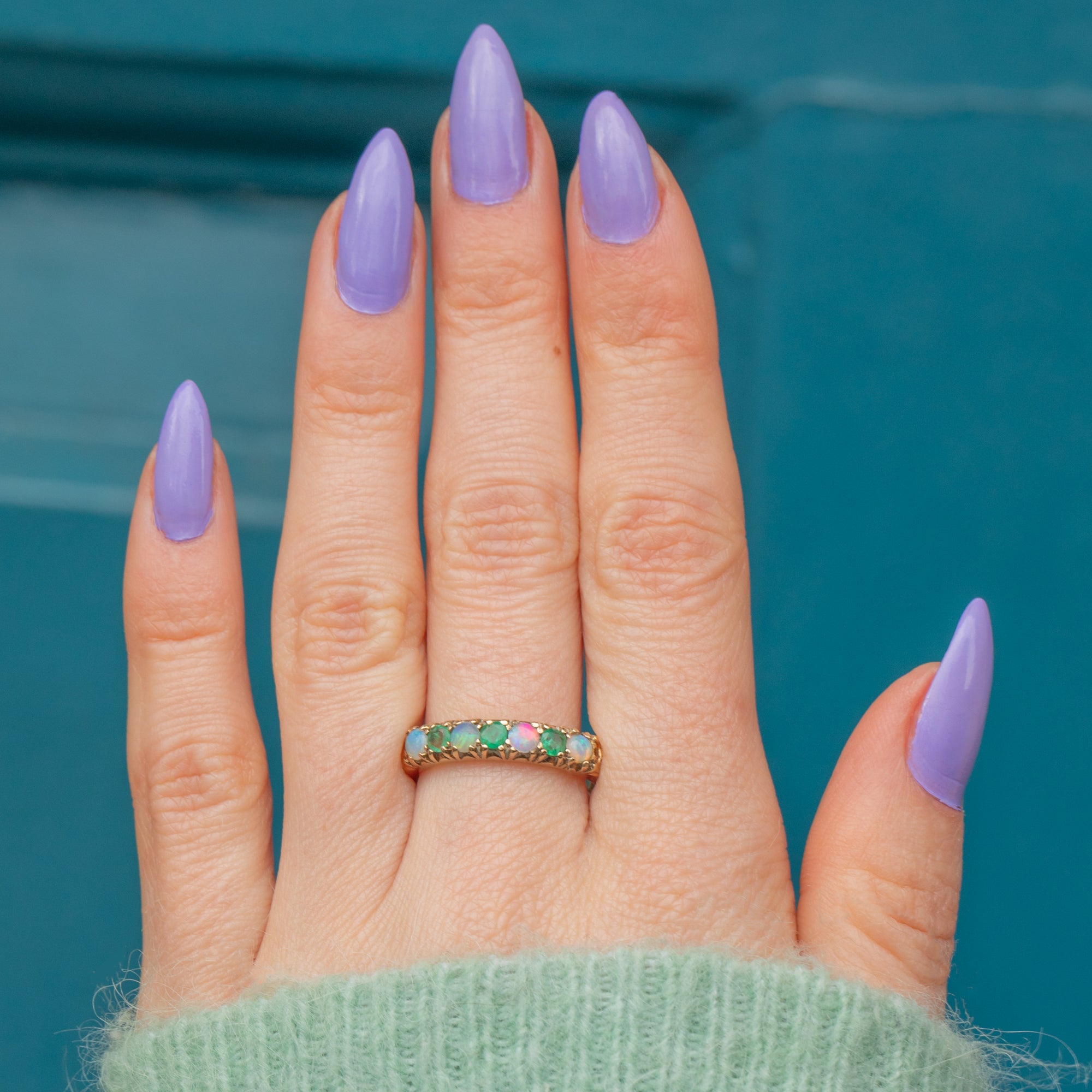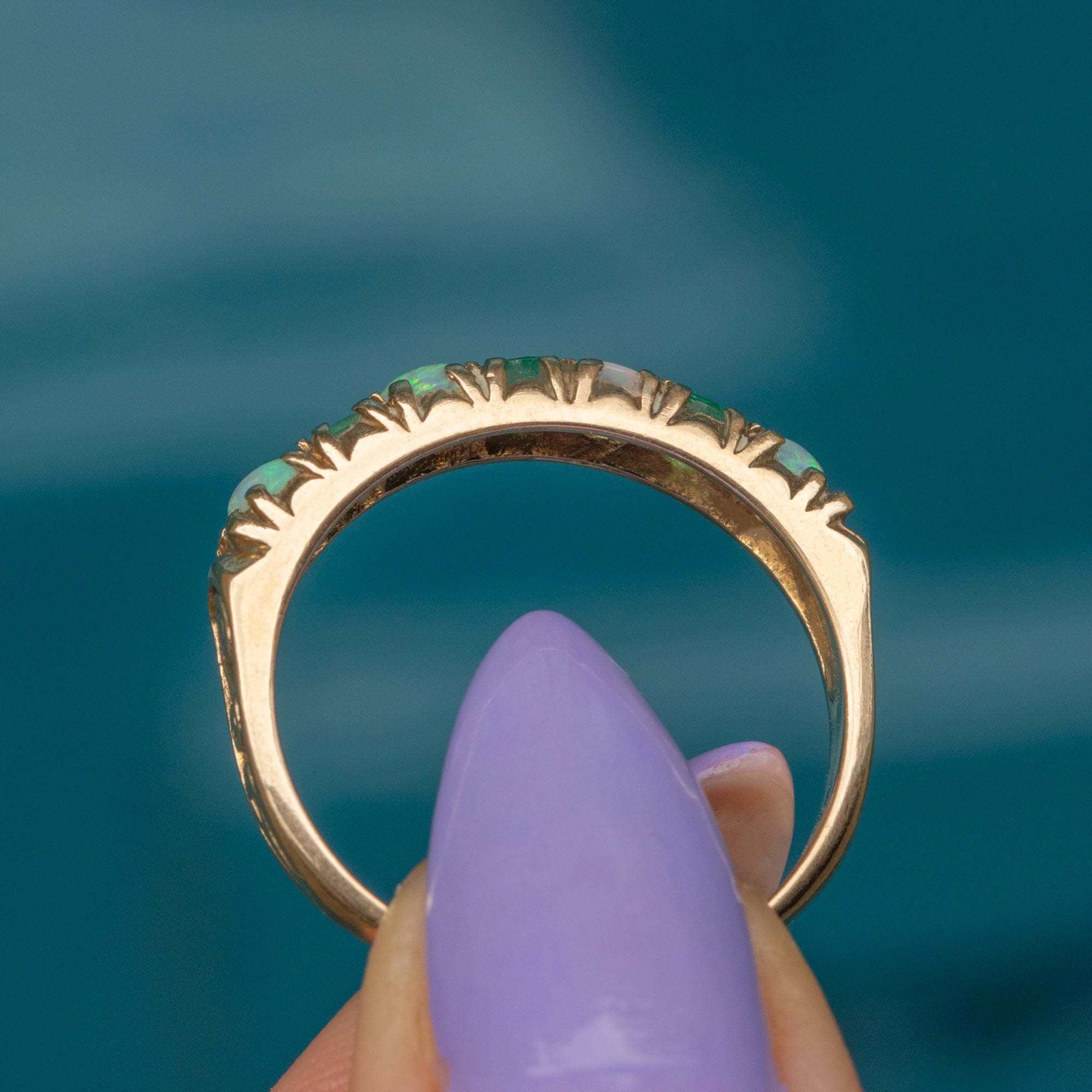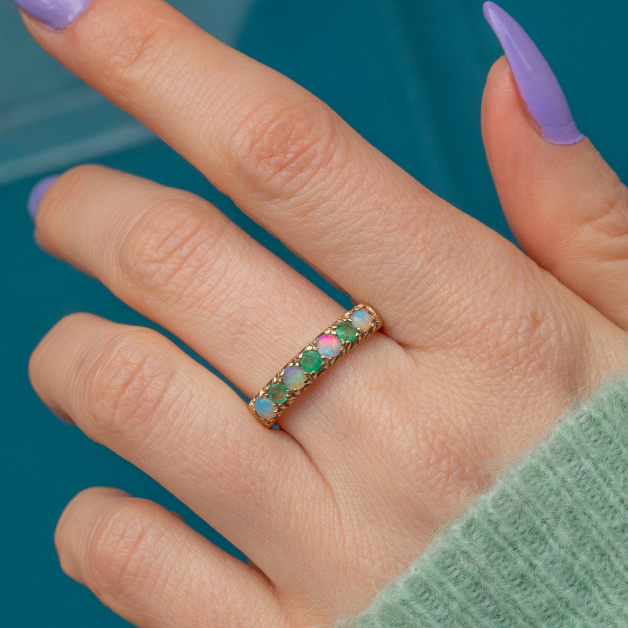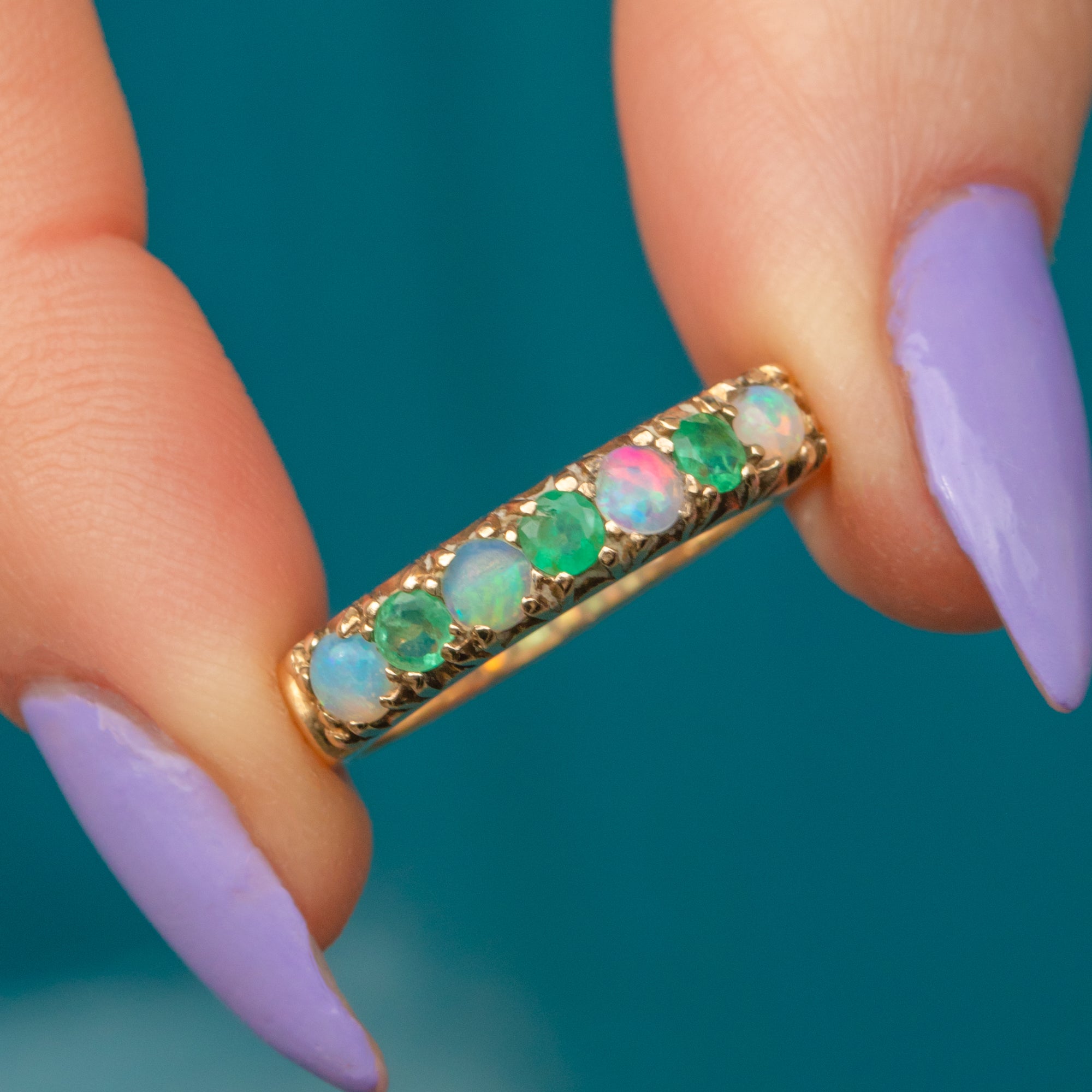 This fantastic 9ct Gold Opal Emerald half eternity ring seems to be crafted for a glamorous mermaid queen, emblazoned with glorious iridescent Opals and verdant Emeralds!