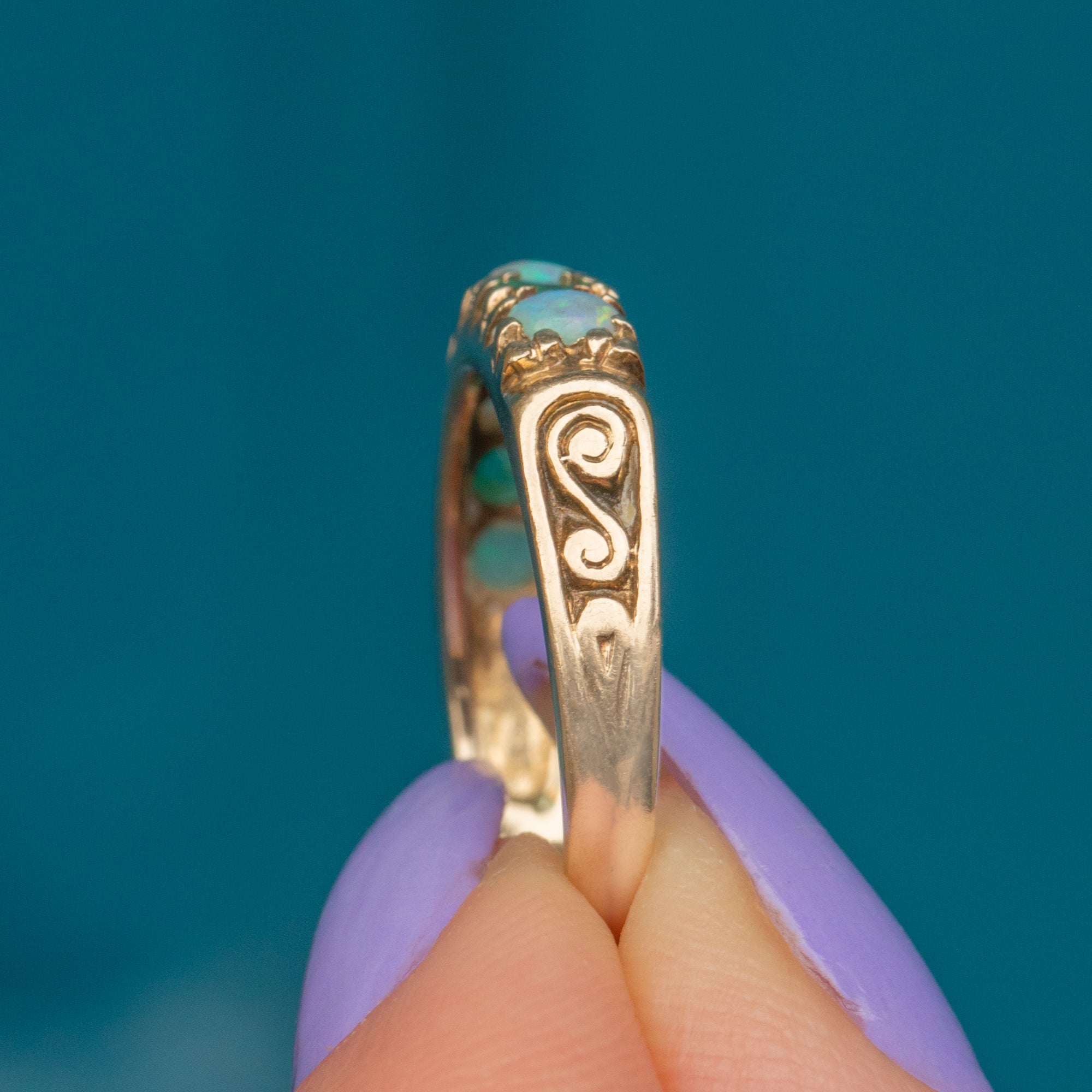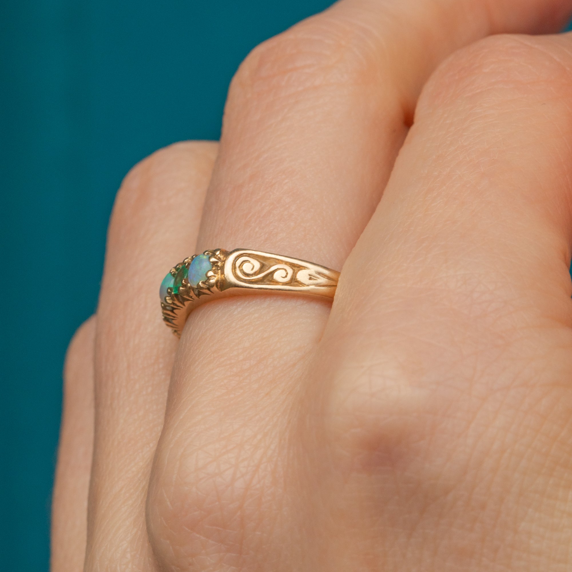 This vintage ring is simply stunning, with the shimmering Opals revealing a gorgeous hue of pearlescent green and blue tones in the light, a fitting complement to the leafy green Emerald gems. These colours beautifully marry with the antique buttery 9ct Gold, which is rich in detail, with engraved patterns adorning the shoulders of the ring. A decadent delight, you'll never want to take her off!