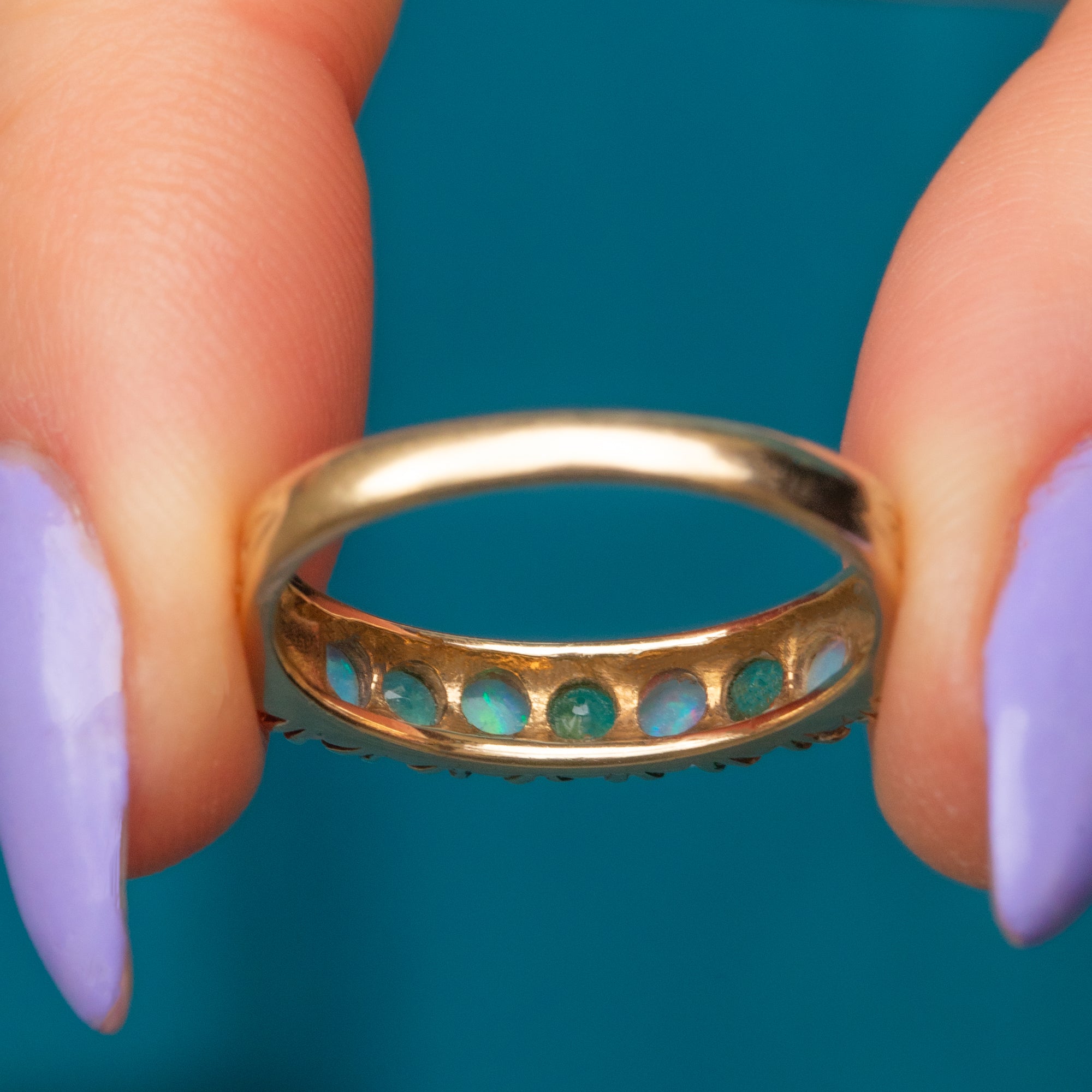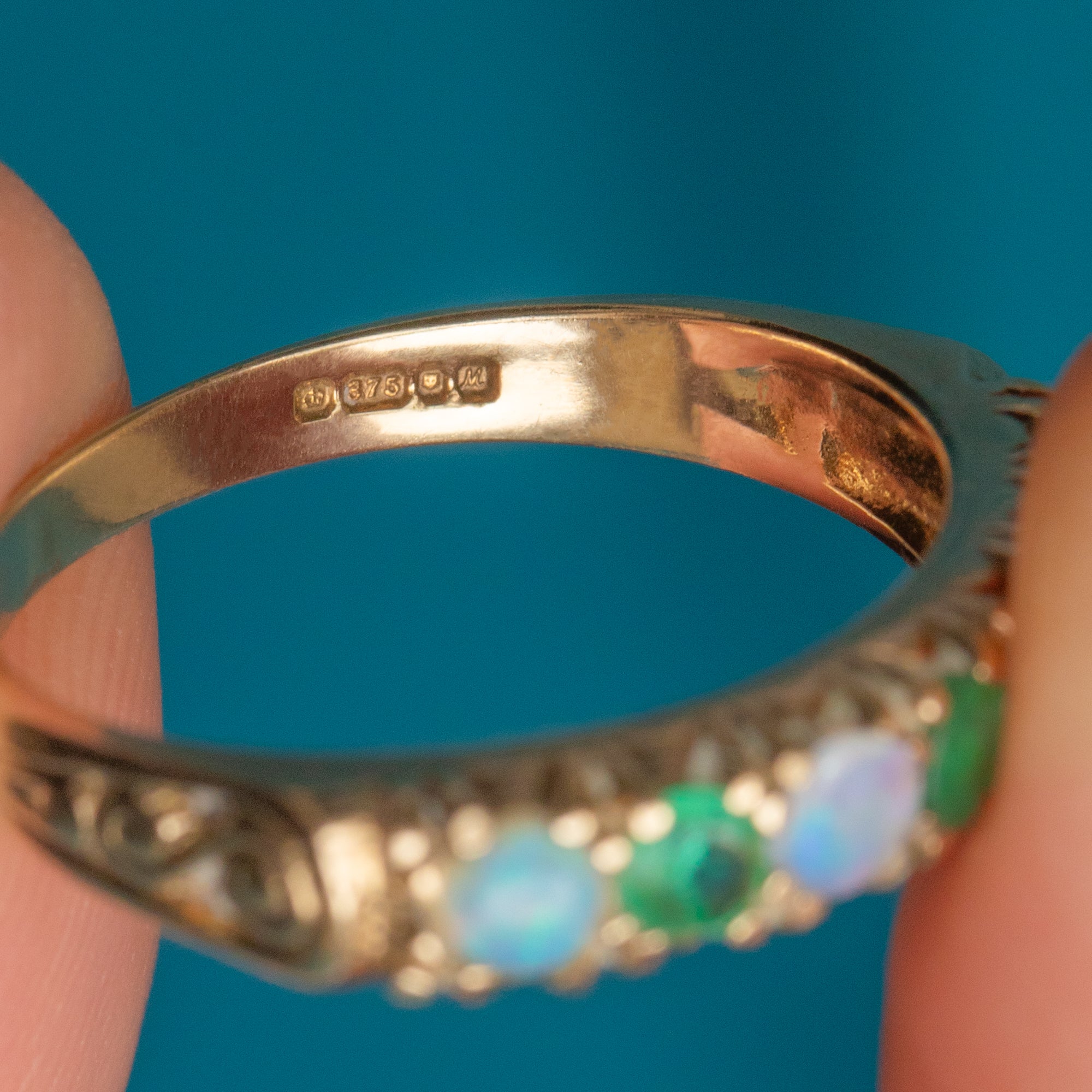 VERY GOOD-GOOD: This 9ct Gold Opal Emerald half eternity ring is sublime! The lively Opals are vibrant and luminous and the Emeralds have a desirable luscious green grass hue. Although there is some visible wear to the stones, they still shimmer excellently under the light! Each gemstone is secure within its setting, the Gold is buttery, and the band, although slightly curved with time, is still robust for consistent wear. This vintage ring promises many more years of enjoyment!