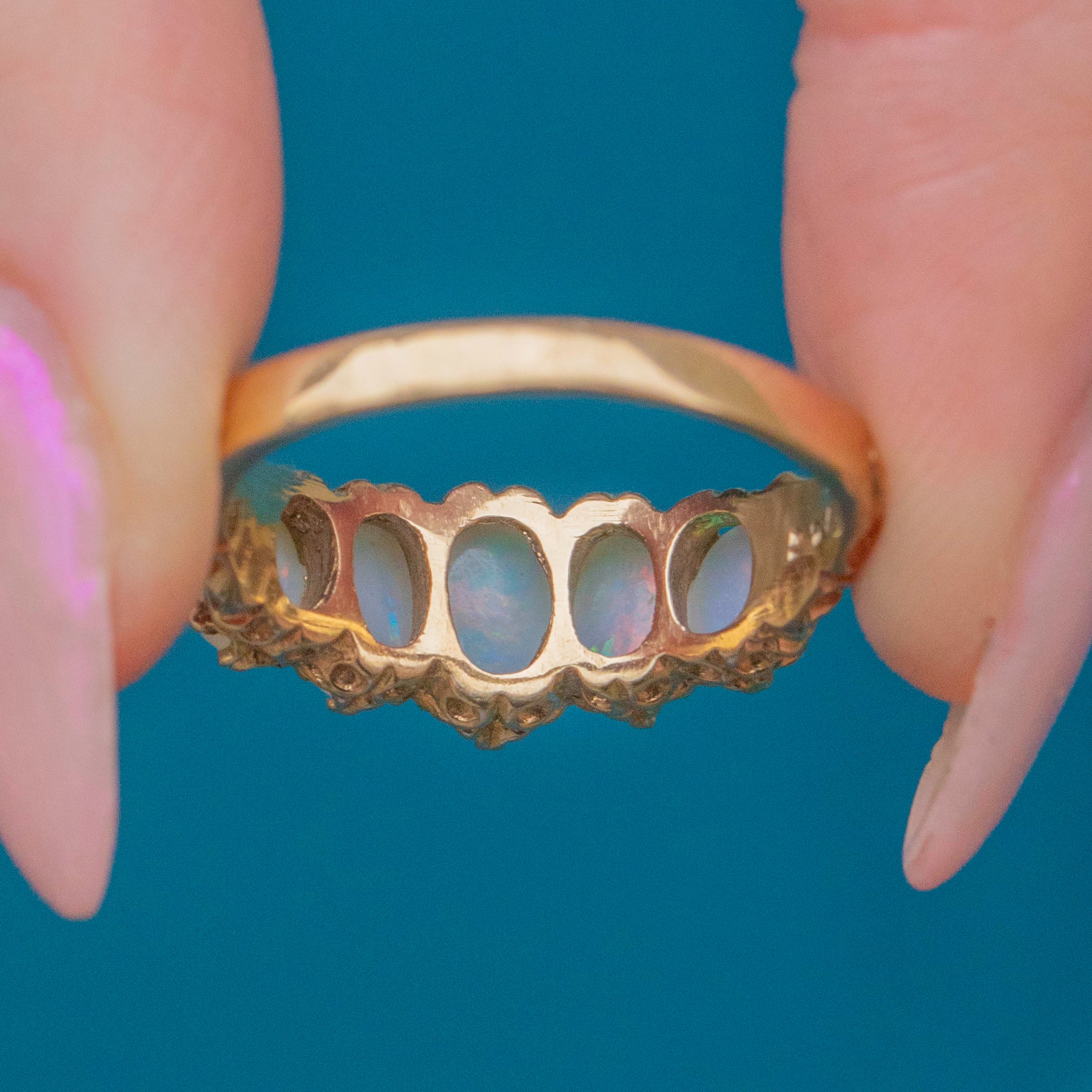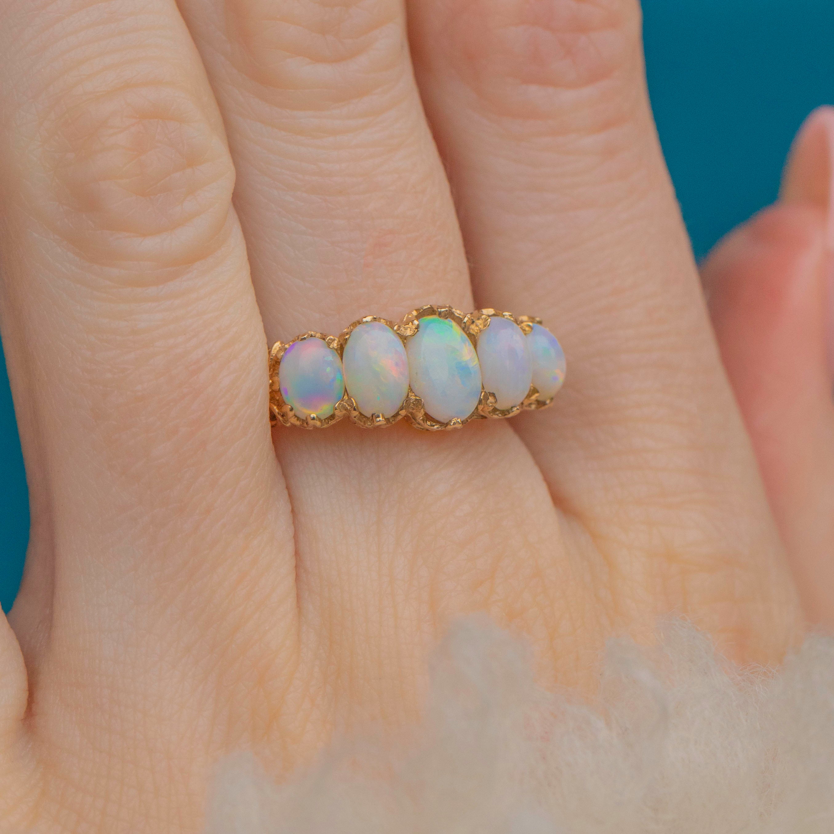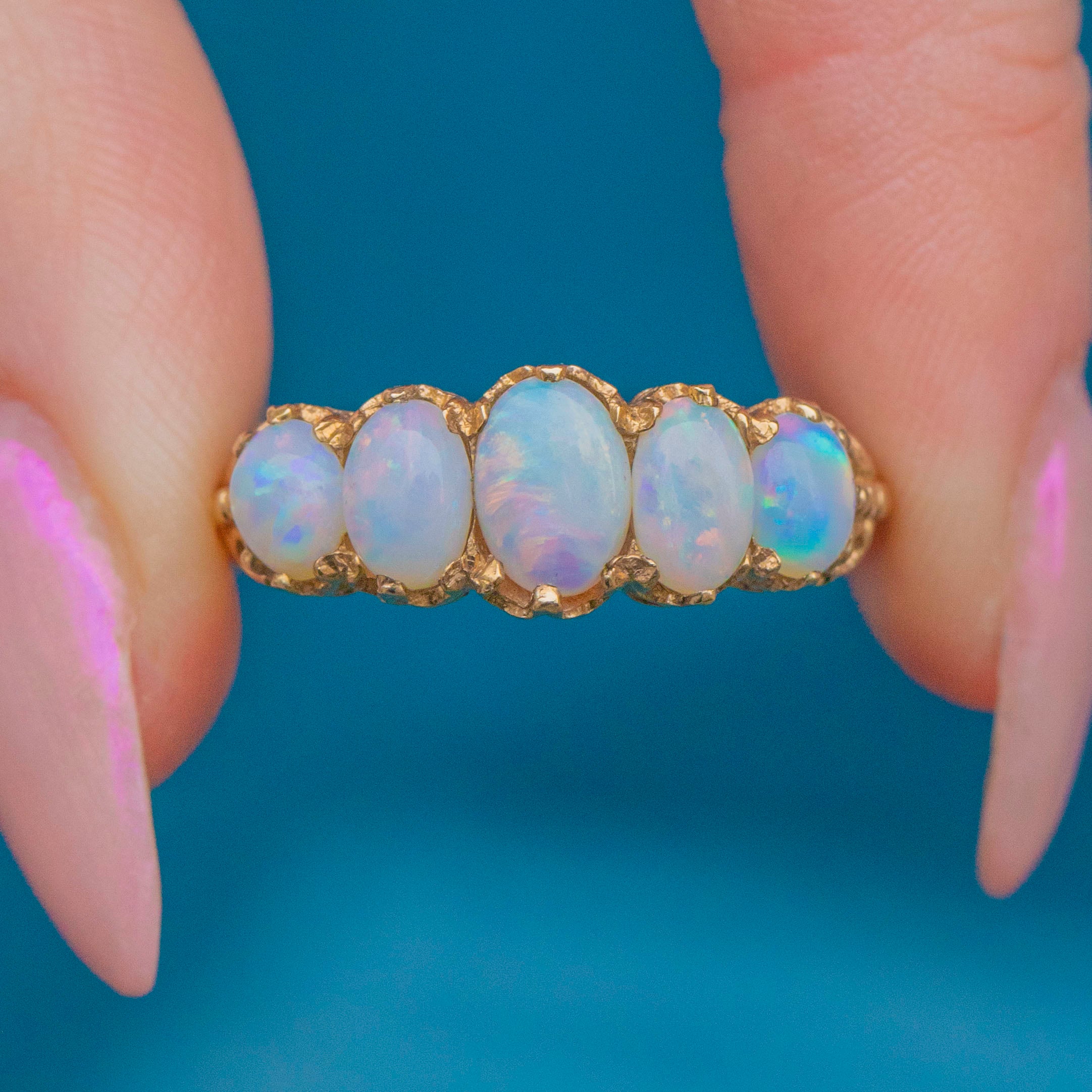 This 9ct Gold Opal five stone ring is simply stunning! Boasting five iridescent Opals that spread the width of your finger, this vintage ring is a truly eye-catching piece.