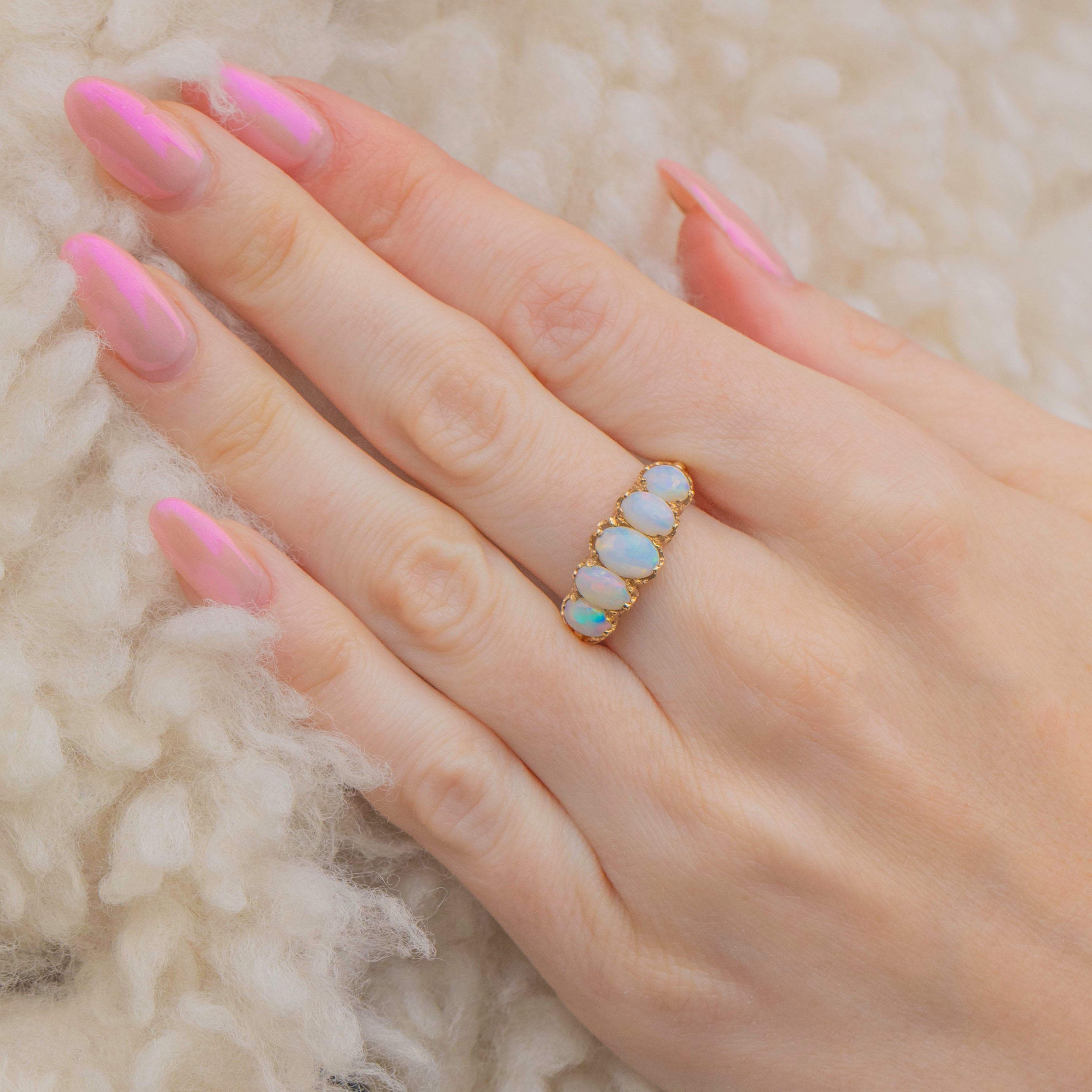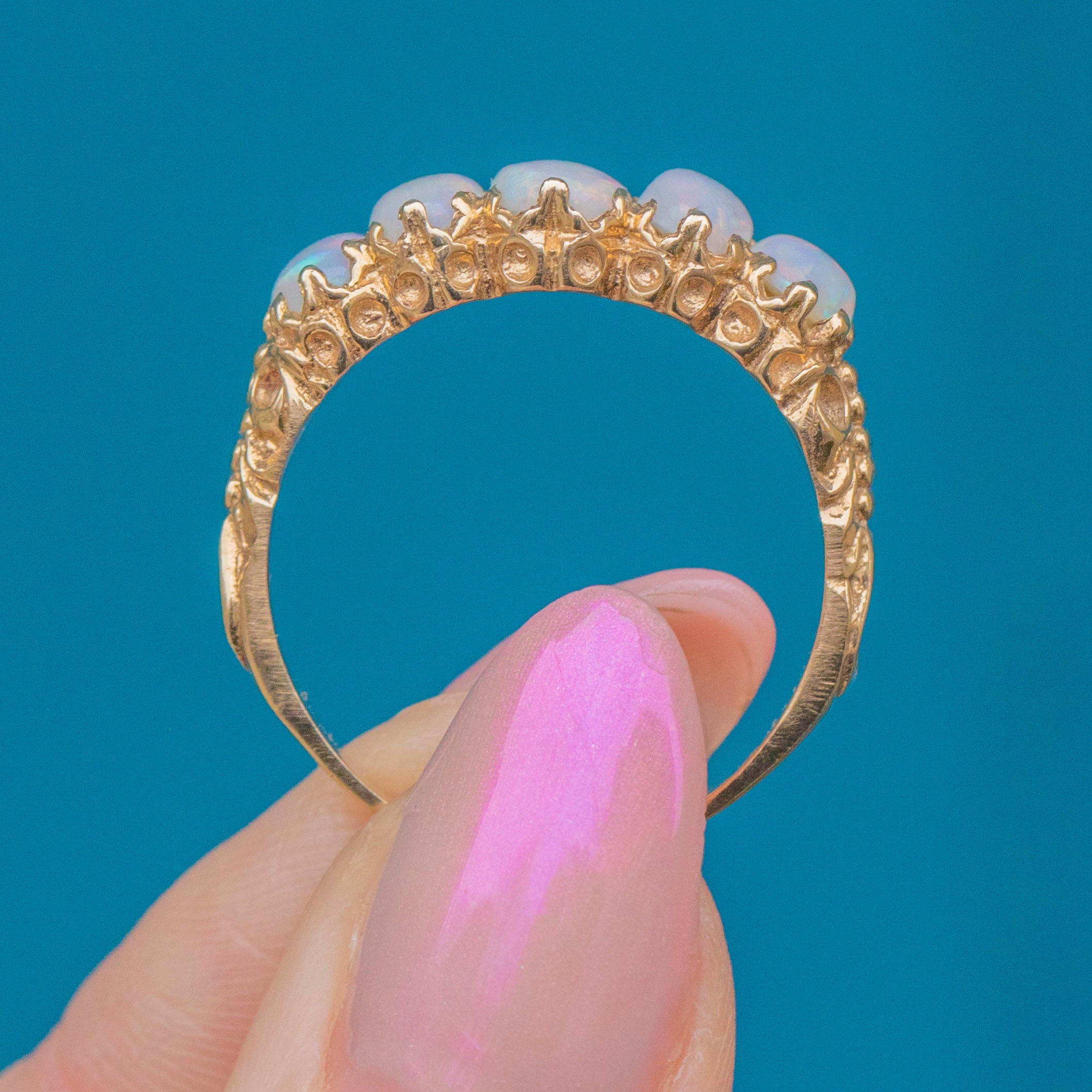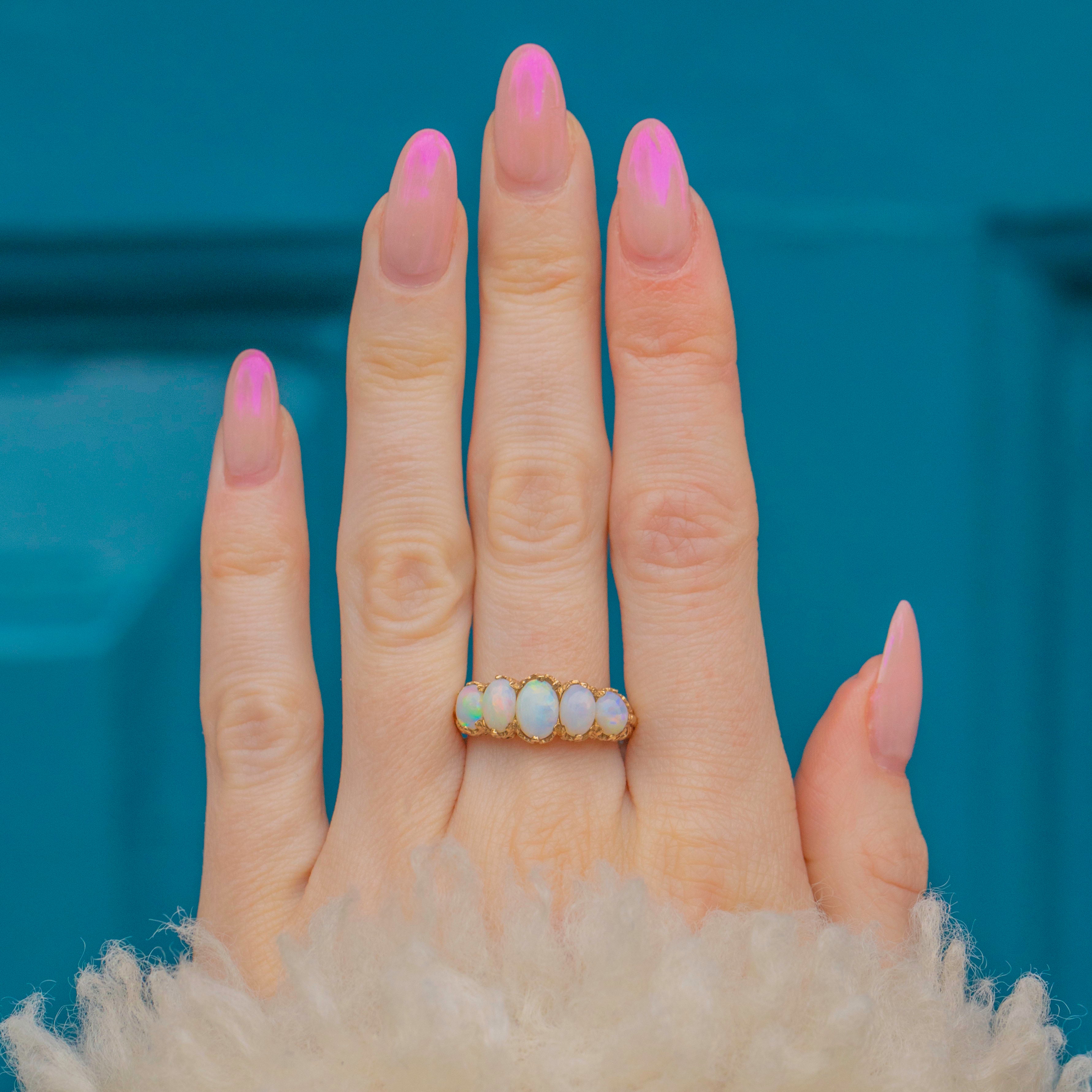 This 9ct Gold Opal five stone ring is simply stunning! Boasting five iridescent Opals that spread the width of your finger, this vintage ring is a truly eye-catching piece.