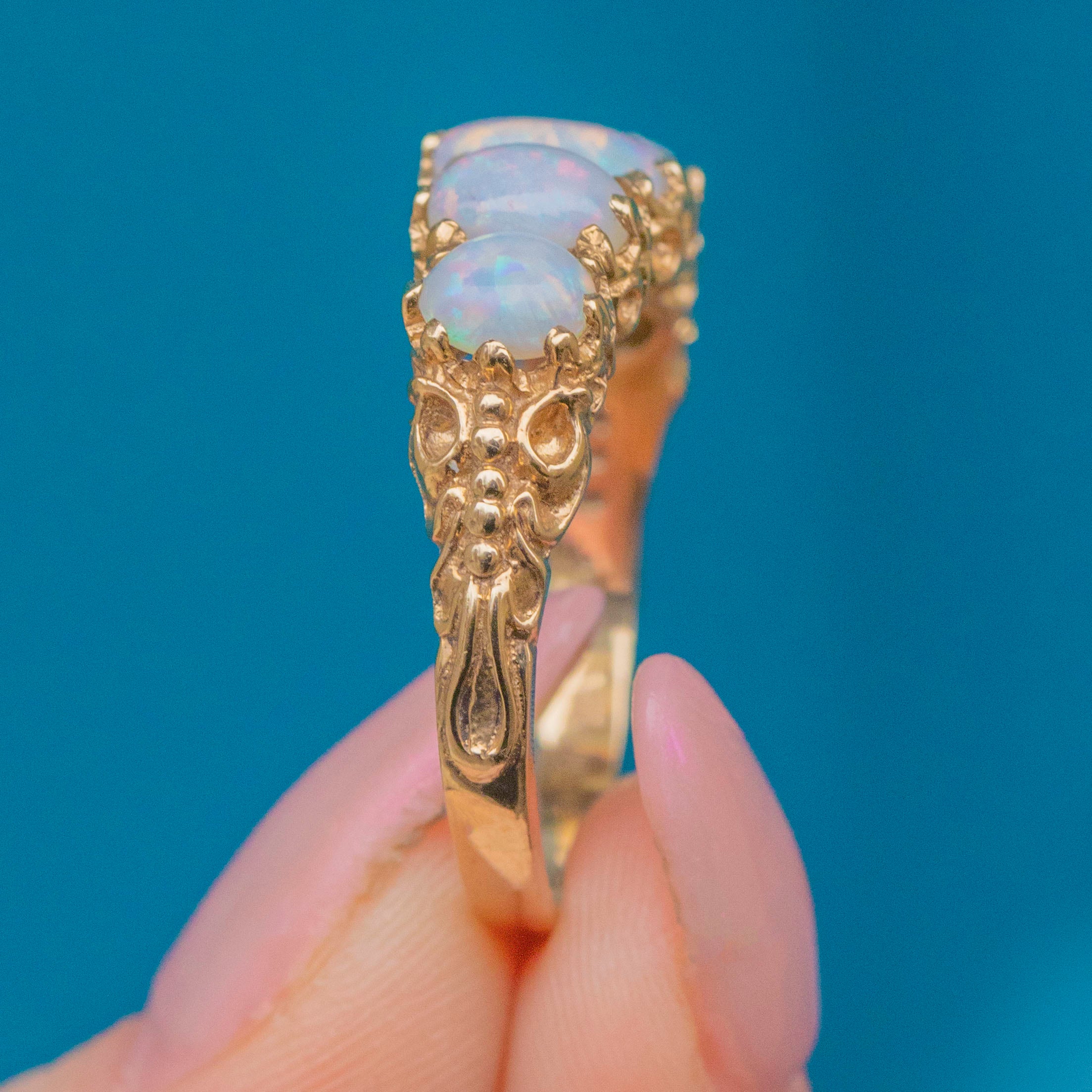 Each creamy Opal boasts a kaleidoscope of magical colours, ranging from glowing purples to striking greens and oranges. With a warm 9ct Gold shank and ornate gallery, this glossy vintage ring can be admired from every angle. Gliding smoothly onto your finger, she is a dream come true!