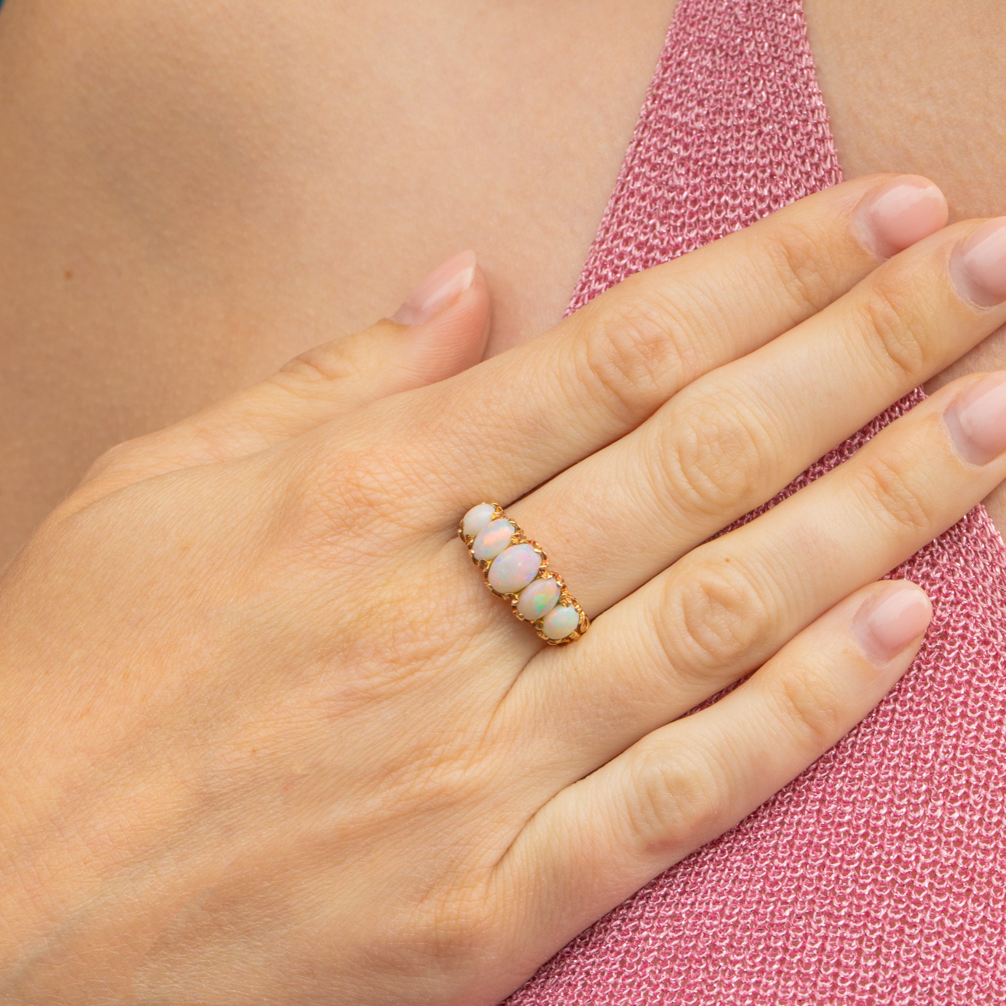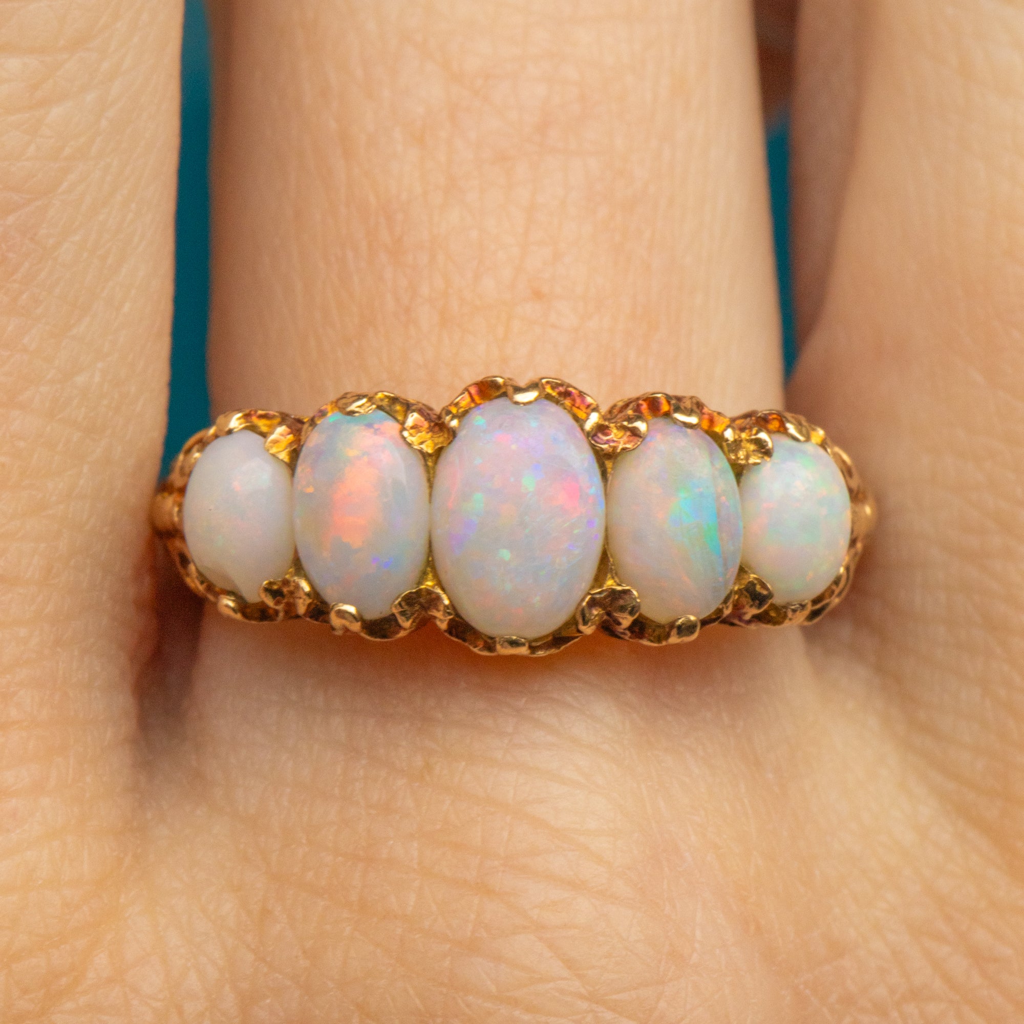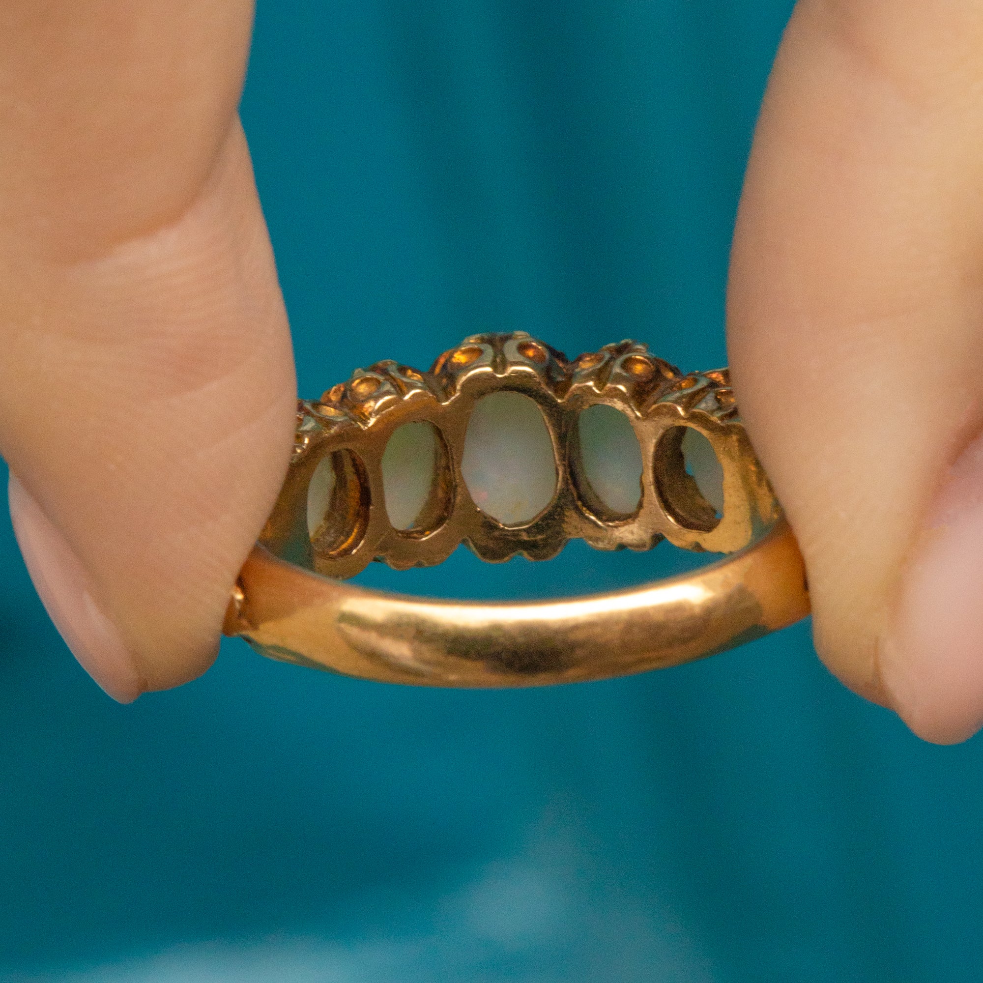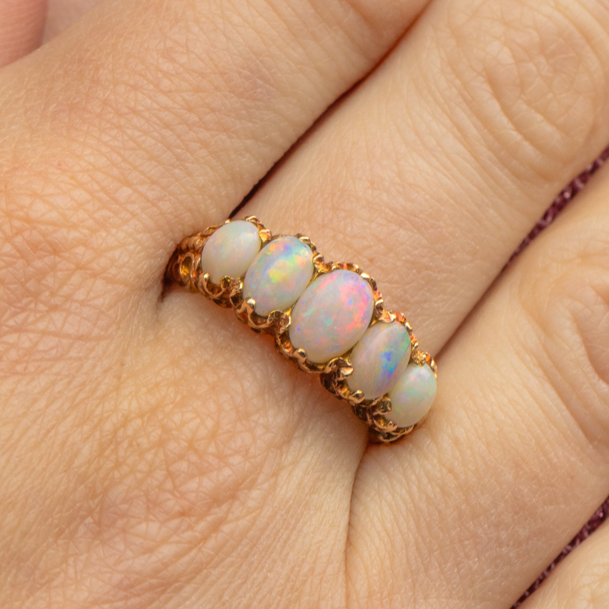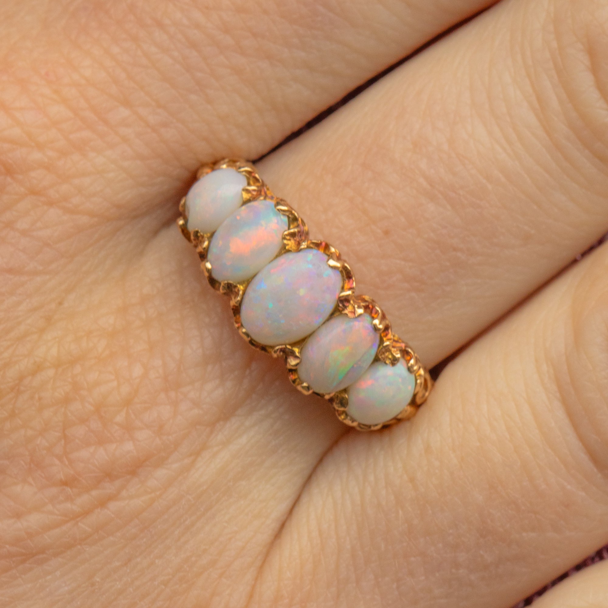 A stunning antique 9ct Gold Opal Diamond five-stone ring to bring you all the right kinds of attention! With a total spread of 1.51ct, each Opal boasts glowing purples, blues and greens, with mesmerising flashes of iridescence appearing under the light.