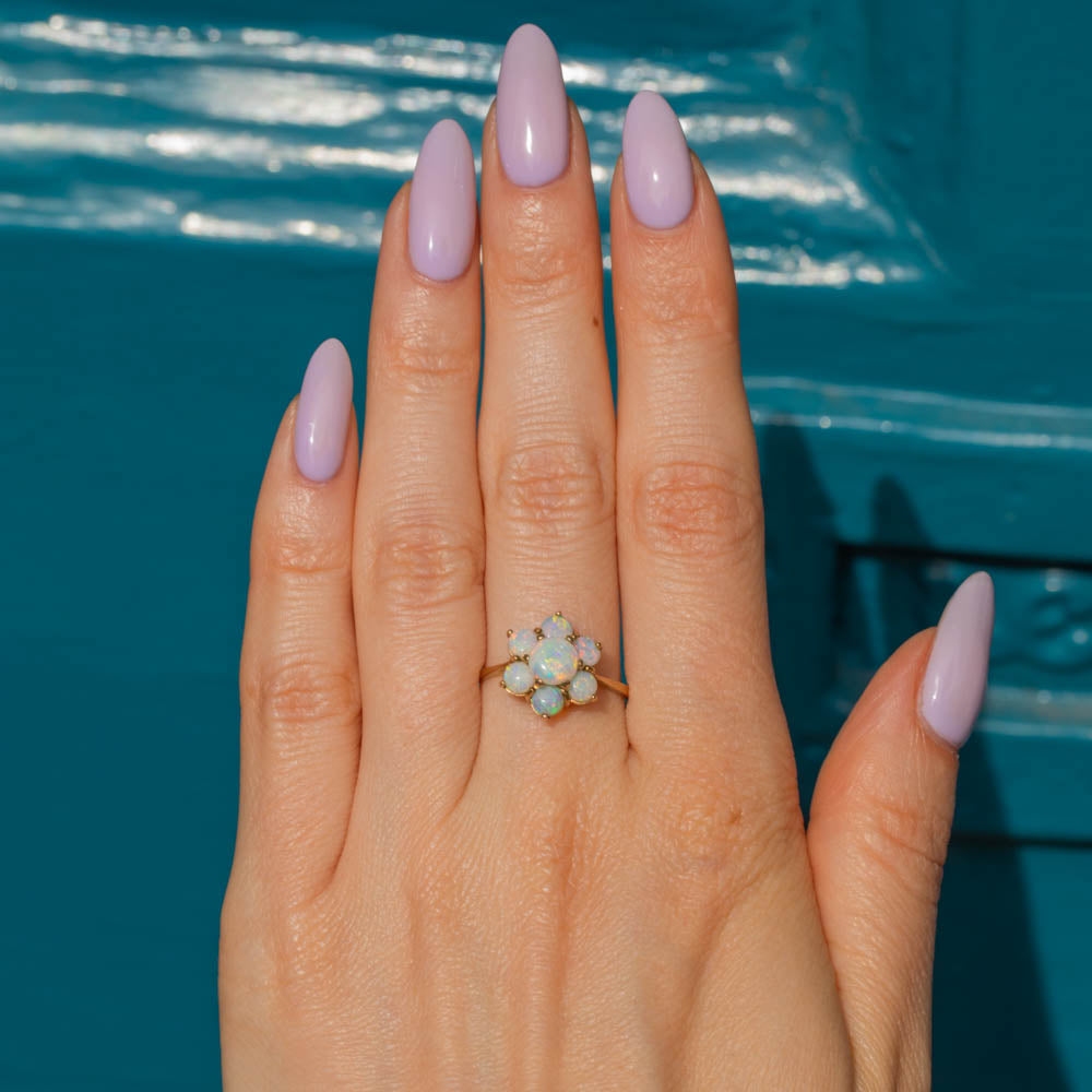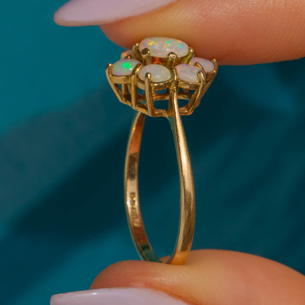 EXCELLENT. With nothing to report, this 9ct Gold Opal flower cluster ring is in excellent condition. The Opals are secure, smooth to the touch and offer a spectacular display of colour. The Gold has a rich saturation and forms the ring band perfectly. She's ready to adorn your hand straight from your pink Lillicoco box!