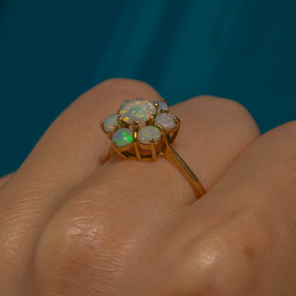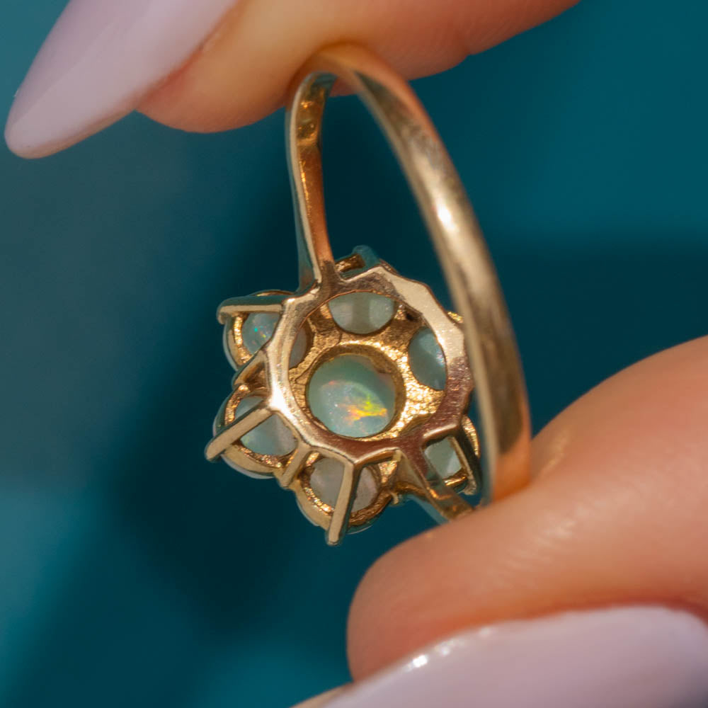 This 9ct Gold Opal flower cluster ring is bursting with vivacious hues! With punches of green and flashes of peach, this Vintage Opal ring will bring character to your ring stack.