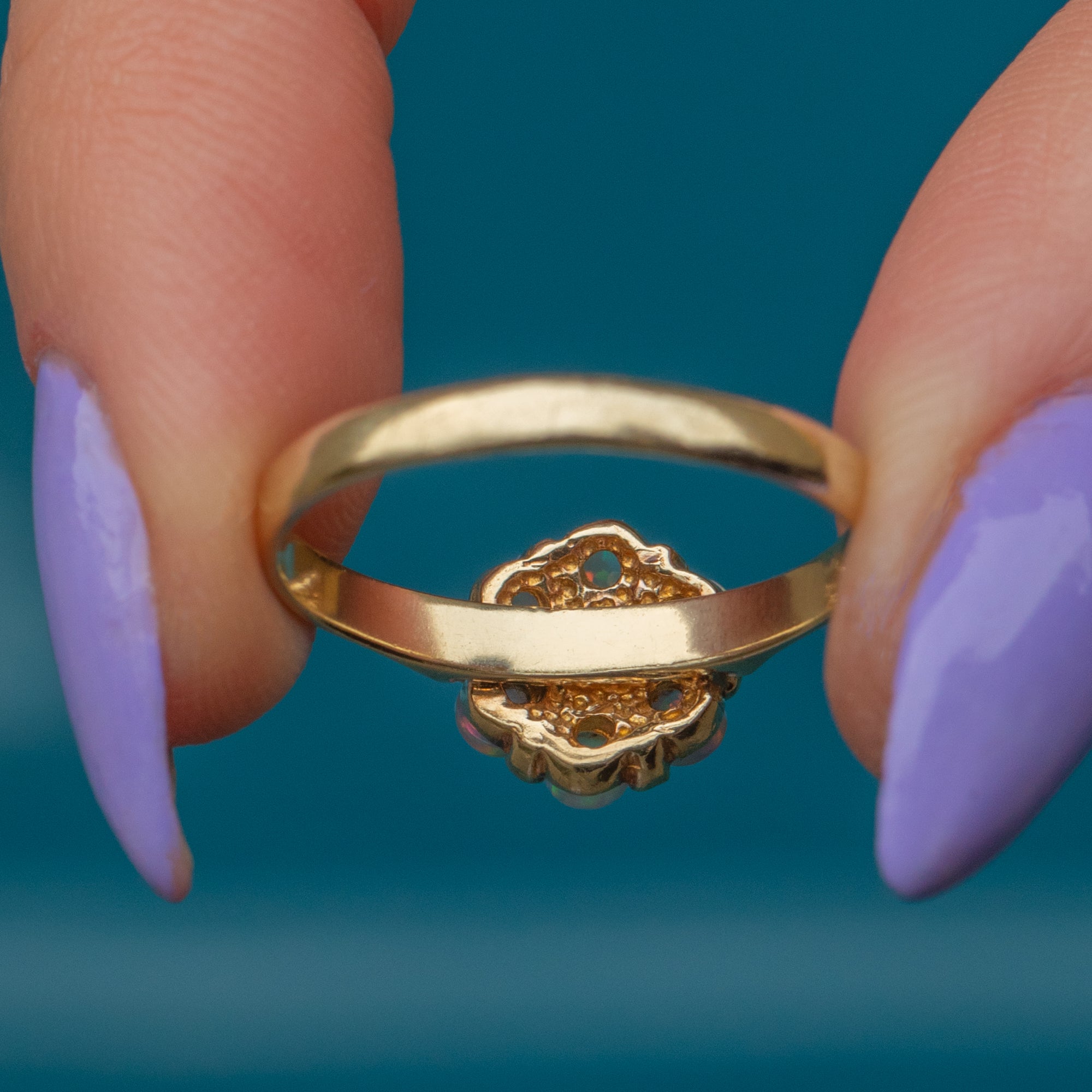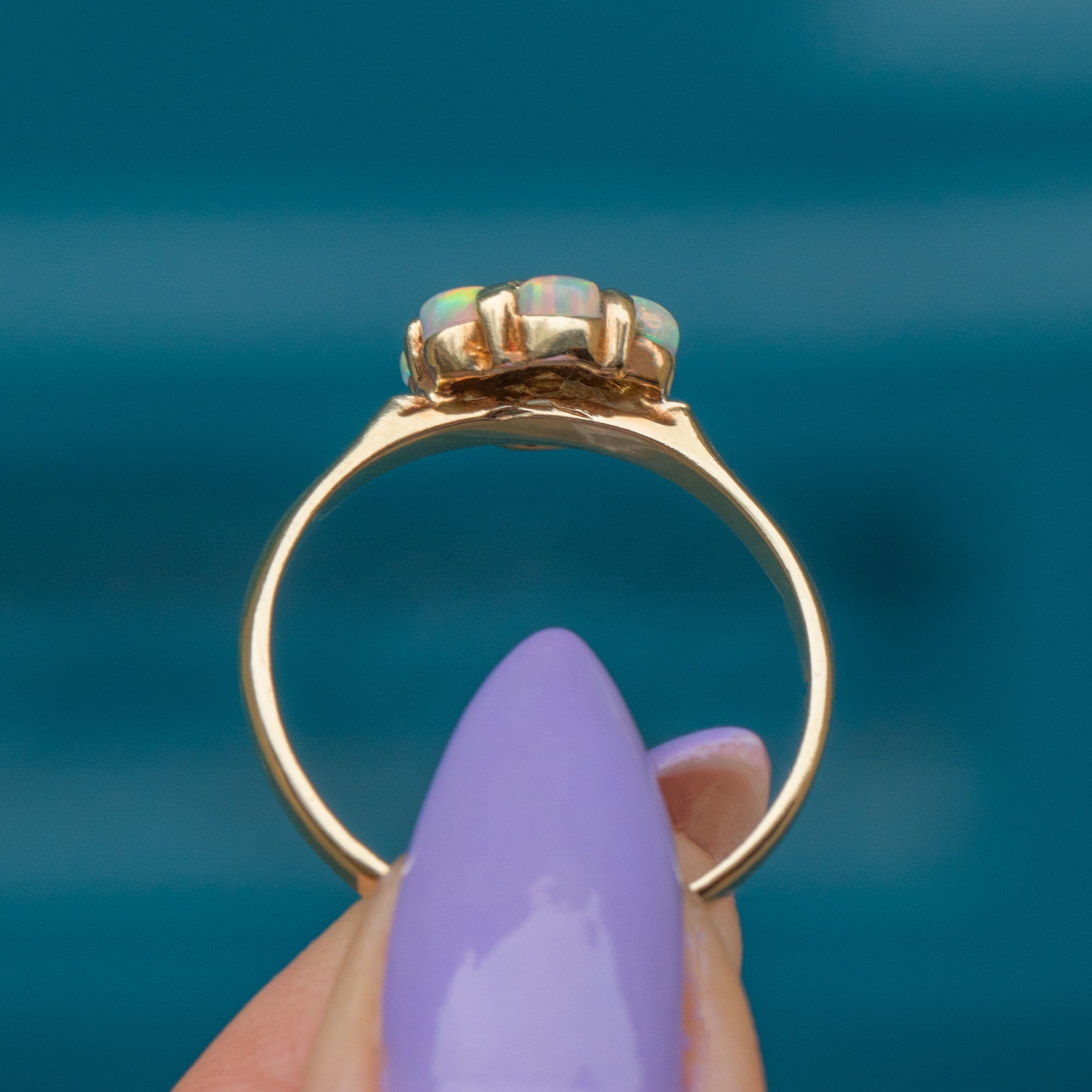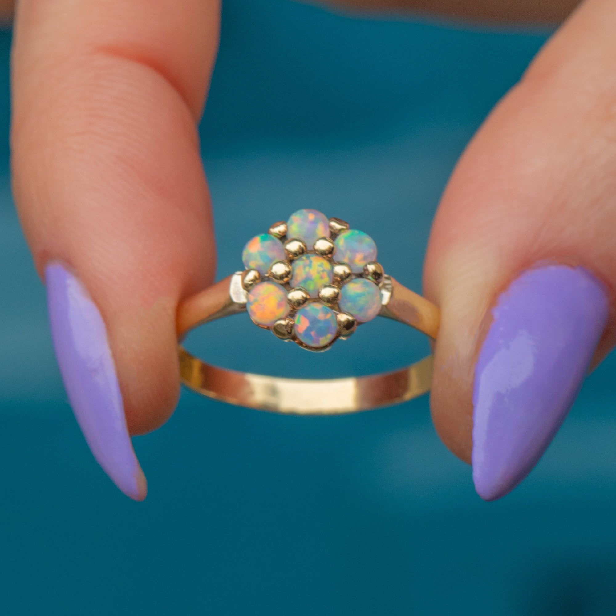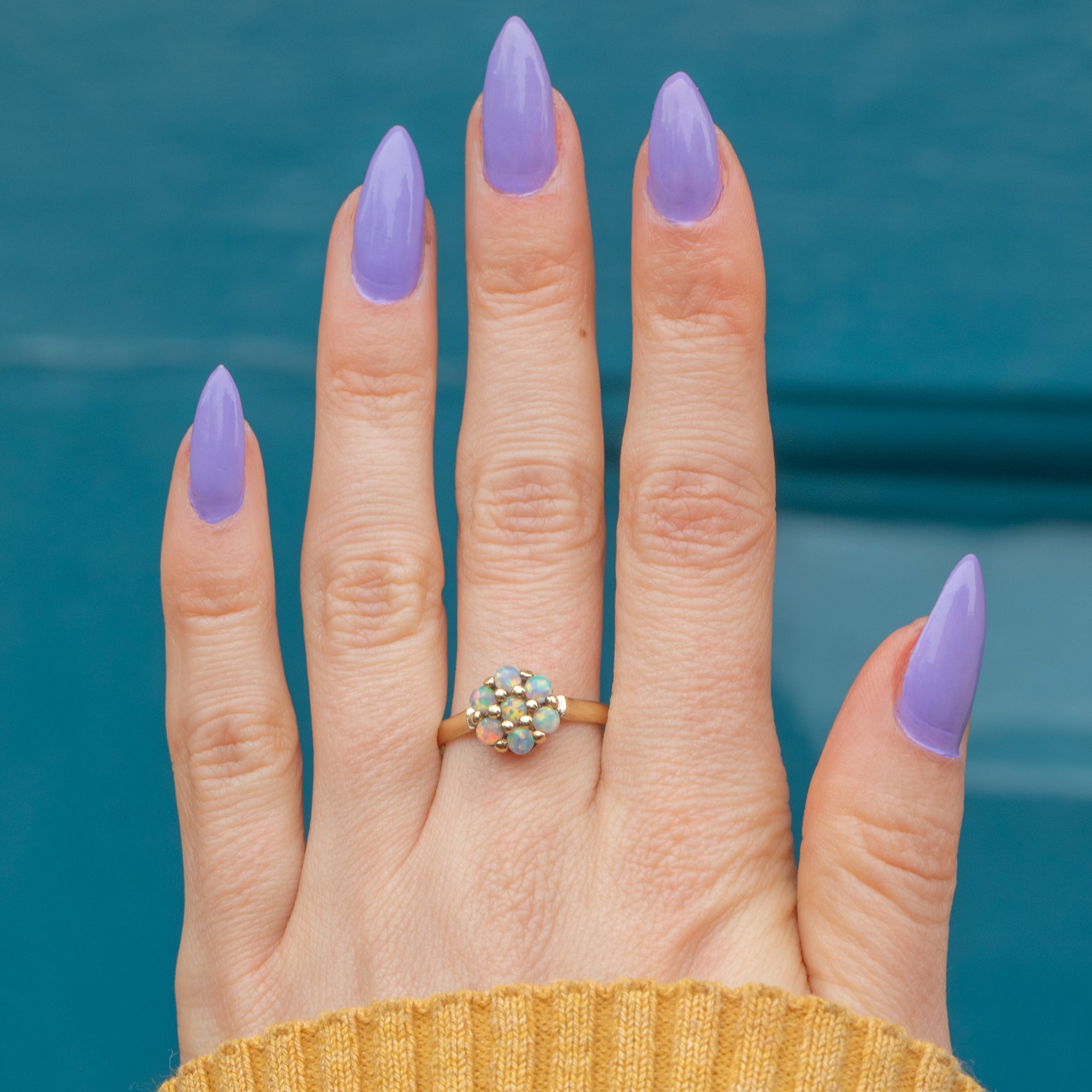 Each iridescent Opal radiates soft blues and green with striking flashes of peach, bringing character and charm to your ring stack. Crafted into a dainty flower motif, this Opal cluster ring is sure to become a top pick within your jewellery collection!