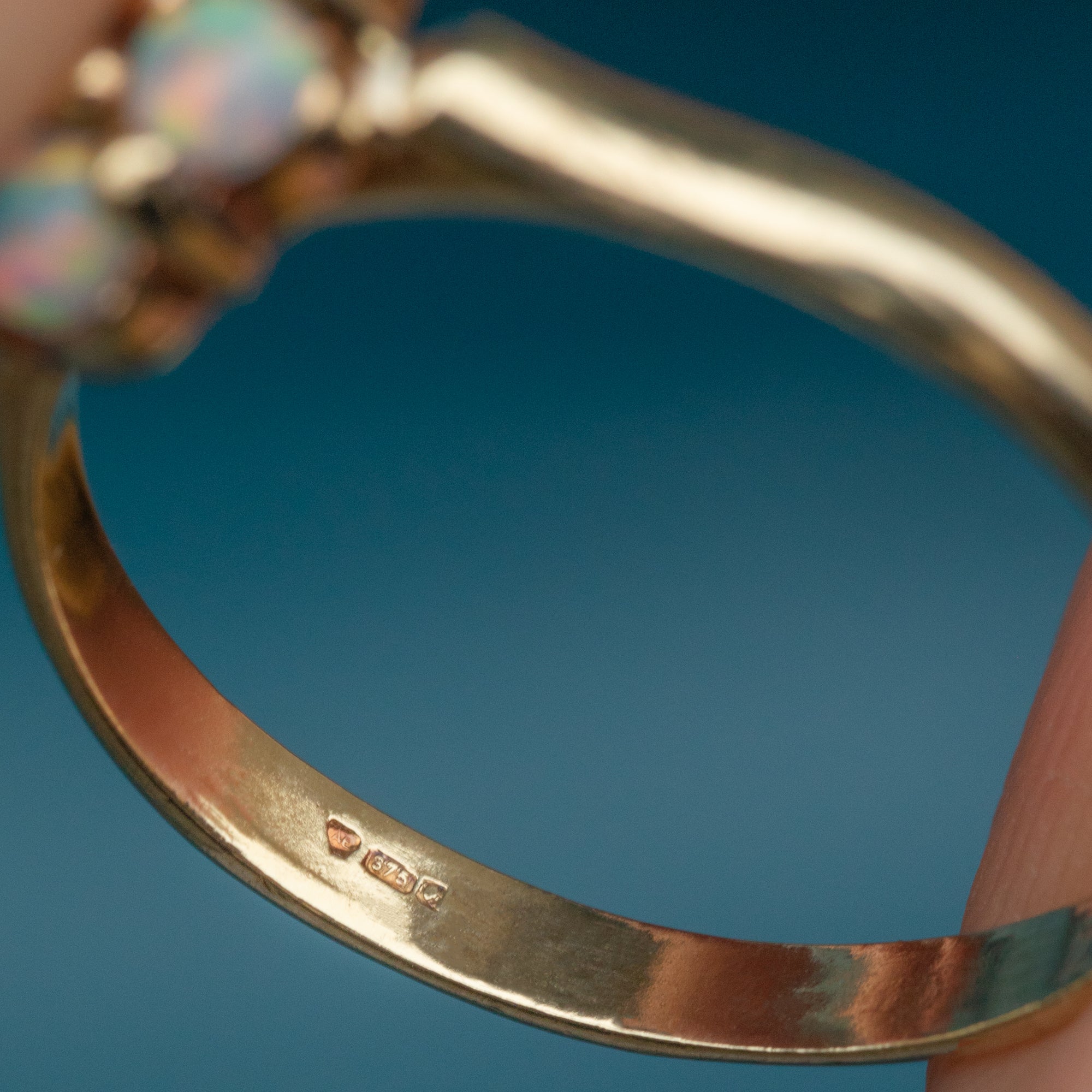 VERY GOOD-EXCELLENT: This 9ct Gold Opal flower ring is in lovely condition. Each Opal is securely set with radiant pops of colour. There are some minor signs of wear to the settings and band commensurate with age, though this is difficult to spot without a loupe. In great condition, she is a must-have.