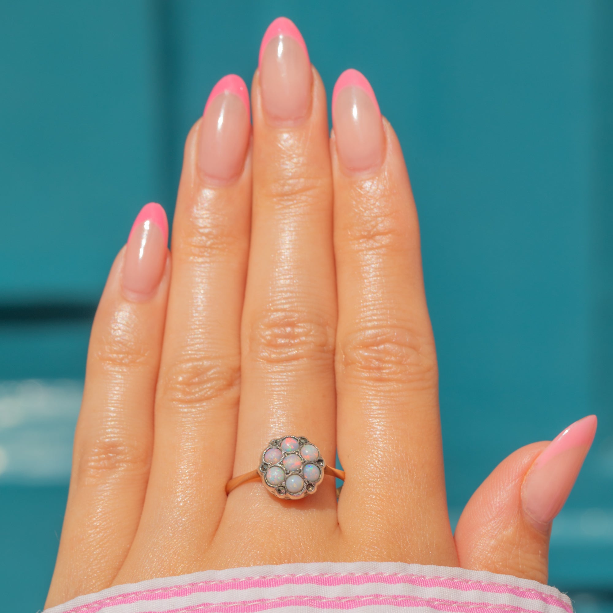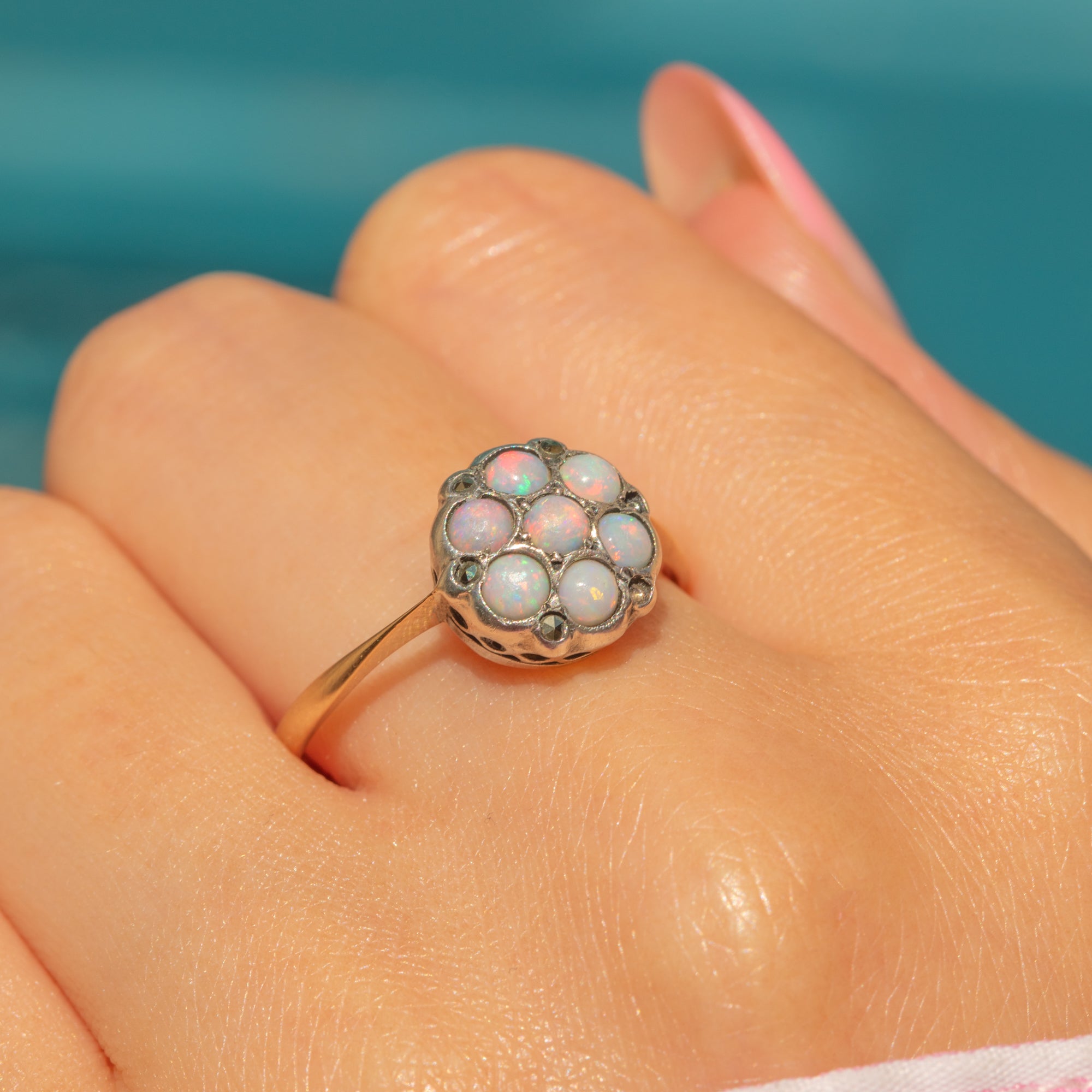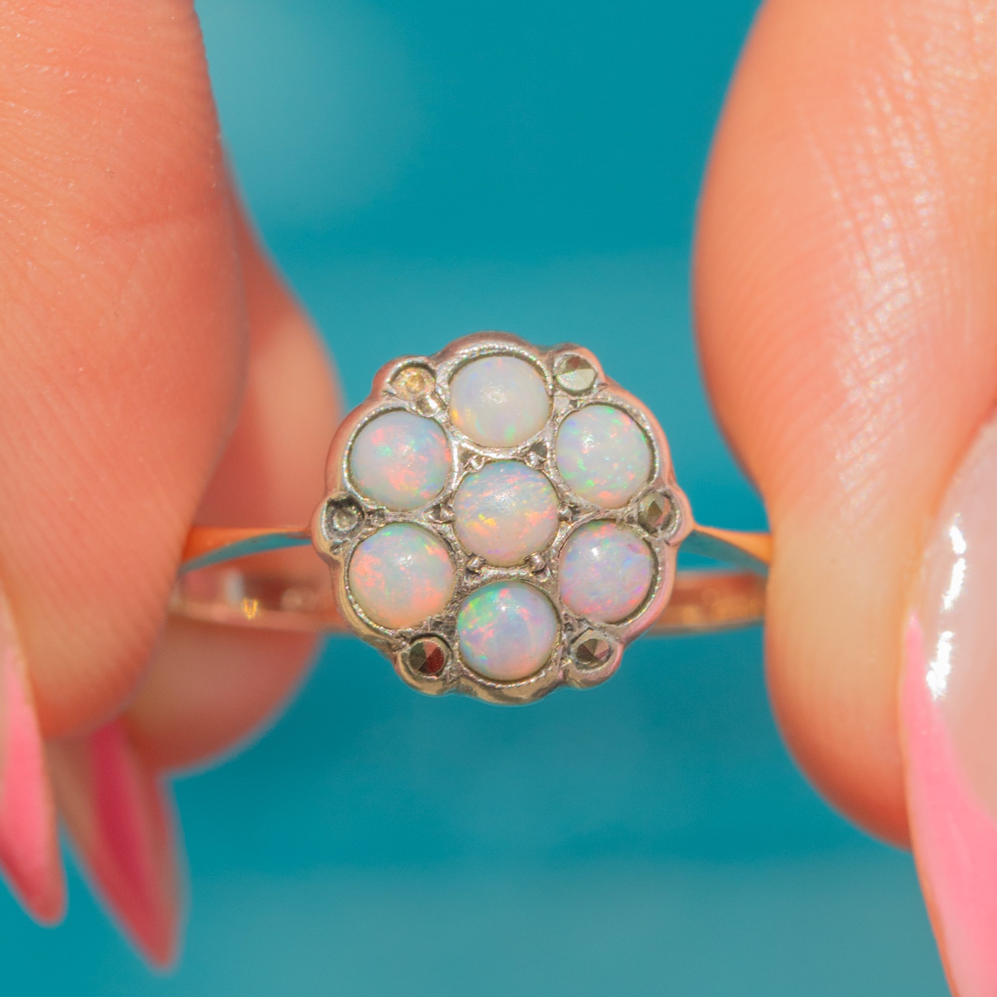 An adorable 9ct Gold Opal flower cluster ring! Comprised of a cluster of seven pastel Opals, each with a distinct lilac and sky blue hue, this vintage ring is a beautiful, dainty delight.