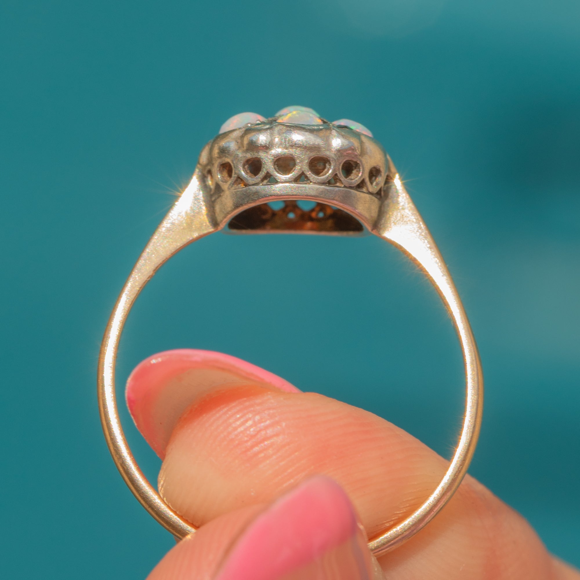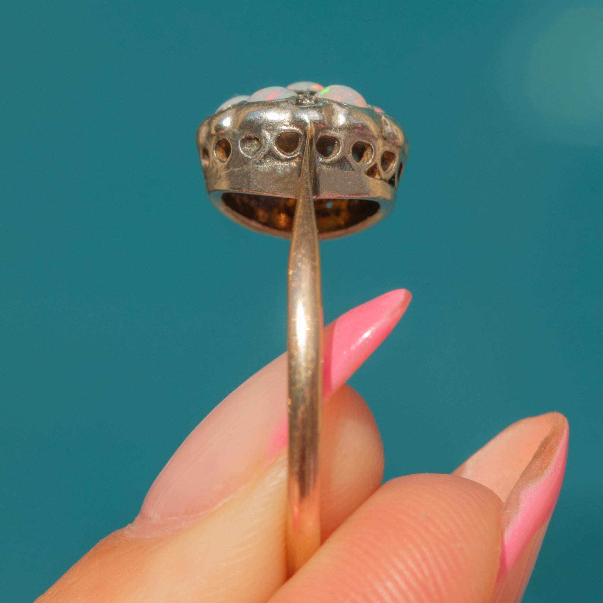 VERY GOOD: This vintage 9ct Gold Opal flower cluster ring is in very good condition. Each Opal is radiant and secure in its setting, and though there are some small fleabites, these are difficult to see without a jeweller's loupe. There are some significant signs of discolouration to the back of the ring face however, this cannot be seen when the ring is worn. A lovely piece, this cluster ring will make a sweet addition to your collection!