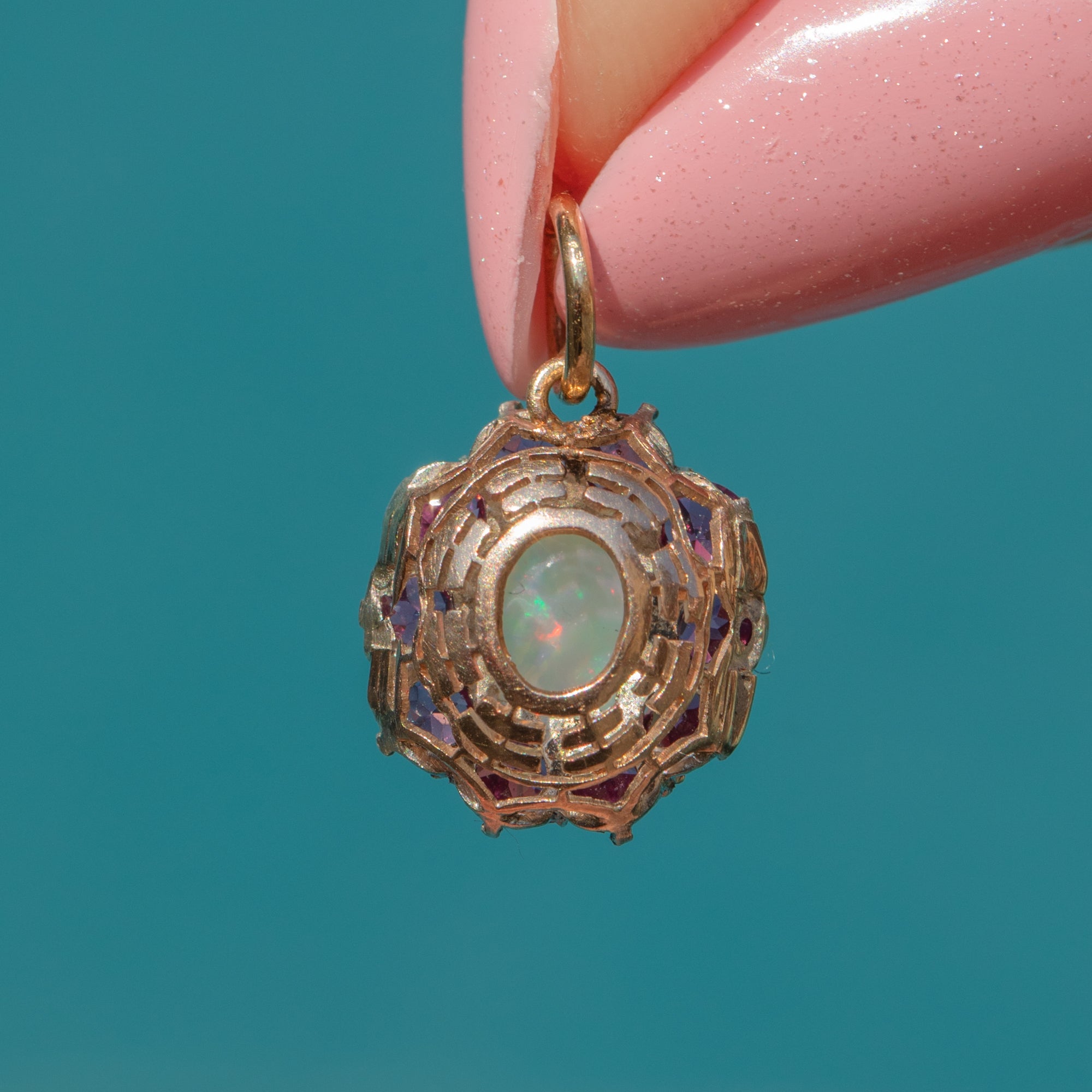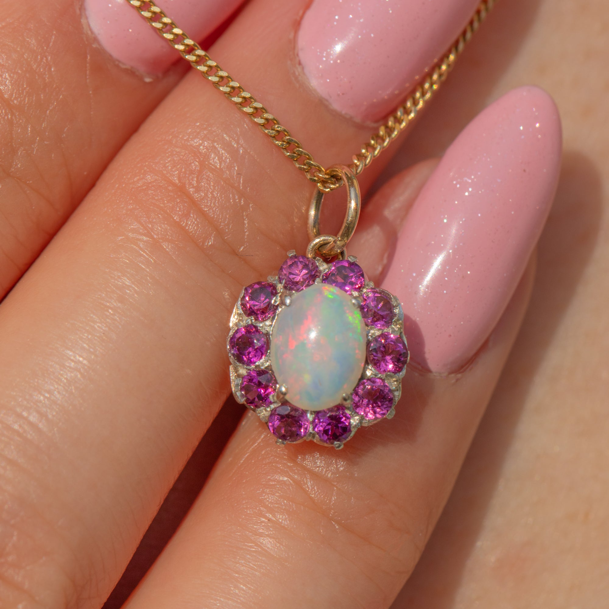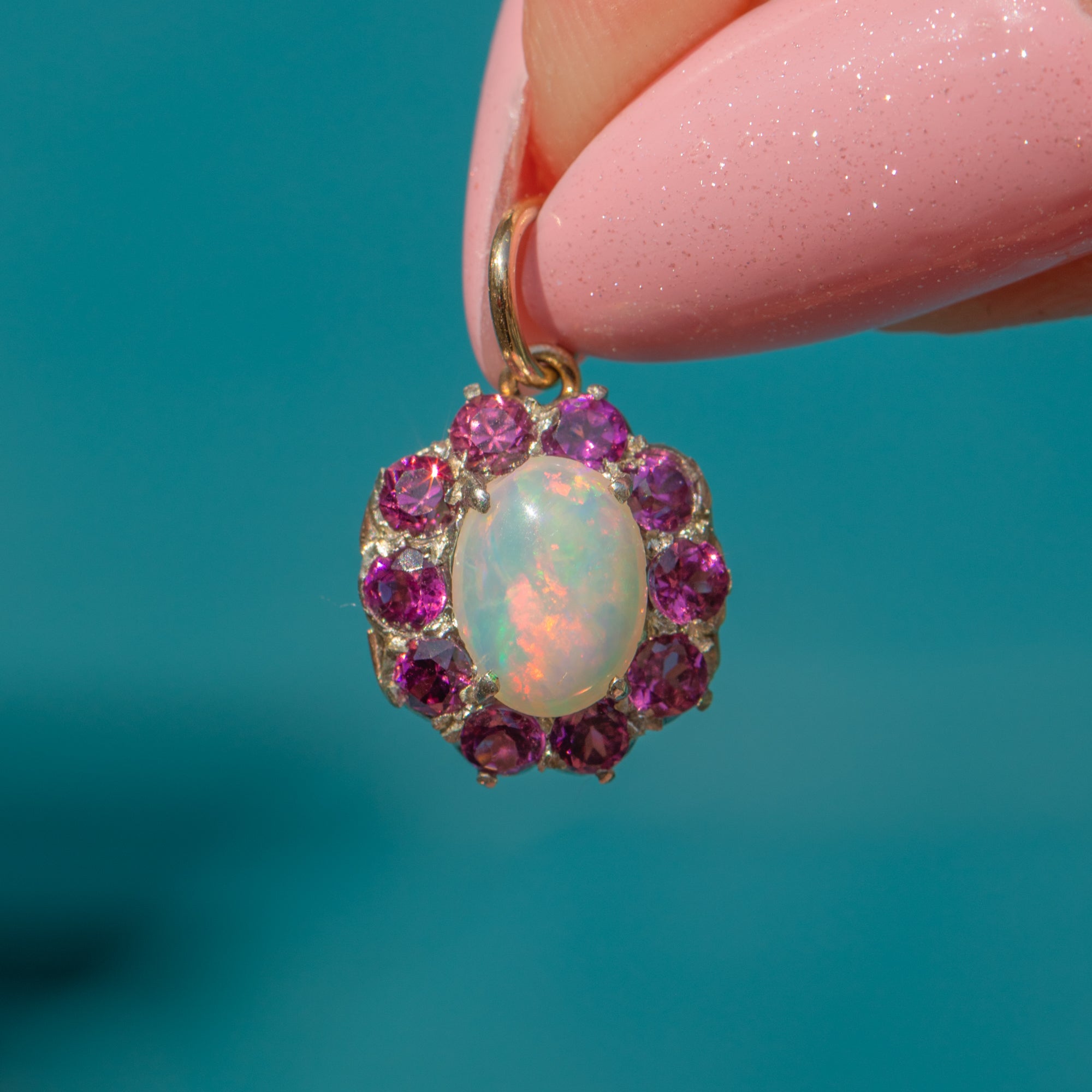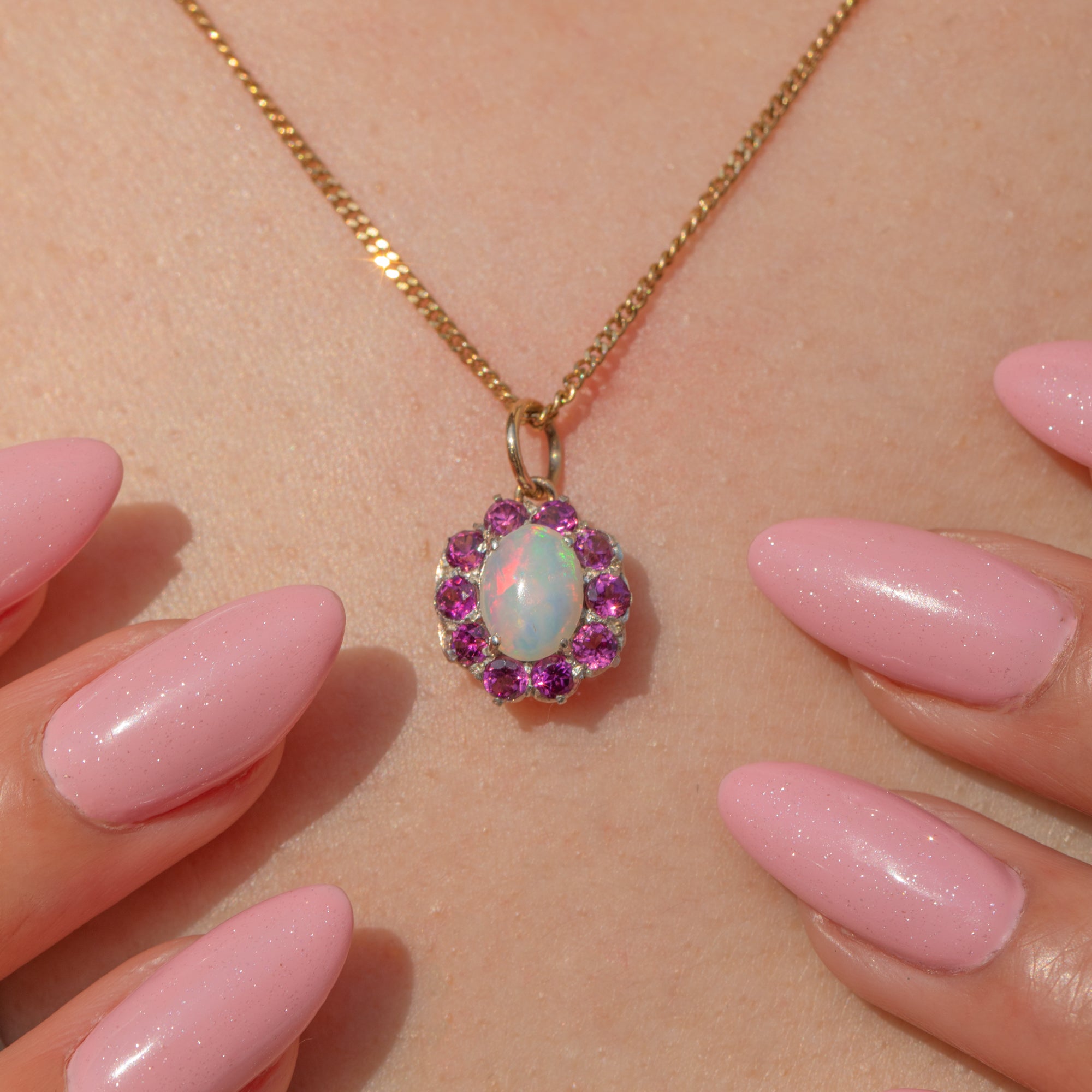 This 9ct Gold Opal Rhodolite Garnet cluster charm is endlessly pleasing to look at! Displaying a vivid Opal cabochon haloed by fuchsia-hued Rhodolite Garnets, this Art Deco pendant is a vibrant little treasure brimming with feminine charm.
