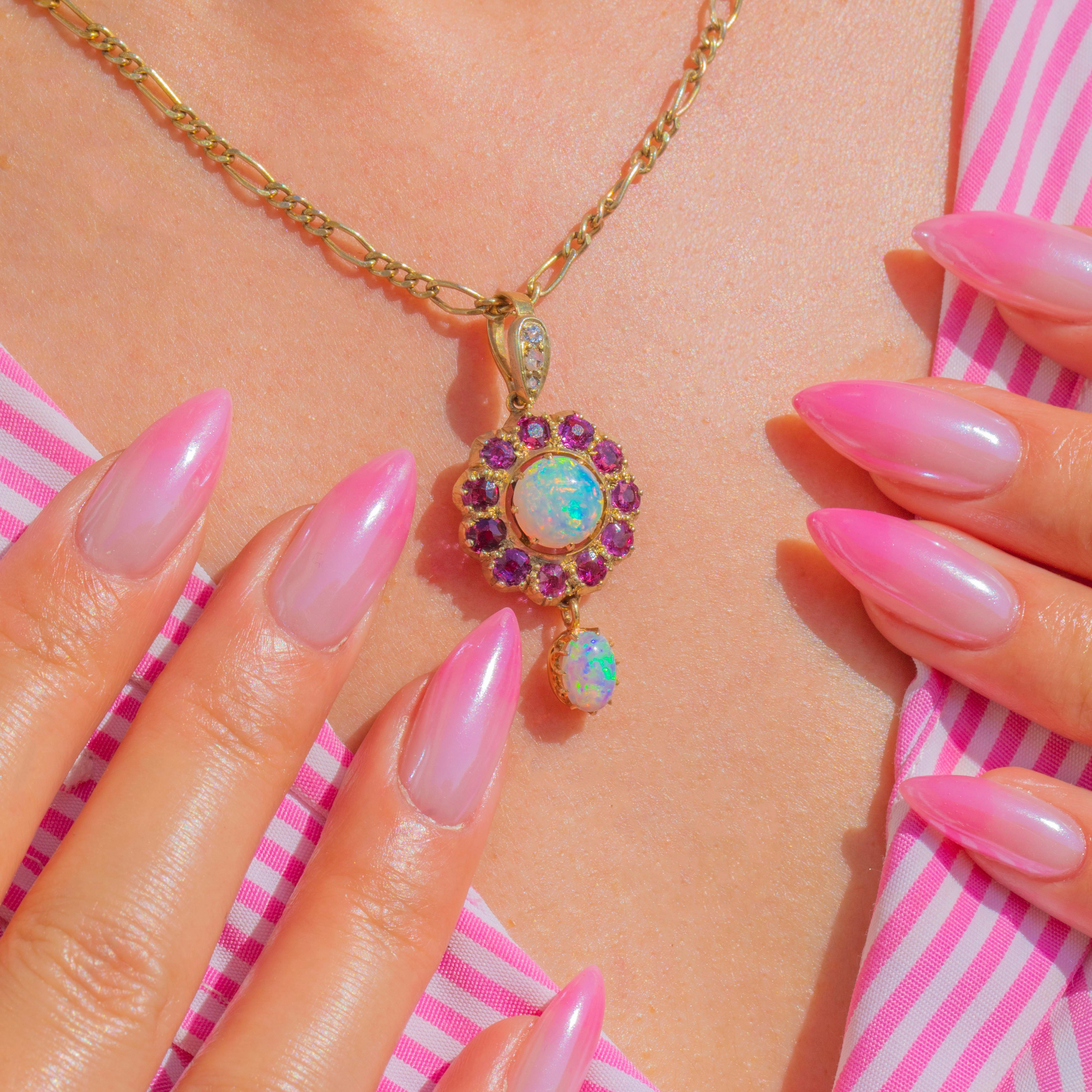 Glimmering with romantic colour and movement, this Victorian 9ct Gold cluster drop pendant centres on a luminous round Opal cabochon, haloed by a vivid rosette of Rubies. A petite oval Opal is articulated beneath, catching the light with every step and echoing the ethereal play-of-colour above. Tiny Diamonds sparkle at the bail, adding a delicate flicker of brilliance to the warm Gold.