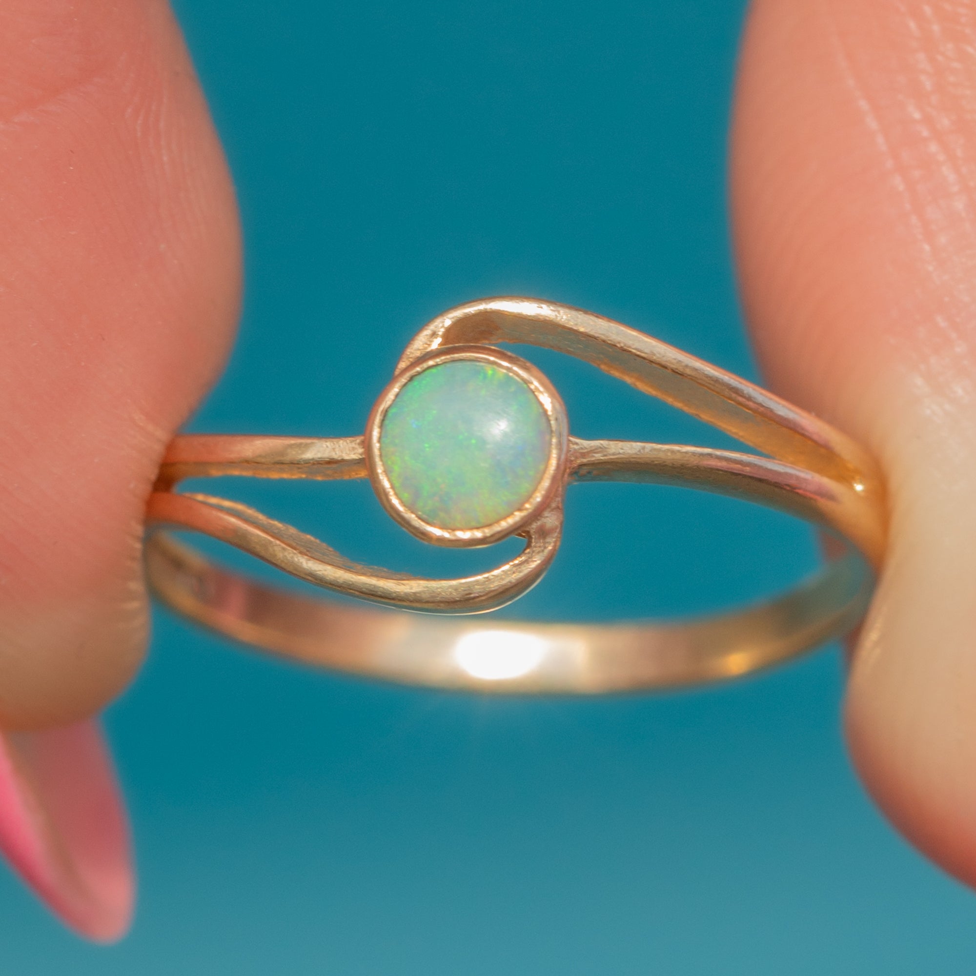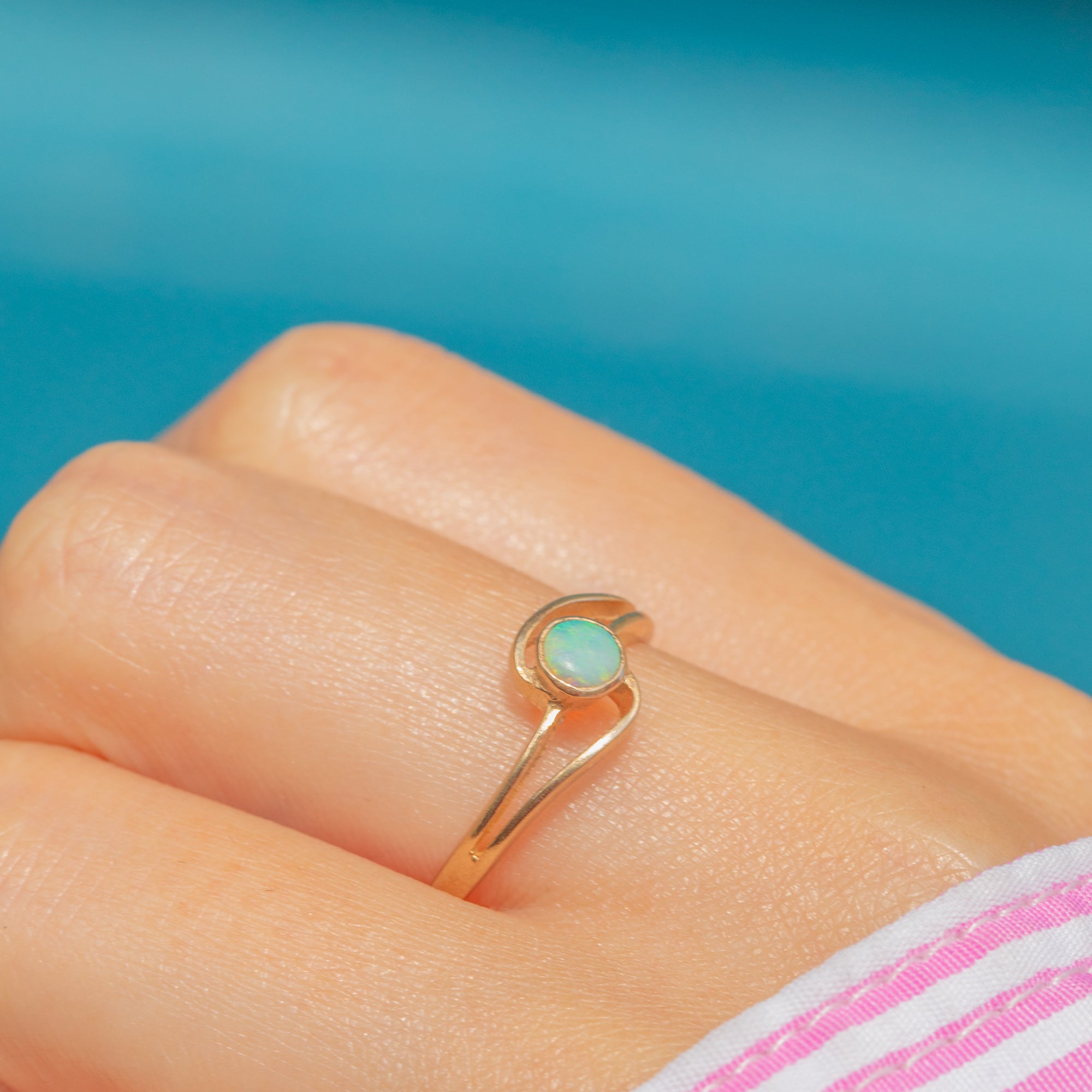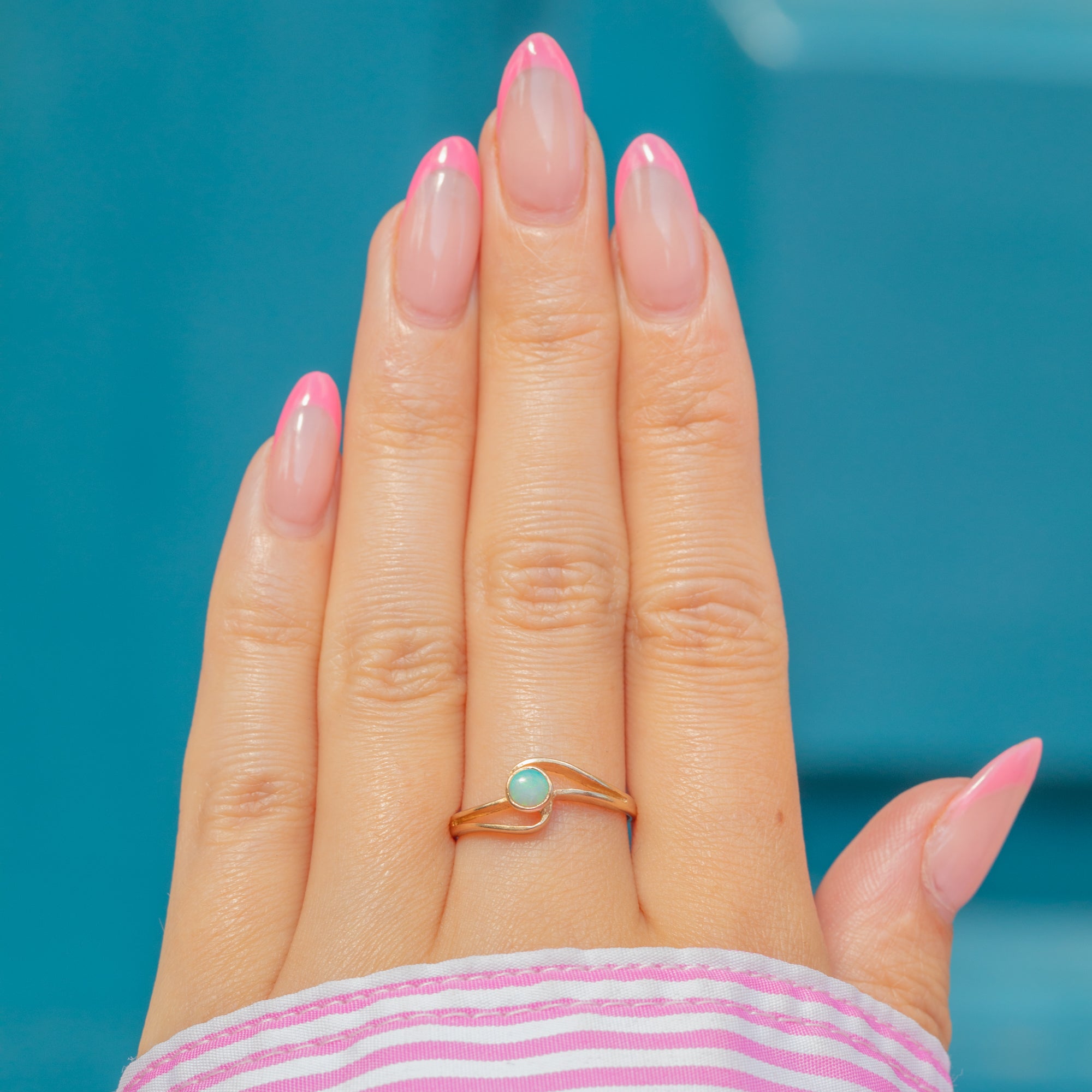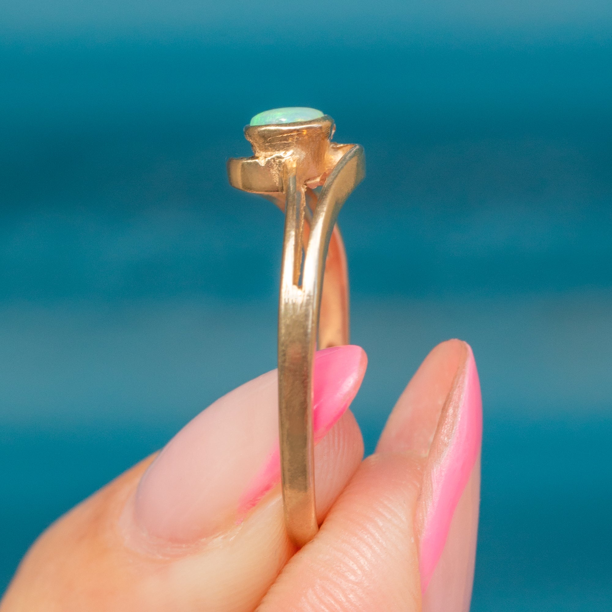 Crafted from buttery 9ct Gold throughout, this vintage twist ring frames a gorgeous petite Opal in her centre, radiating soft azure and vibrant green hues. Her twist bezel feature adds a lovely, elegant texture and depth to this dainty ring, drawing your eyes towards the Opal and allowing the ring to embrace your finger effortlessly.