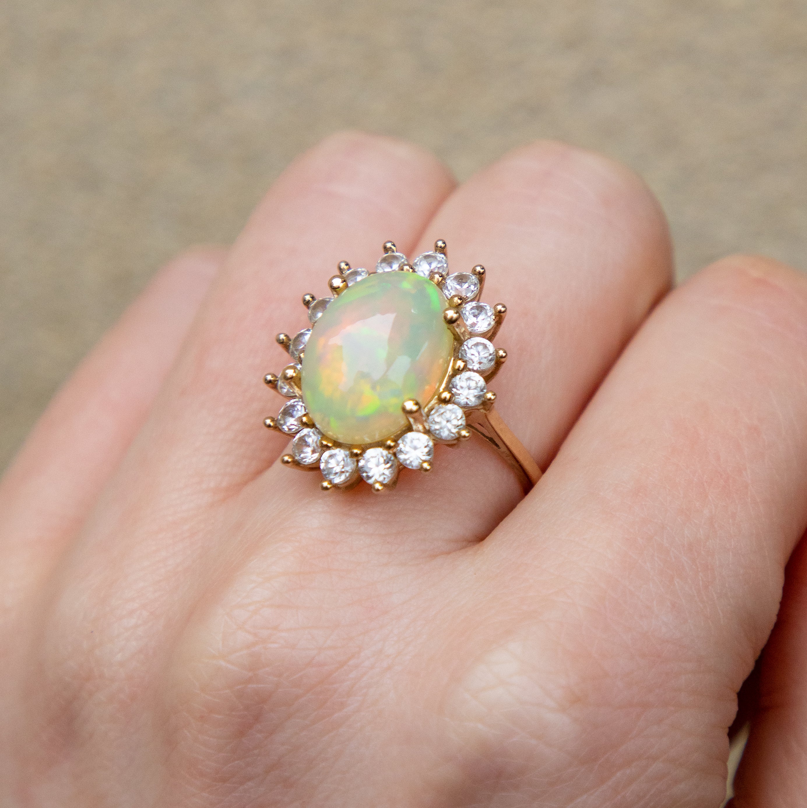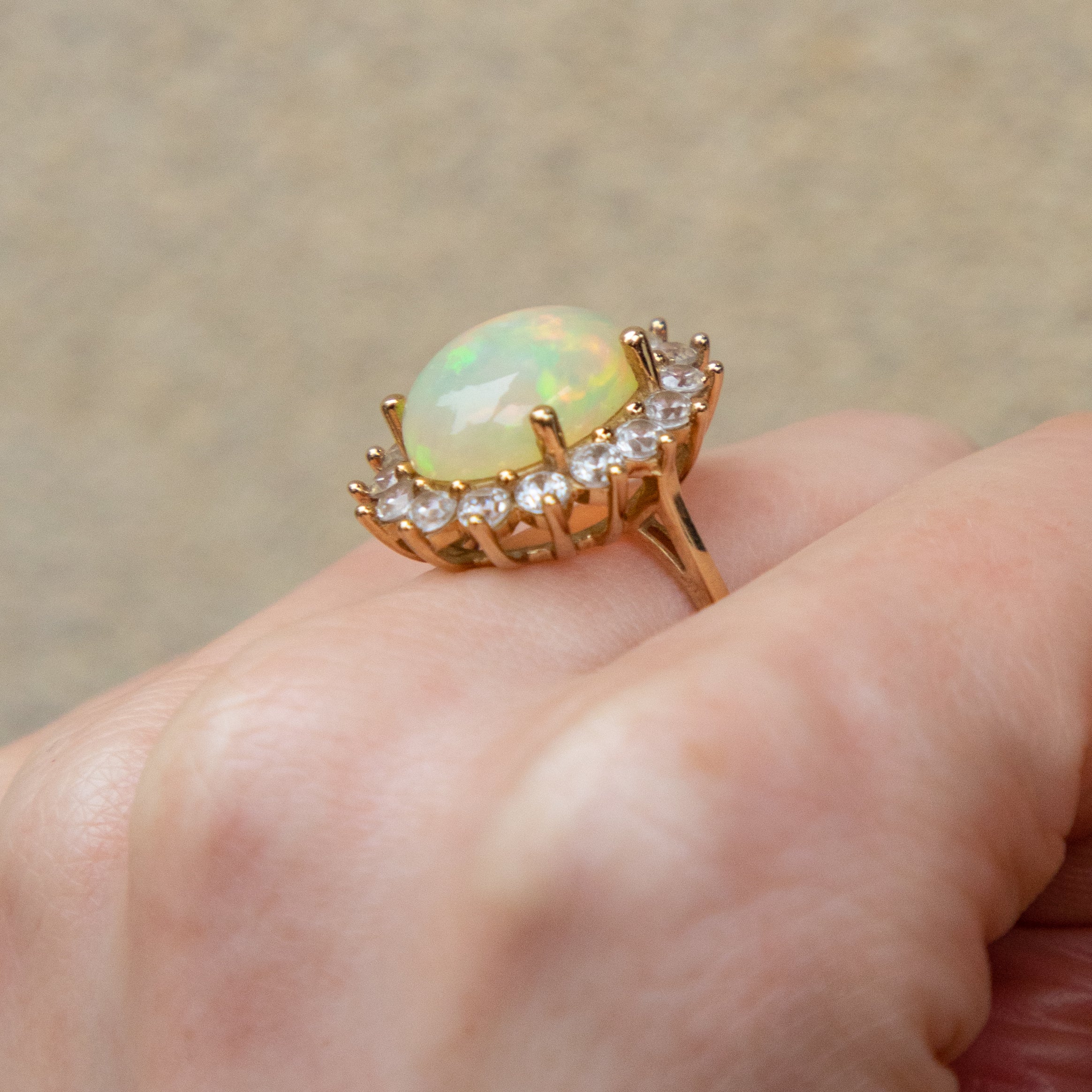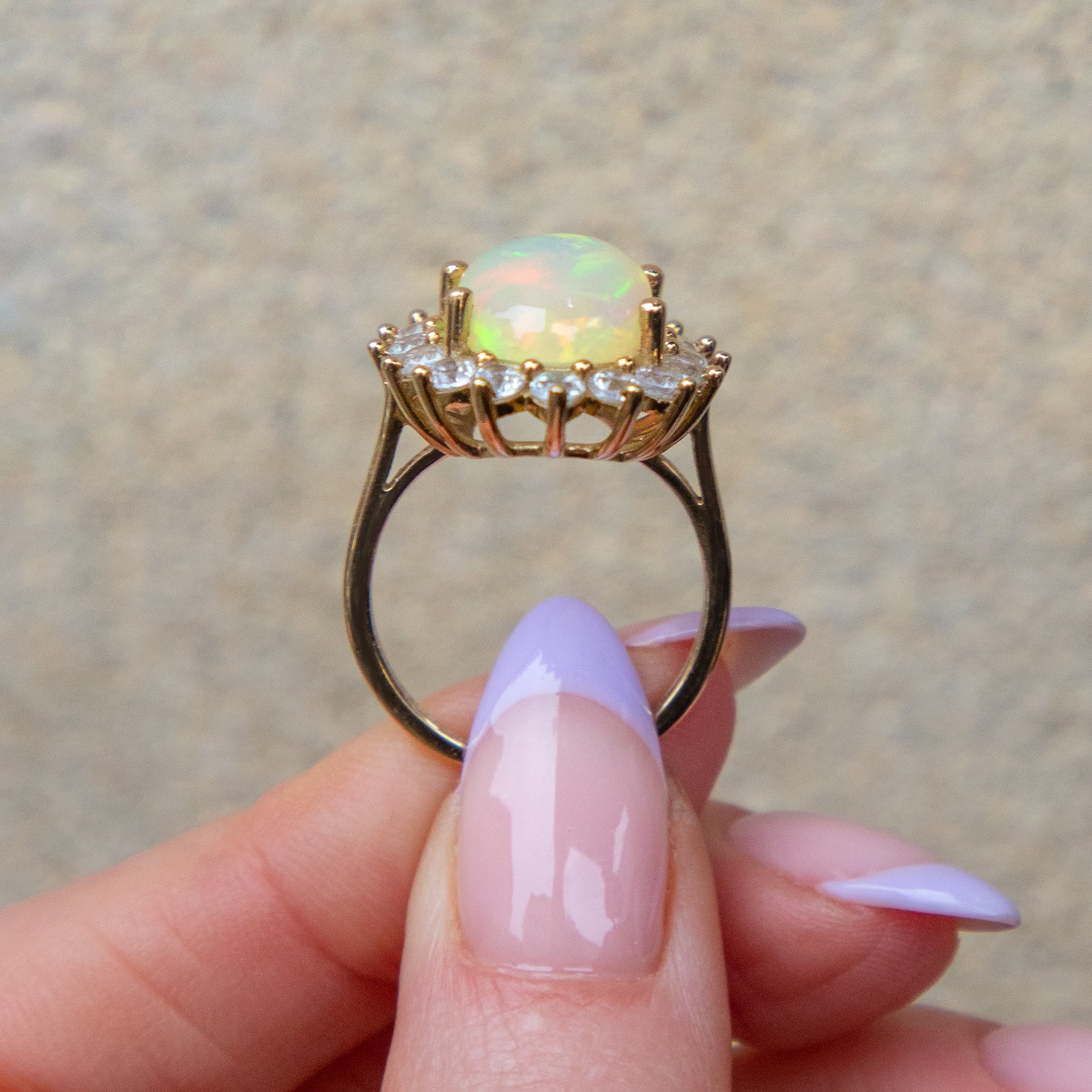 This exquisite 9ct Gold Opal & white Spinel cluster cocktail ring epitomises elegance and charm. The 4.30ct Opal exhibits a captivating play of colours, ranging from ethereal blues, green, orange and reds, while the white Spinel adds a wonderful sparkle.