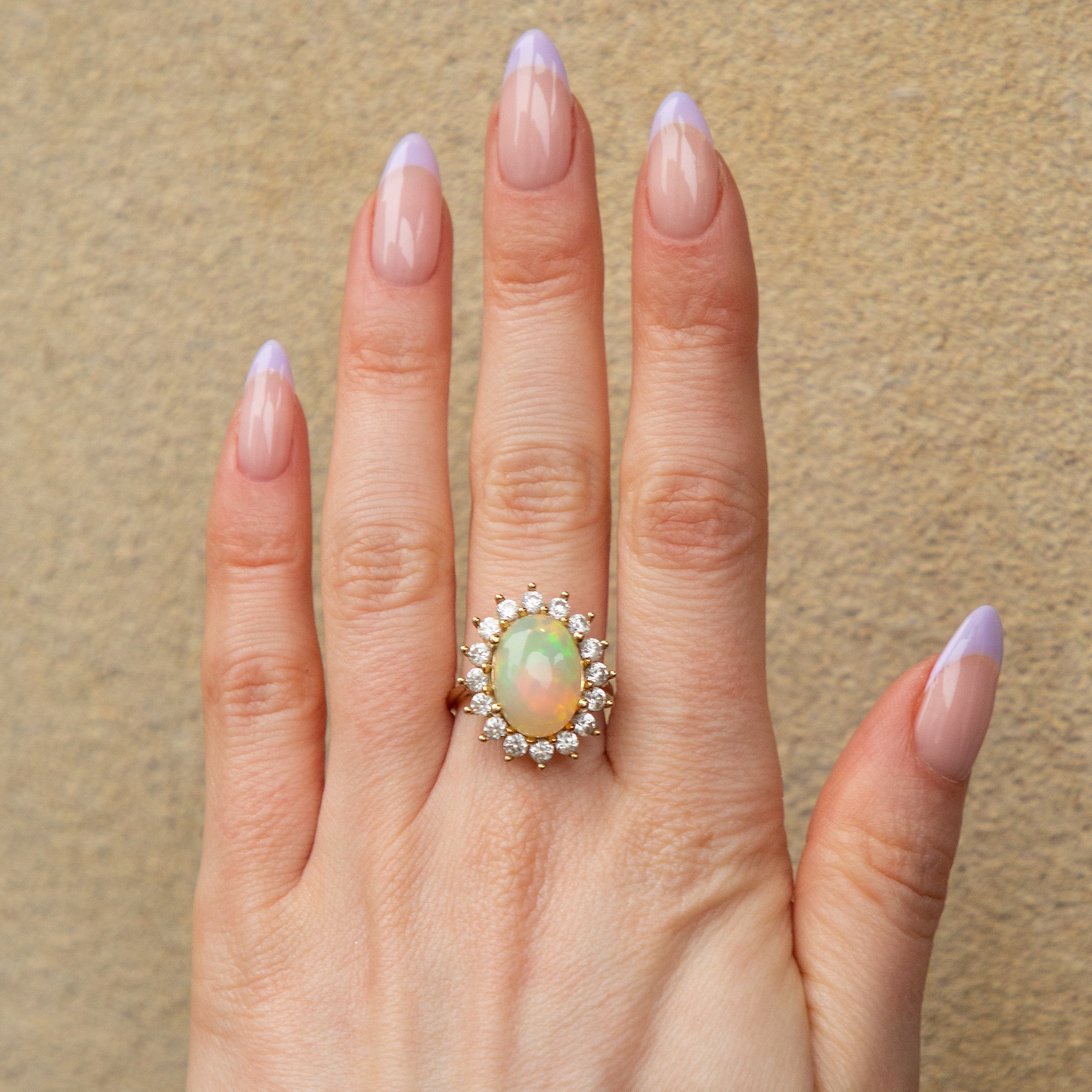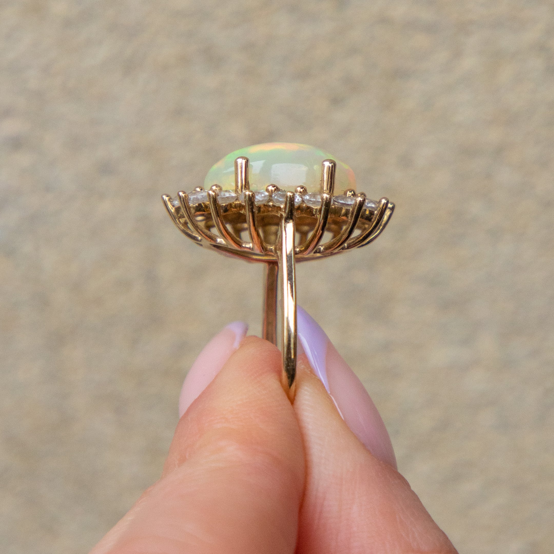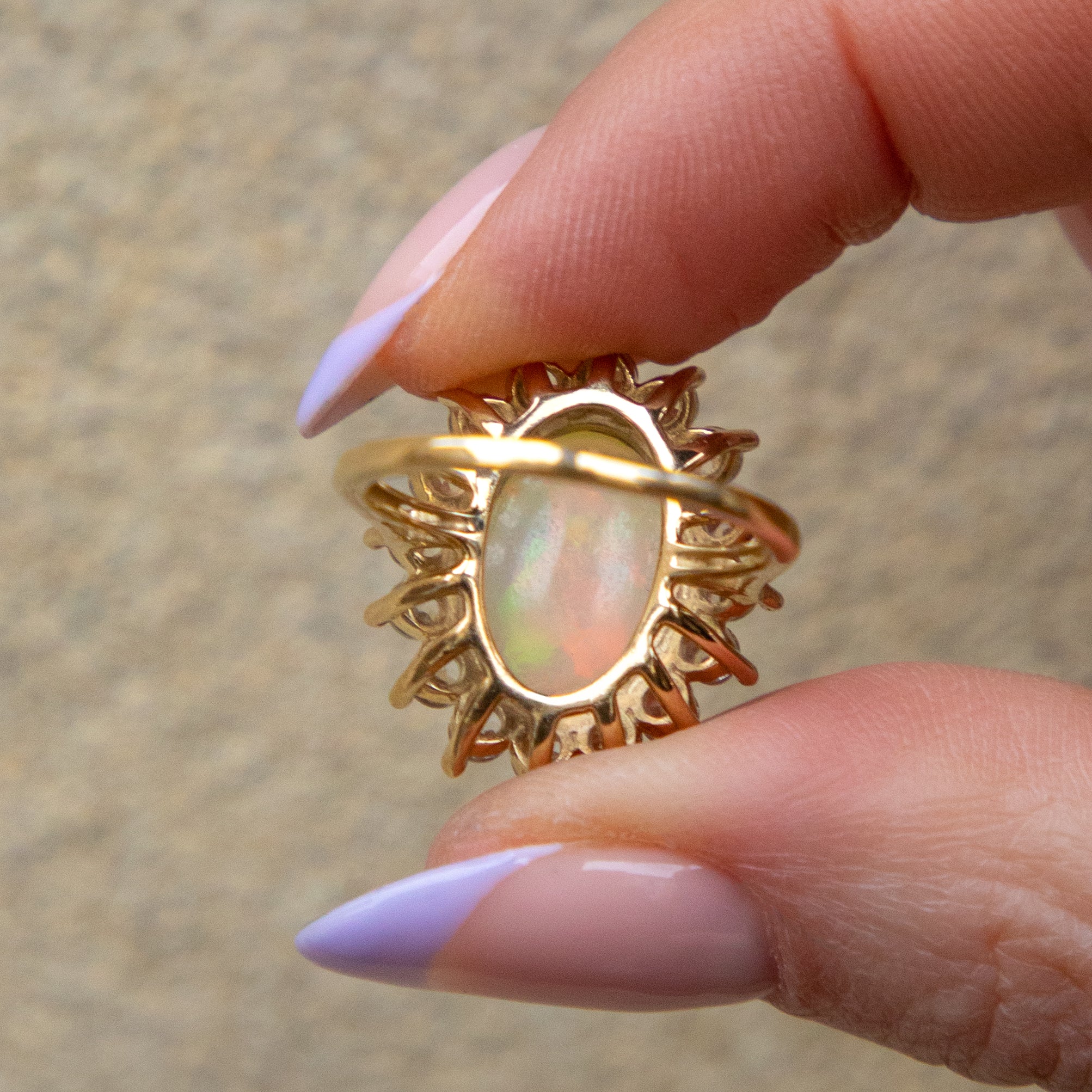 This exquisite 9ct Gold Opal & white Spinel cluster cocktail ring epitomises elegance and charm. The 4.30ct Opal exhibits a captivating play of colours, ranging from ethereal blues, green, orange and reds, while the white Spinel adds a wonderful sparkle.