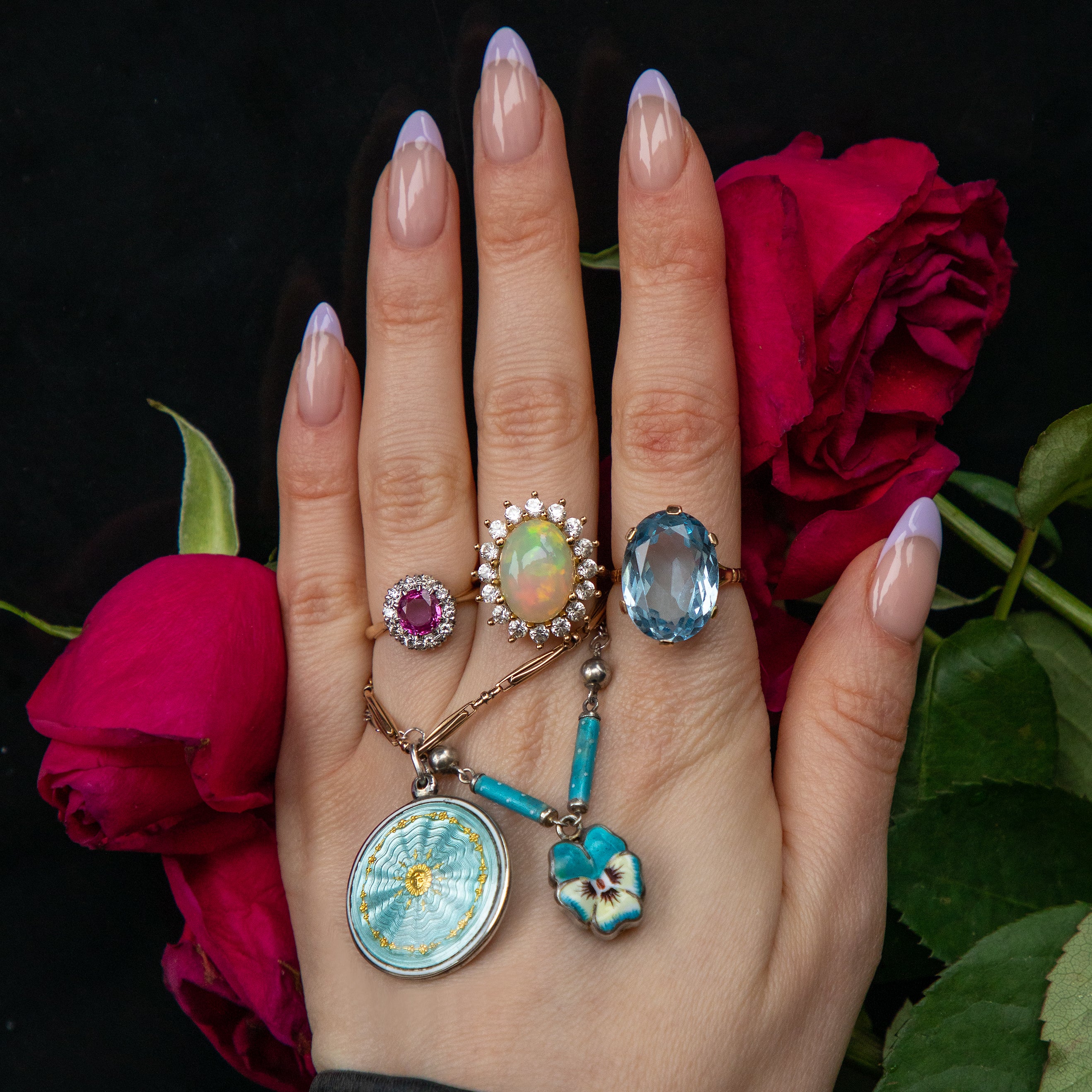 The combination of Opal and white Spinel creates a striking contrast set against the warm glow of the 9ct Gold band, making it a truly eye-catching ring. Perfect for adding a touch of glamour to any ensemble, this vintage ring is sure to become a cherished favourite in your jewellery collection!