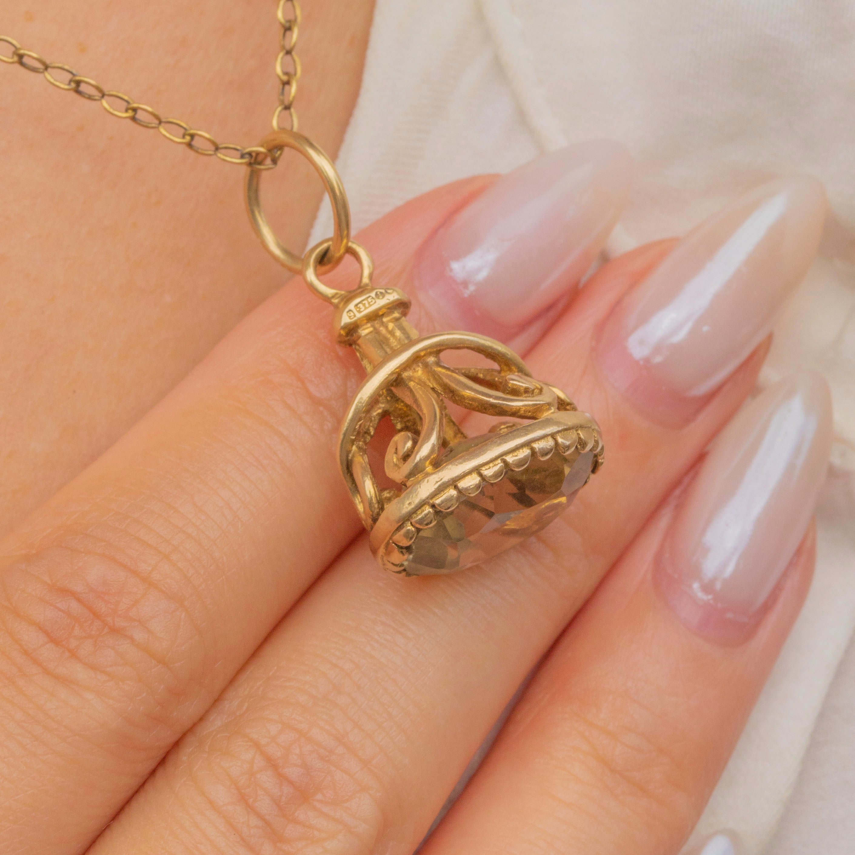 This 9ct Gold openwork fob is home to a 5.80ct sunny Citrine. Citrine is beloved for its positive healing properties, and set into a 9ct Gold openwork fob design, this Victorian-inspired pendant will look gorgeous affixed to a Gold chain!