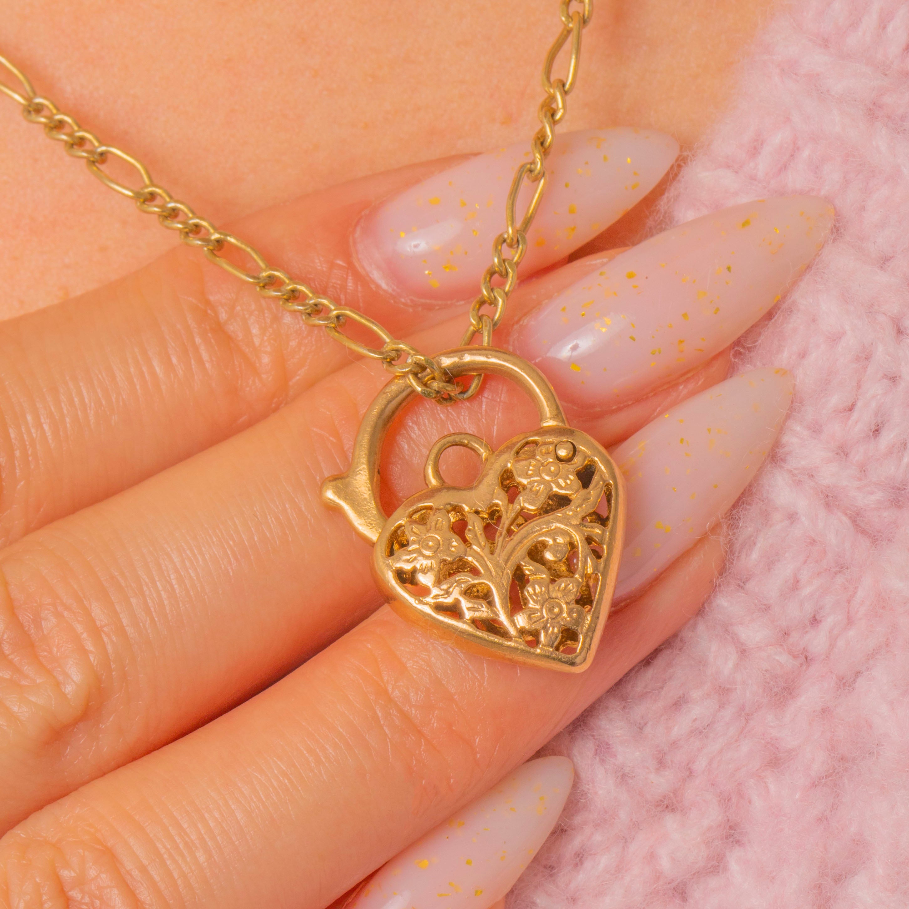 VERY GOOD. The Gold is radiant with a high-shine polish, and the engraved details have remained crisp. Aside from some dings to the padlock lever, this 9ct Gold heart padlock has little wear, only some surface wear commensurate with age on either side. The lever is in perfect working condition, allowing you to wear it with utmost confidence!