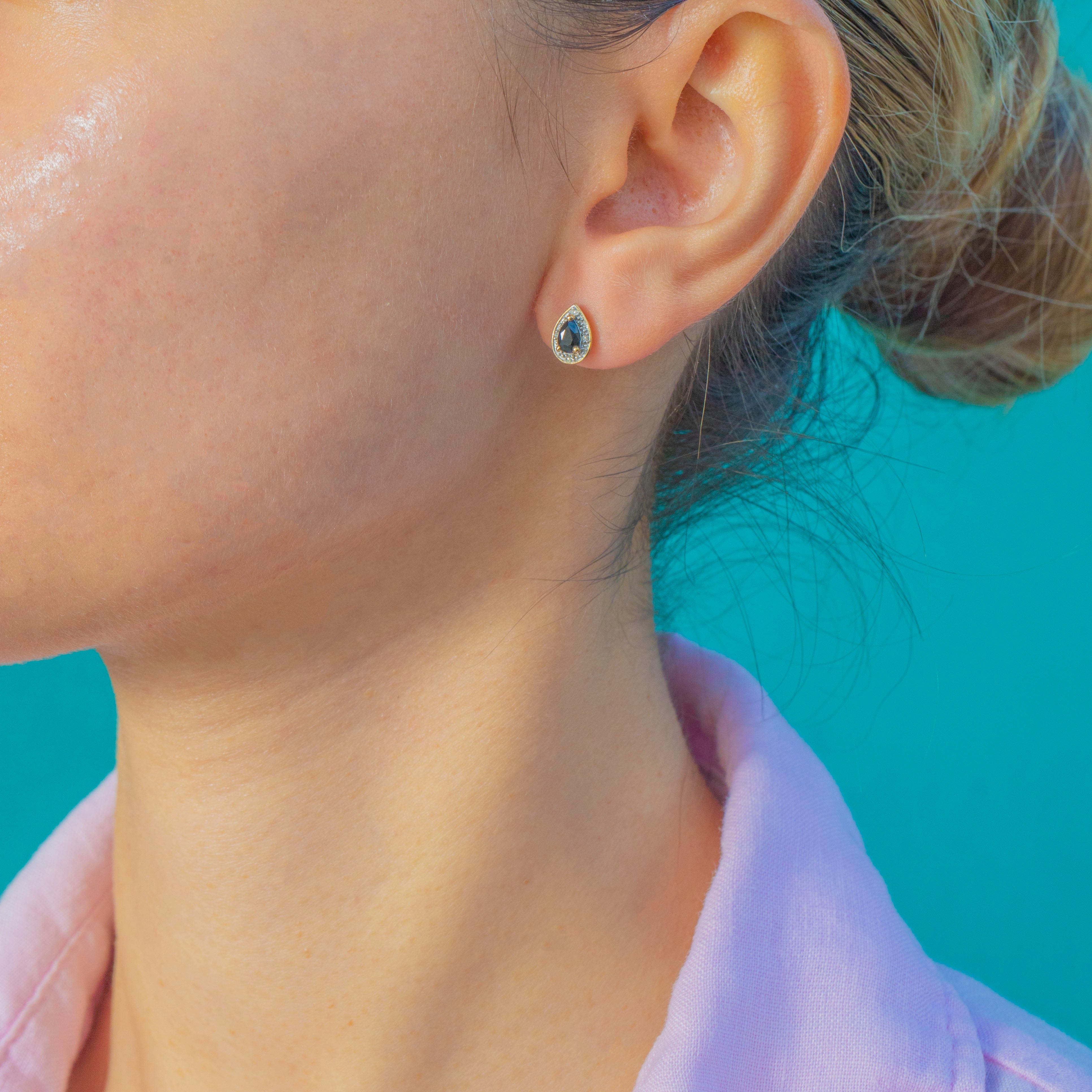 A chic pair of late 20th century pear-shaped Sapphire and Diamond studs crafted in 9ct Yellow Gold, with White Gold settings around the Diamonds for added brightness. Each earring centres on a royal blue natural Sapphire in an elegant pear cut, framed by a sparkling Diamond halo for a refined, timeless look.