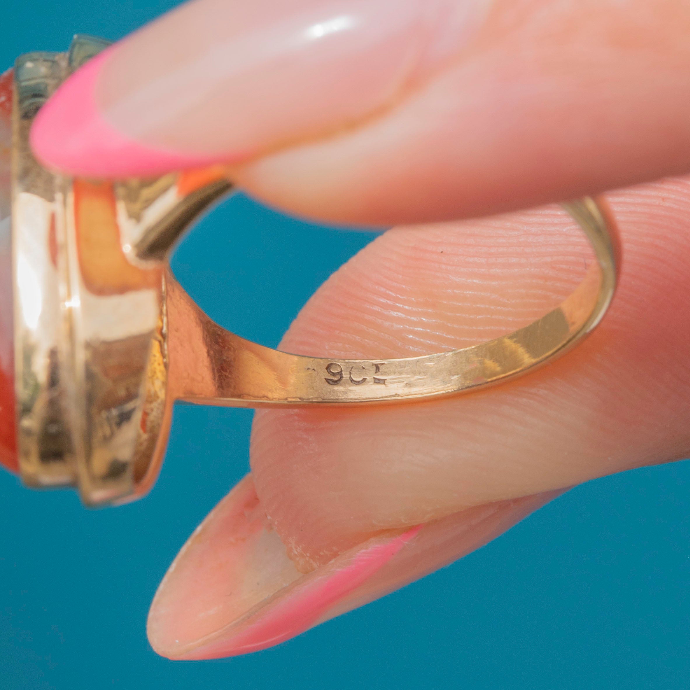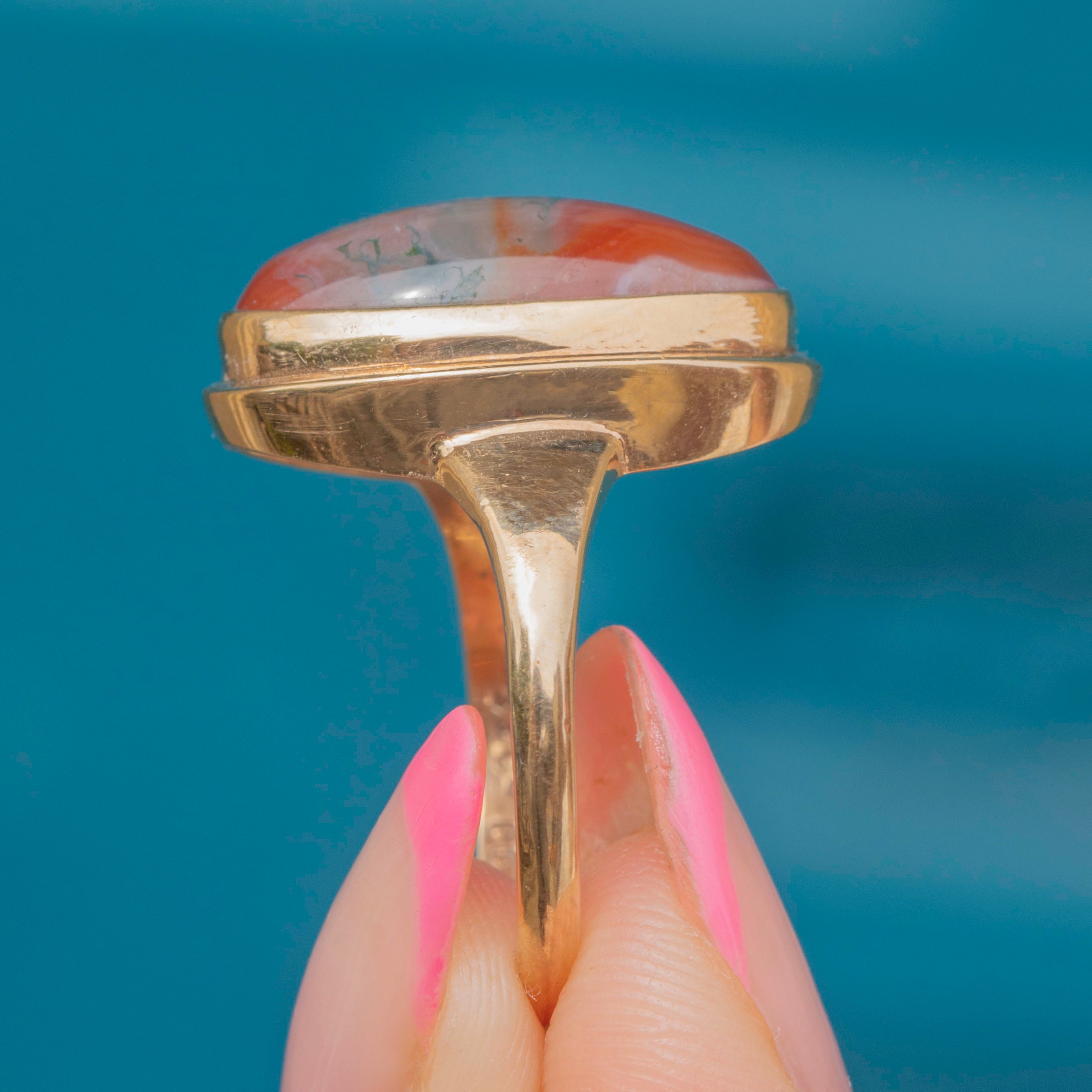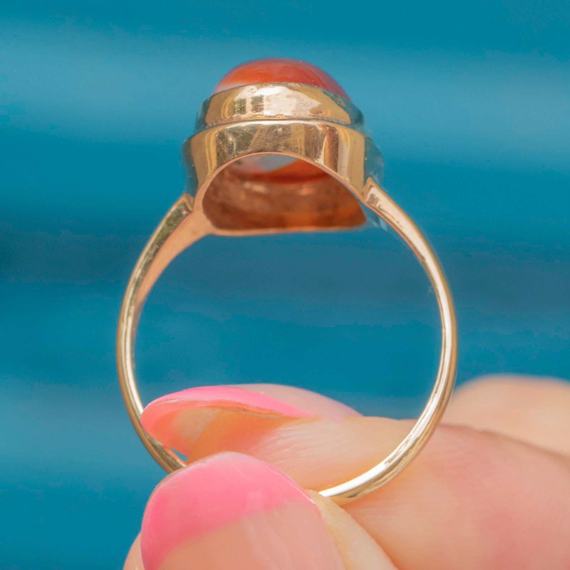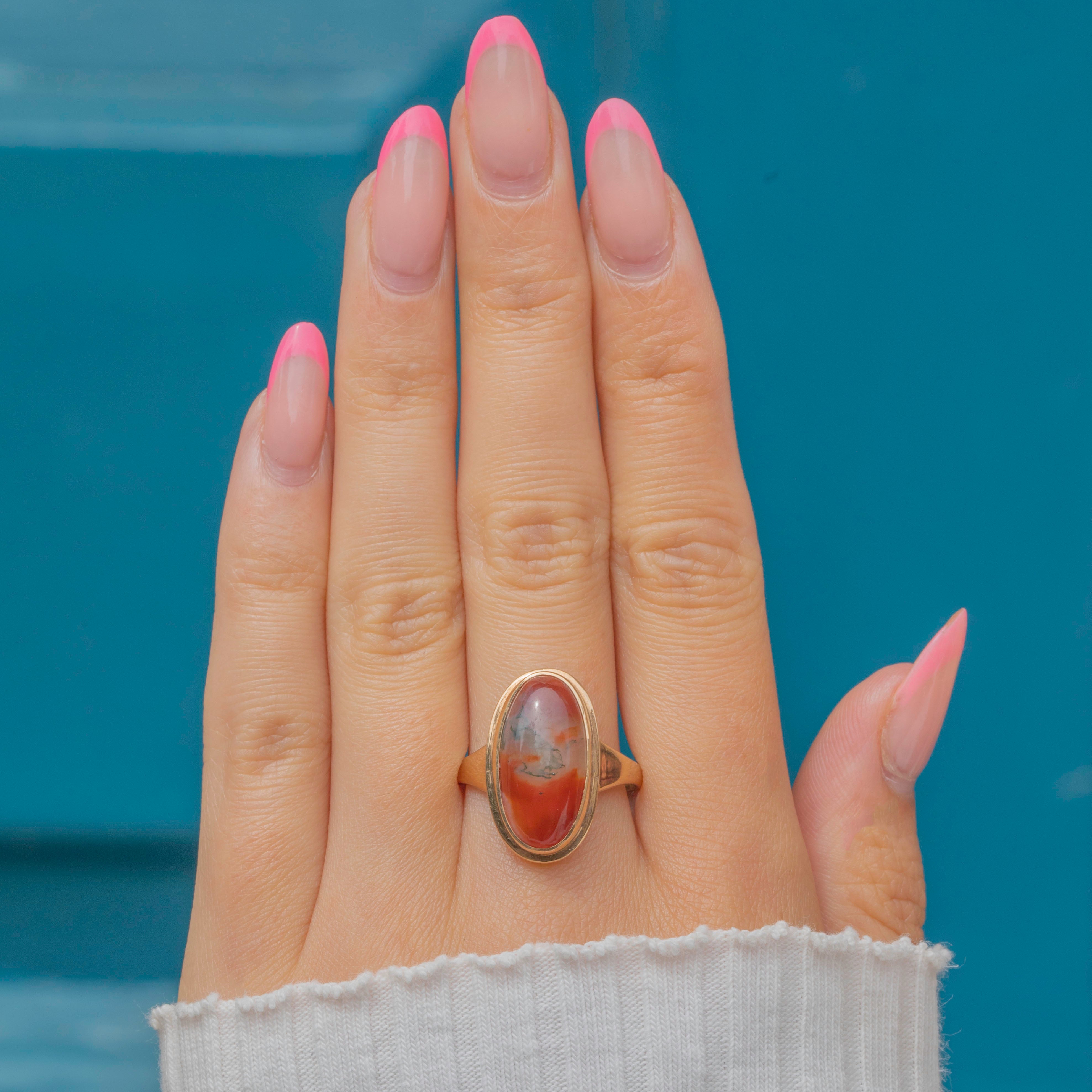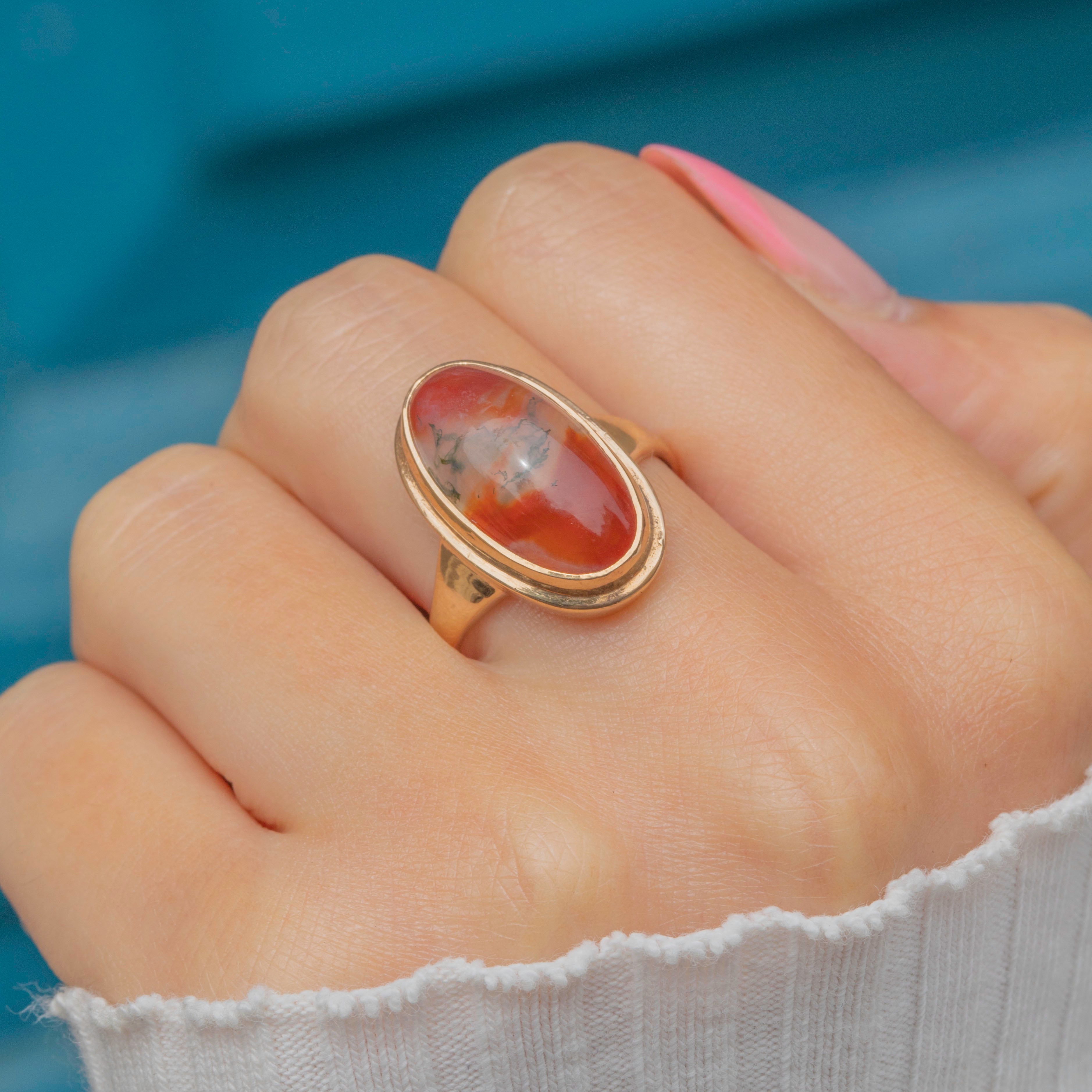 EXCELLENT: This 9ct Gold Red Moss Agate oval ring is in wonderful condition throughout! Her Red moss Agate is mesmerising, with her veins running through the entirety of her stone, having retained their deep red hue. Her Gold is glossy throughout and the ring has kept her structural integrity. You will never tire of looking at this vintage beauty!