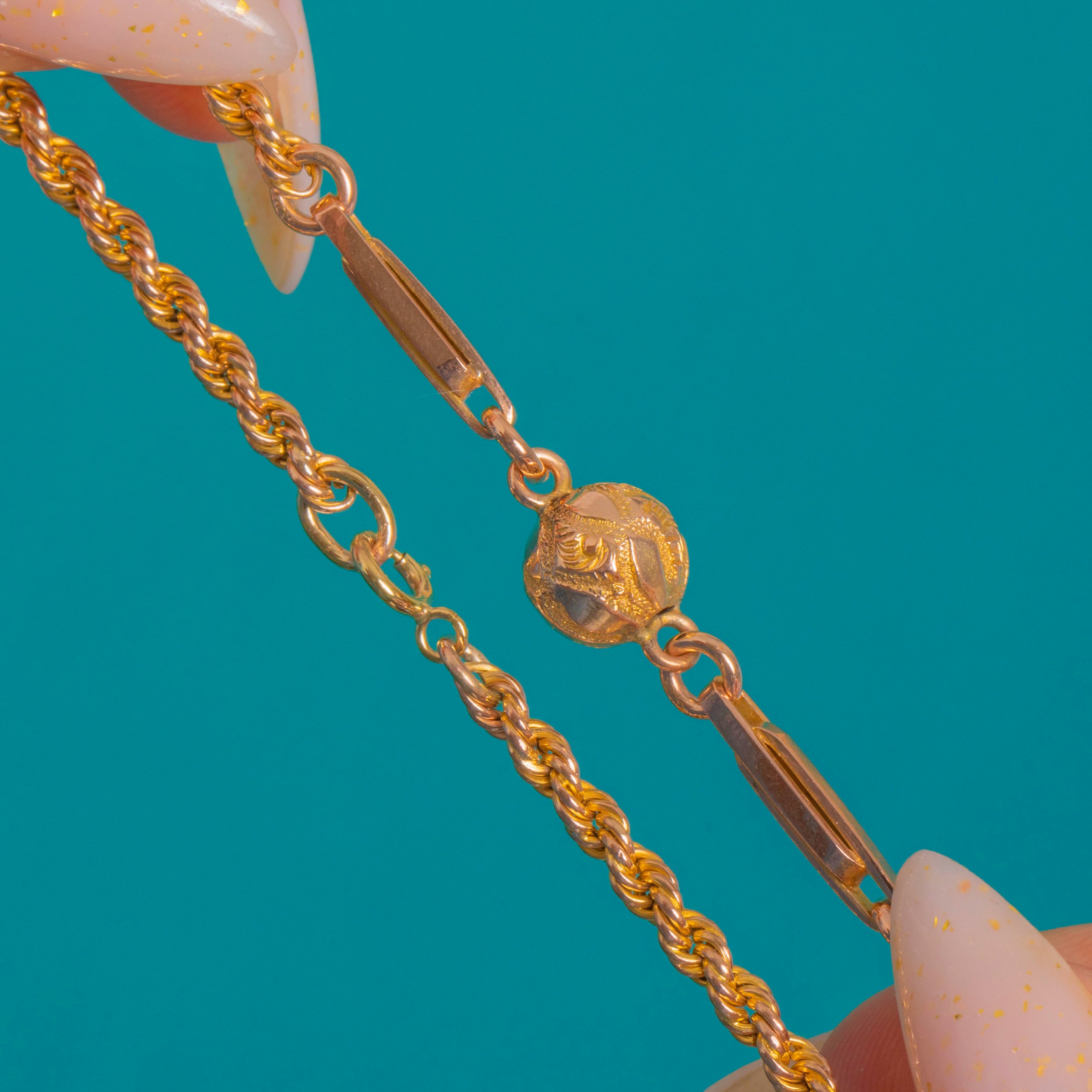 Elegant and refined, this Victorian 9ct Gold bracelet marries a fine rope chain with sleek fetter-style bar links, united by a petite openwork orb enriched with engraved foliate details. The asymmetric pairing of textures creates a beautiful play of light, while the central sphere lends a subtle Etruscan Revival flourish.
