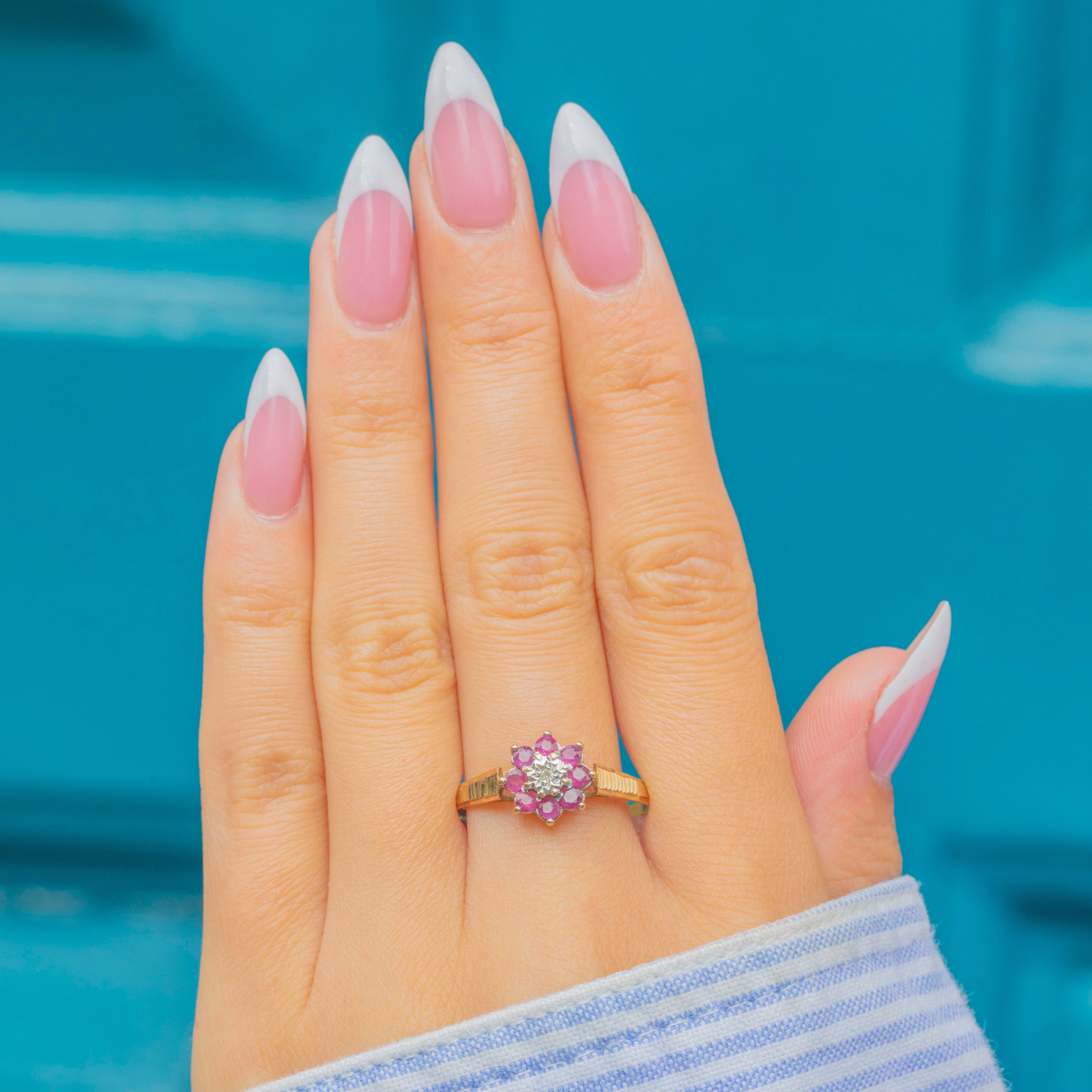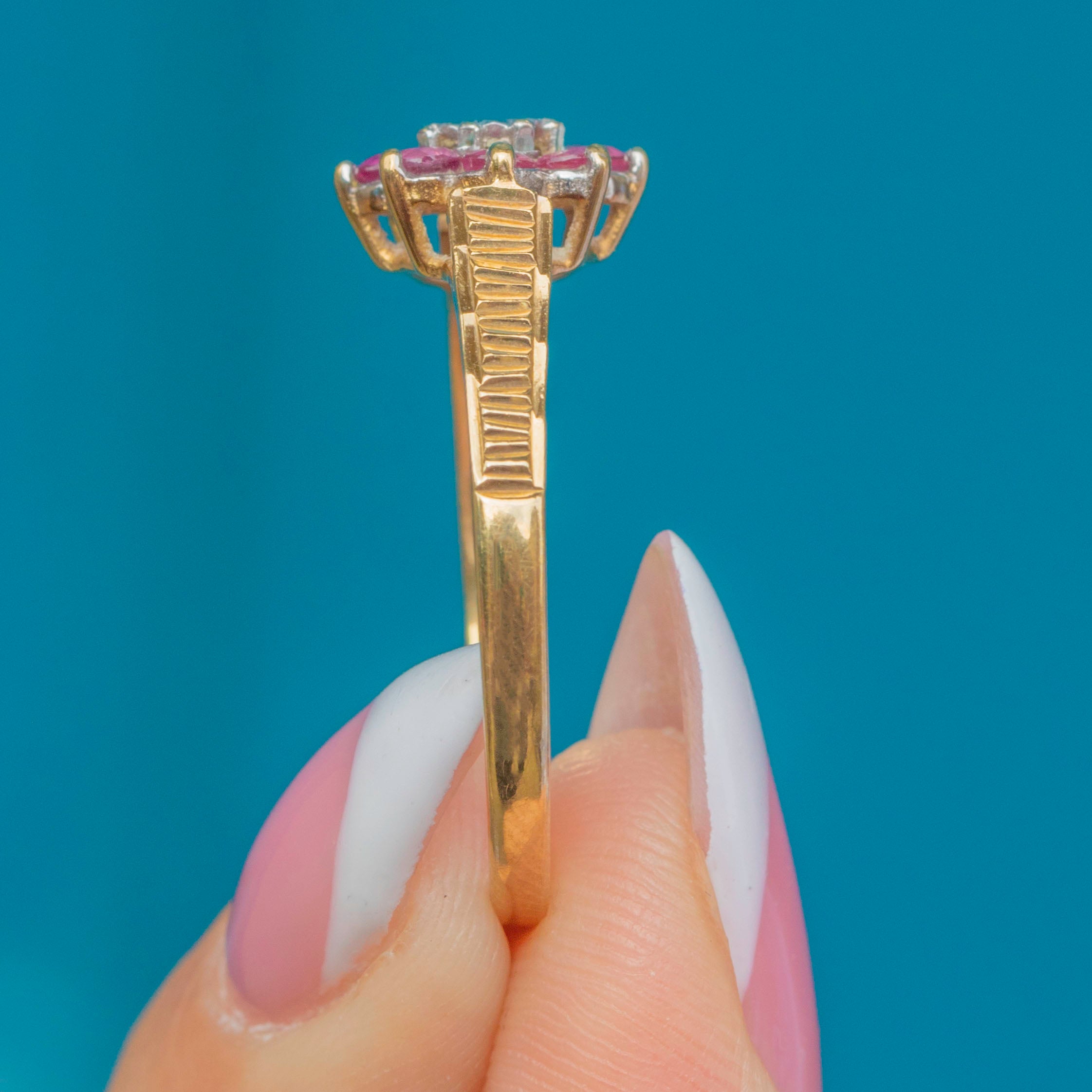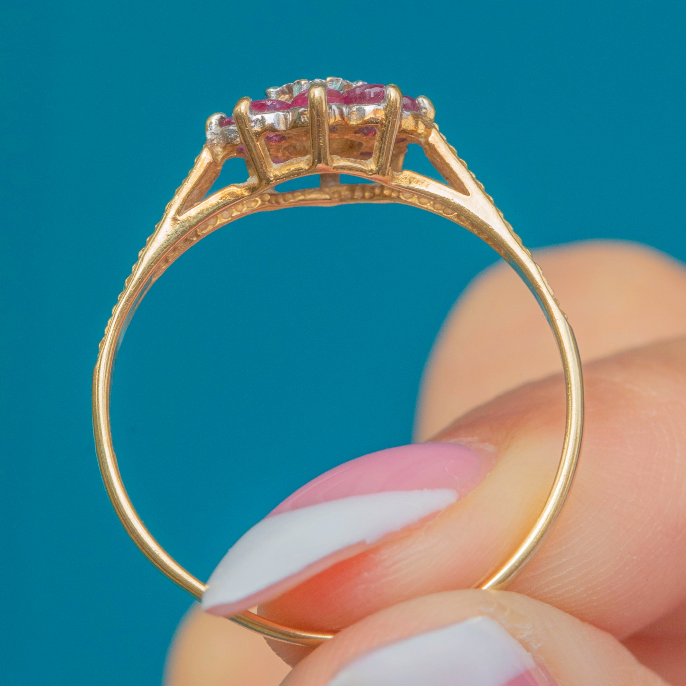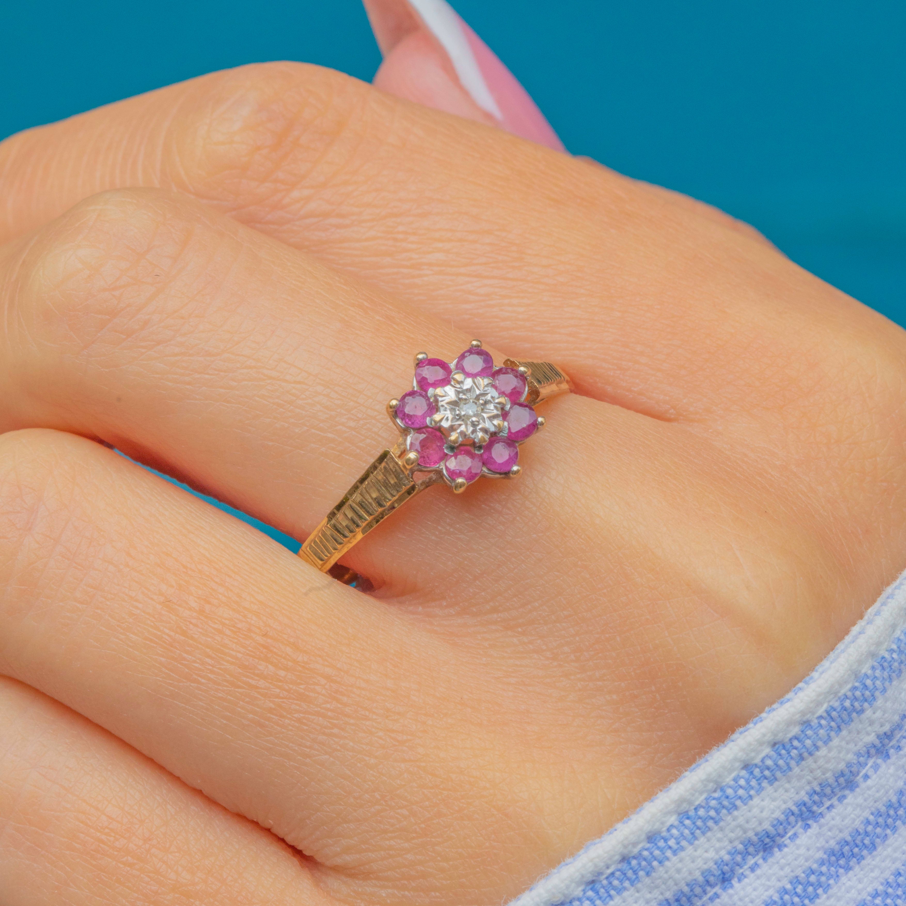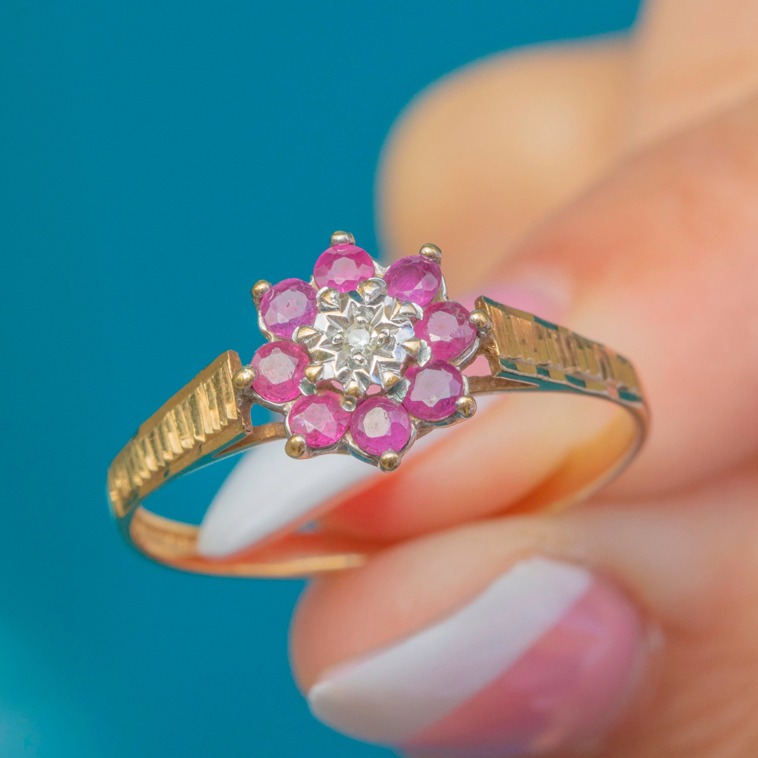 This Vintage 9ct Gold cluster ring features a vibrant arrangement of round-cut Rubies encircling a central sparkling Diamond, forming a charming floral motif. The gemstones are set in secure claws, with the Diamond elevated slightly to catch the light beautifully. The shoulders are adorned with stepped, engraved detailing, adding a touch of texture to the warm Gold band.