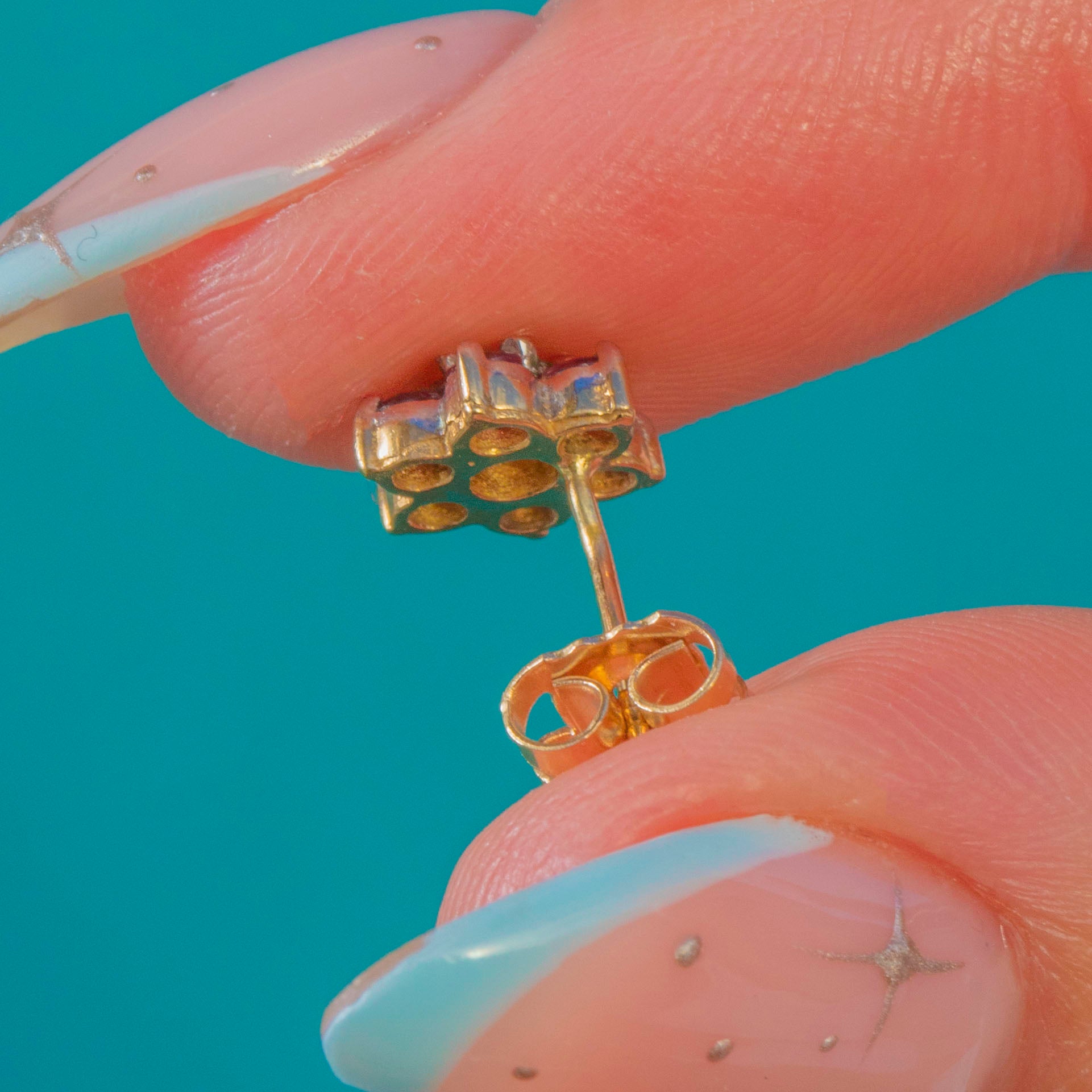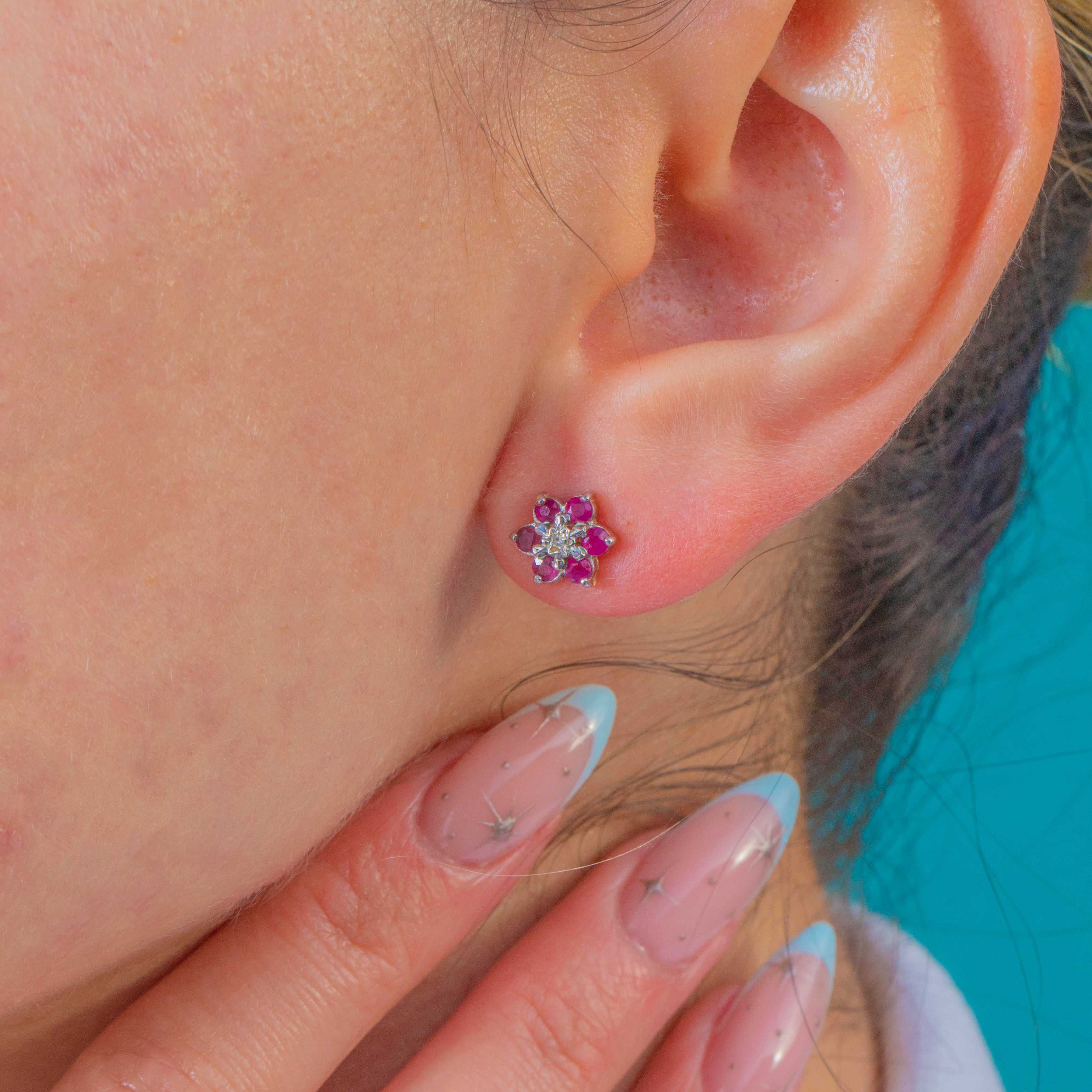 Sweet and sparkling, these 20th-century Vintage Ruby and Diamond cluster studs are a timeless pop of colour for every day. The crisp rosettes glow with vivid pink-red Rubies, punctuated by a twinkle of Diamonds at the centre for a fresh, lively sparkle.