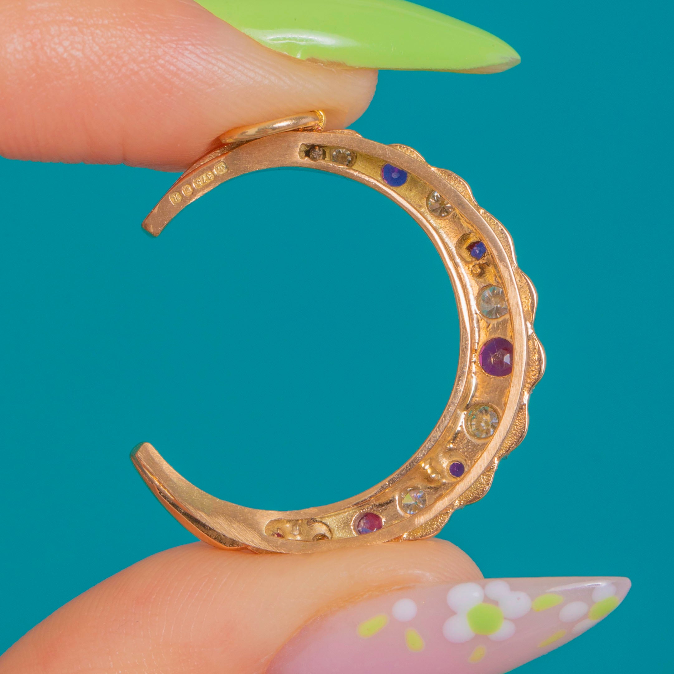 Fully hallmarked for London 1982, this charming moon is as collectible as it is wearable. With approximately 0.40ct of Rubies and 0.12ct of Diamonds, it brings a refined pop of colour and scintillation, ready to thread onto your favourite chain and layer with ease.